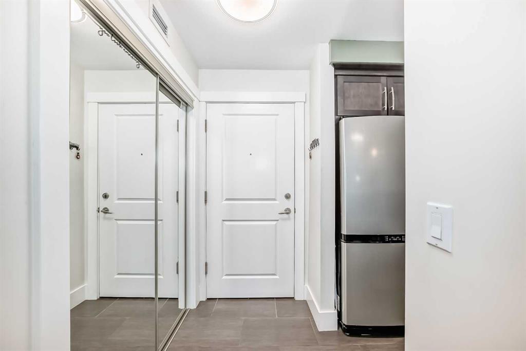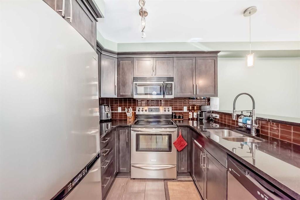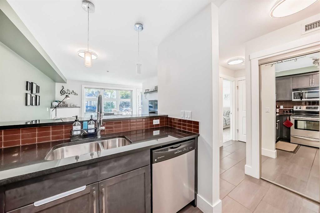 Live the Renfrew lifestyle with something rare: your own private street entrance plus a sunny east-facing patio with gas line—perfect for morning coffee and summer BBQs. Inside, this bright 582 sq.ft. main-floor condo at Adora features in-floor heat, floor-to-ceiling windows, and a sleek kitchen with granite counters, maple cabinetry, stainless appliances, and a handy breakfast bar. The bedroom offers a double closet + office nook, and you’ll love the modern 4-pc bath, in-suite laundry, and Hunter Douglas blinds. Parking and storage are covered with a covered stall (#1) and assigned locker (#2). The building adds a rooftop patio with downtown views and elevator. Walk to Bow River pathways, Bridgeland cafés, parks, the Zoo, and transit—minutes to downtown. Ideal first home or turnkey rental. Move-in ready and easy to show—book your viewing today!