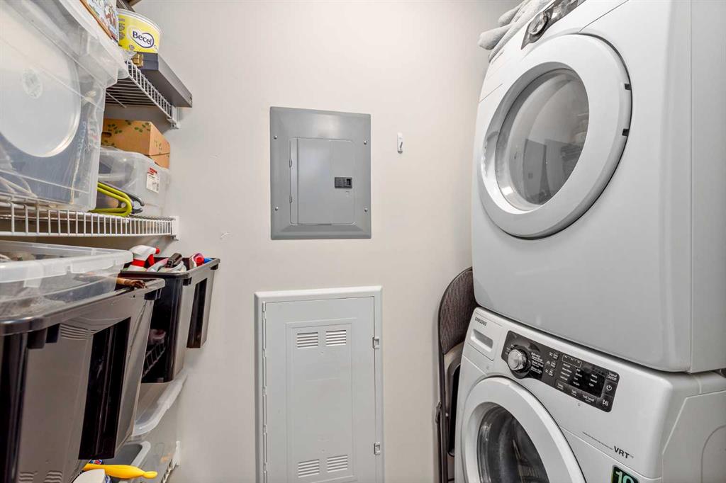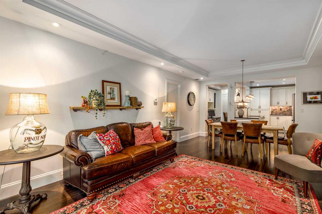 For the busy professional or the retired individual desiring the lock and go lifestyle, here is your solution. A ground floor, one bedroom, one bath, well-constructed 837 sq. ft. apartment in the notable and unique Quarry Park area. The private entry conveys you into the foyer where you will immediately note the efficient planning throughout. To the right is the in-suite laundry room along with ample closet space. The flooring is wide-plank warm hardwood and colors are neutral contributing to a feeling of space and calm. The kitchen features tasteful and plentiful white cabinetry, gleaming quartz countertops, tiled backsplash, a gas range with five-burner cooktop, stainless appliances, an island/breakfast bar with built-in microwave and deep double under counter mounted sink. Adjacent to the island is an ideal set up for your computer/office space. Moving into the open area dining room/living room notice the high tray ceilings and the amount of natural light flowing in from the south-facing patio doors. The bedroom is carpeted, has a substantial walk-in closet and a walk-through four-piece tiled bath. The substantial patio is your extra room to enjoy summer entertaining with a convenient gas hookup for BBQ. Additional conveniences include central air, a titled underground heated parking stall, a titled storage locker, car wash, bike room and visitor parking plus common area maintenance. Location is key being close to Deerfoot, Glenmore and Stoney Trails, Sue Higgins Park, the Bow River, Willow Park Golf & Country Club, shopping at nearby South Centre Mall, Calgary Farmers’ Market South, Ikea and Walmart Supercentre.