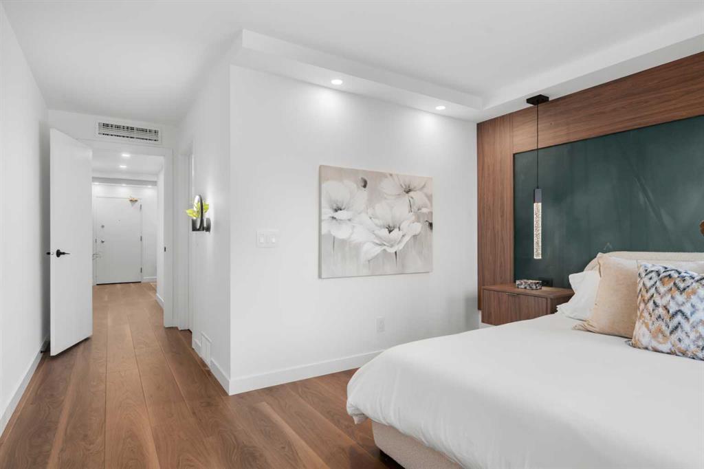 The upper level continues with a layout that balances privacy, comfort, and functionality. The principal bedroom is a refined sanctuary, featuring a custom-designed feature wall, built-in side tables, a generous walk-in closet, and a beautifully finished ensuite with porcelain surfaces. Step out onto your private balcony for morning coffee or an evening unwind, all while taking in serene views of the Elbow River and the treed streets of Rideau. The second bedroom, also positioned to capture river views, includes integrated custom cabinetry designed to optimize storage and space. A full bathroom is conveniently located across the hall, and the upper level is further enhanced by a well-placed laundry area, offering convenience and efficiency.