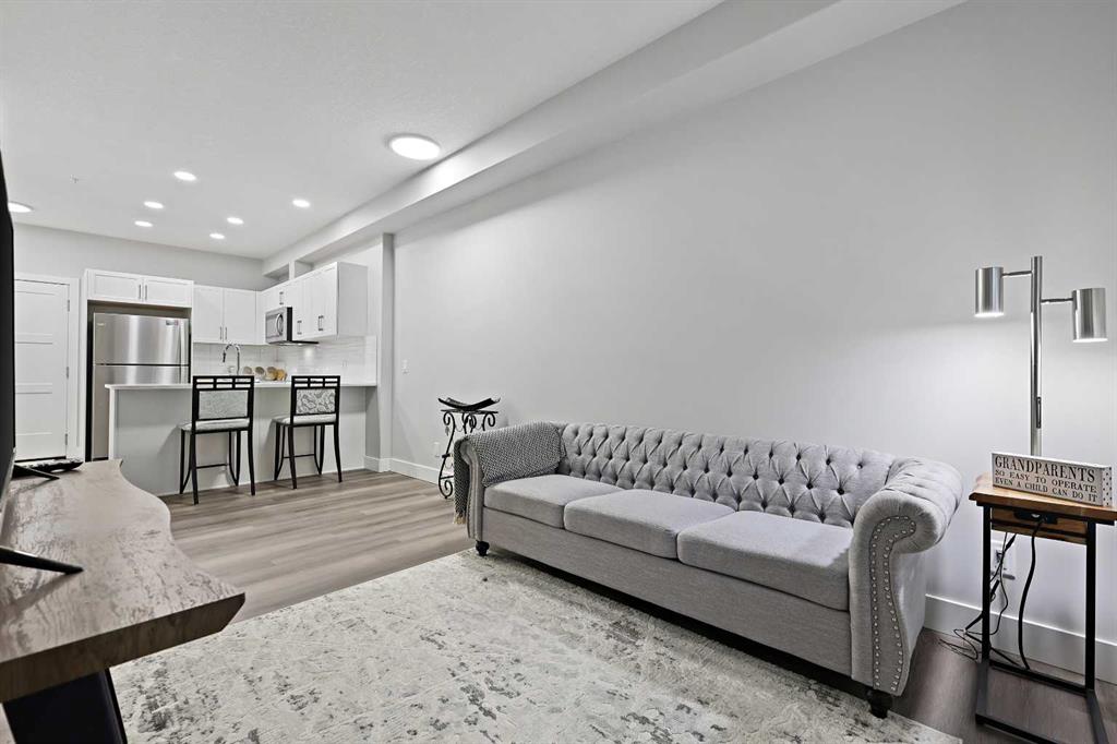 Welcome to this beautiful 1 bedroom, 1 bathroom luxury condo located in the highly sought-after community of Springbank Hill. This Cove Properties built condo is designed with both style and functionality in mind offering a bright open layout and high-quality finishes throughout. Step inside to warm luxury vinyl plank flooring that flows through the main living areas. The contemporary kitchen is as functional as it is stylish, featuring quartz countertops, crisp white cabinetry, stainless steel appliances, and ample workspace. A designated laundry room and additional storage add everyday convenience. The spacious primary bedroom is complemented by a walk-in closet with direct access to the elegant 4-piece bathroom, complete with a cheater door for added privacy and ease of use. Enjoy the outdoors on your massive ground-floor patio with a gas line, perfect for barbecuing and entertaining. This unit also comes with a titled underground parking stall and an additional storage locker. Set in an unbeatable location, you’ll appreciate being close to shopping, transit, schools, and all the amenities that make Springbank Hill such a desirable place to live.