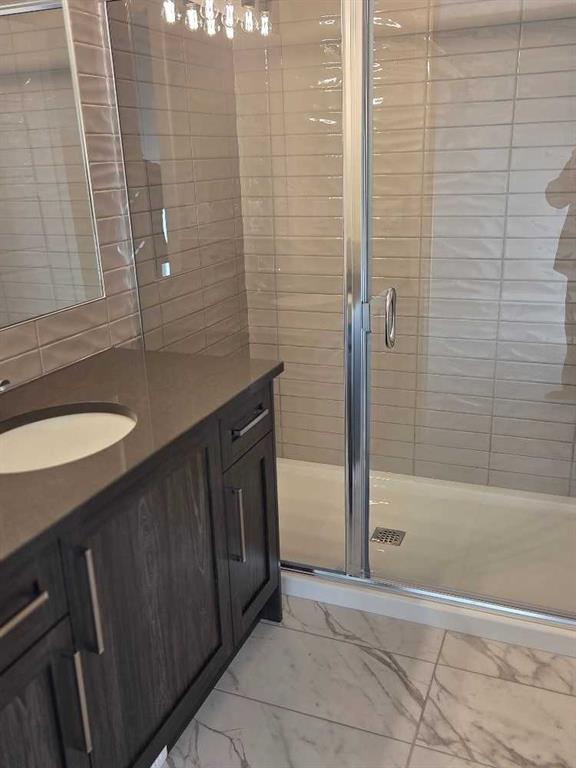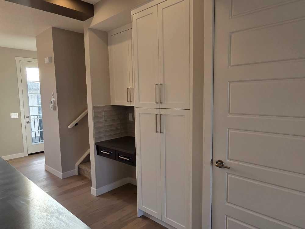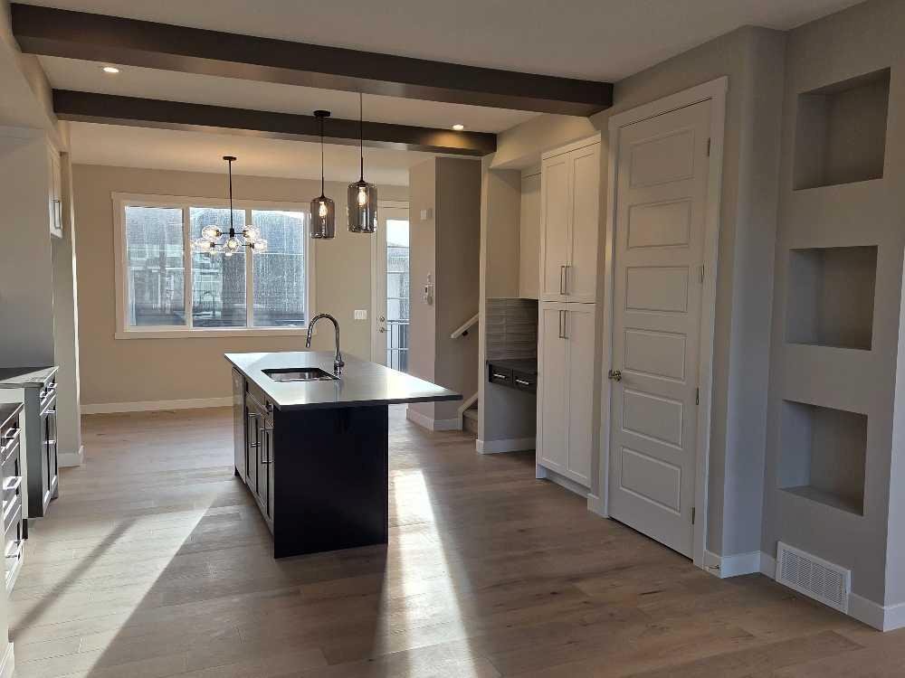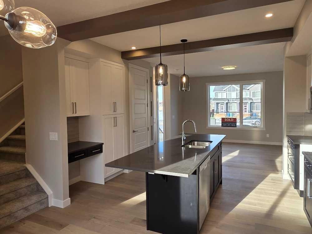 IMMEDIATE POSSESSION, END UNIT, SIDE ENTRY TO BASEMENT. DOUBLE DETACHED GARAGE, DECK, FENCED AND LANDSCAPED, NO CONDO FEES. Welcome to the “St. Andrews” townhome, by Award winning, Master Builder, Douglas Homes Ltd. From the front covered porch, the entry opens onto the spacious great room with 9ft ceiling and gleaming hardwood floors throughout the main floor. The aspiring chef will appreciate the well planned “island” kitchen. From the upgraded 42 inch, soft close cabinets, to the gorgeous quartz countertops, everything is within easy reach. The sparkling stainless steel fridge, the glass top, self cleaning electric range, dishwasher, and over the range microwave/hoodfan are all just an arms length from the kitchen sink. Opposite side of the island, provides a convenient pantry, and desk with upper cabinet for all those recipe books you will collect. The spacious dining area features a large picture window looking out upon the back yard with room for the kids to play, with a rear entry door to the deck for those summer bbq’s. Here also is a 2pc powder room for your guests convenience, and perhaps the kids hurried need. Upstairs includes 2 good sized secondary bedrooms, a 4pce bathroom with quartz vanity and tile floors, a convenient upstairs laundry, and a spacious primary bedroom with large upsized window and ensuite bath, with walk in shower, with glass front, tile floor and again a quartz vanity. The full basement provides rough in plumbing for a future bath, one window for future bedroom, and enough space remaining for a spacious future family room if you decide your family needs room to spread. All this in the desirable new subdivision Cobblestone Creek, with tennis courts, playgrounds, future school reserve, pathways and numerous green spaces, on the western edge of Airdrie, with wide open country side, and views to the west. THIS HOMES SIDES ONTO GREEN AREA.