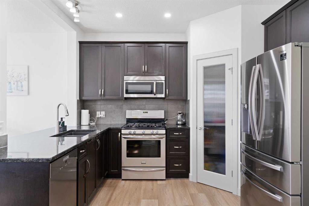 The Icon floor plan combines style and functionality, featuring a main-floor flex room or bedroom with a full bathroom—perfect for guests or multigenerational living. The gourmet kitchen is equipped with granite countertops, a gas stove, and a spacious corner pantry, opening seamlessly to the dining and living areas—ideal for family gatherings and entertaining. Step outside to the south-facing deck with gas BBQ hookup and enjoy your private garden retreat.