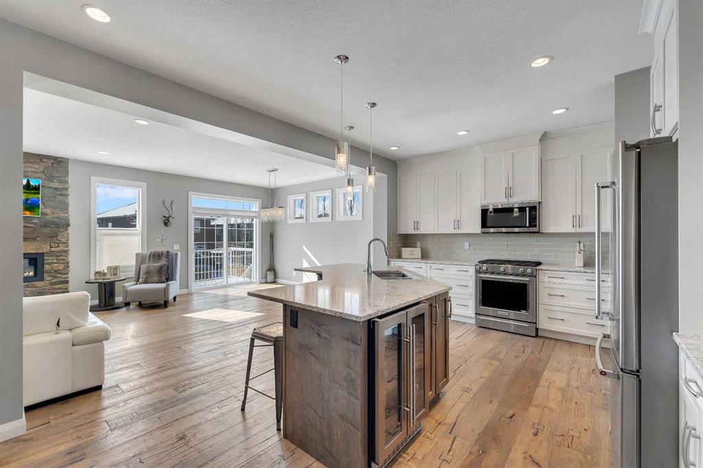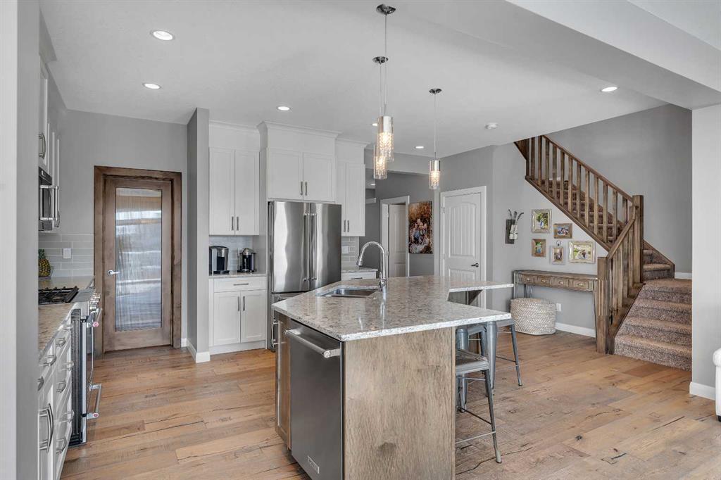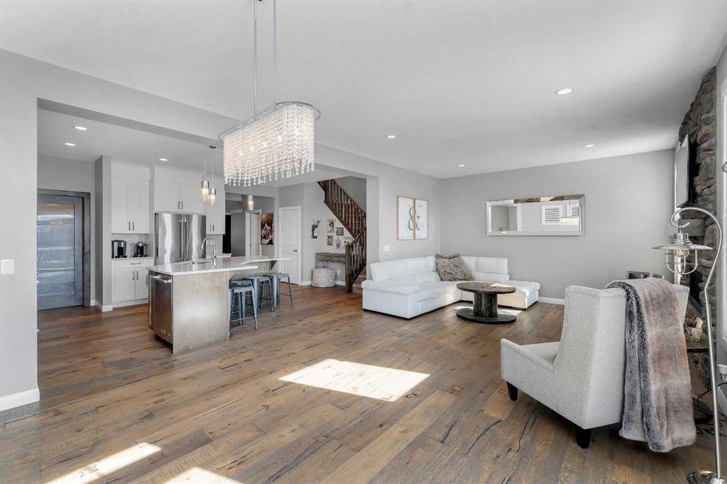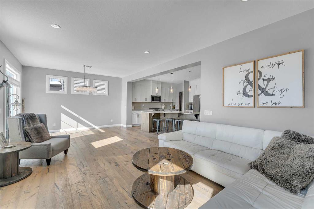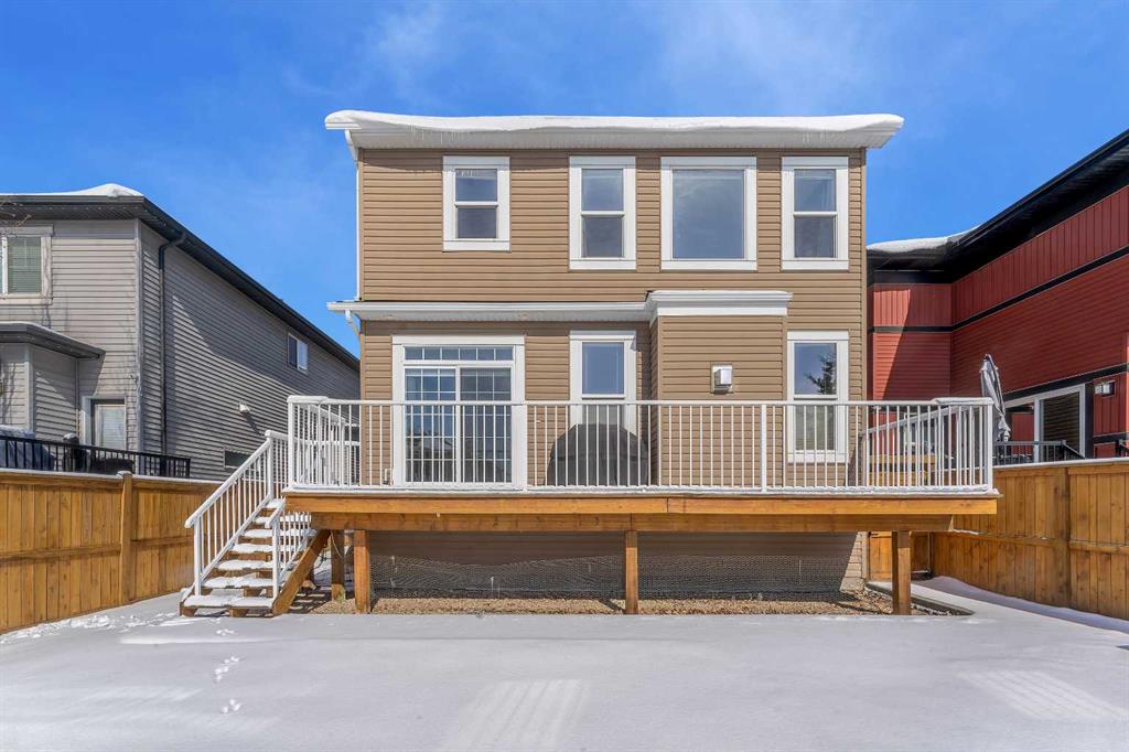 Welcome Home! This 2 story residence has so much to offer and features: 3,400+sq ft fully finished space w/ 5 bed, 3.5 bath + bonus | backing walking path + steps to rubber floor park | upgraded interior specifications | massive rear deck + landscaped | and so much more! All located in the developed Airdrie community ‘Ravenswood’ – with schools, amenities, access to major highways, green spaces & more making it perfect for growing families. Stepping inside you’ll immediately notice the pride of ownership in this home. With the gleaming hardwood floors leading you throughout the main floor which offers living room, dining, large kitchen, walk thru pantry, mud room w/ built ins, and half bath. The kitchen features: beautiful white cabinets, granite countertops, large island with eating bar, plenty of storage space, SS appliances, walk thru pantry to mud room (perfect for bringing groceries home), cabinet to ceiling and more. Living room features a stunning stone fireplace, that extends to the ceiling giving the home a grand look. The main floor interior is sunlit with large windows, including sliding glass patio doors. Along with the high ceilings, this leaves the main floor feeling bright, airy and spacious – perfect for entertaining or the day to day life with the kids! Head upstairs to land in the large bonus room. Along with that, there are FOUR bedrooms upstairs! With the master being a great size with views of the green area behind the home being something that makes day to day living here that much more special. The master ensuite has everything you need and features: double vanity, toilet, stand alone tub, walk in shower. Along with that, you also have a large walk thru closet that leads to the upper laundry room – a well thought out layout by the builder! The basement is fully finished and features living space, bedroom, full bath, utility room and storage space. There is a concrete walkway on the side of home leading to poured concrete pad in the backyard. Along with that, the large deck. Most importantly, with a park the kids can play at only steps away, along with a walking path directly behind the home, this home truly checks all the boxes for what you can get in a home like this. Book your viewing today, before its gone!
