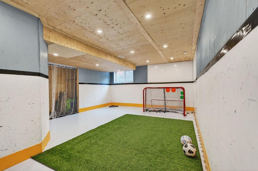 The partially finished basement includes a gym area, recreation space, finished stairs, pot lighting, and a bathroom rough-in. Additional highlights include an epoxy-coated garage floor, updated lighting, two backyard storage sheds, Custom concrete curbing accenting flower beds, Air Conditioning to keep you cool in the Summer months, walnut-stained deck with gas BBQ hookup, and permanent Lumenox exterior lighting.