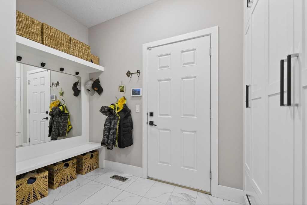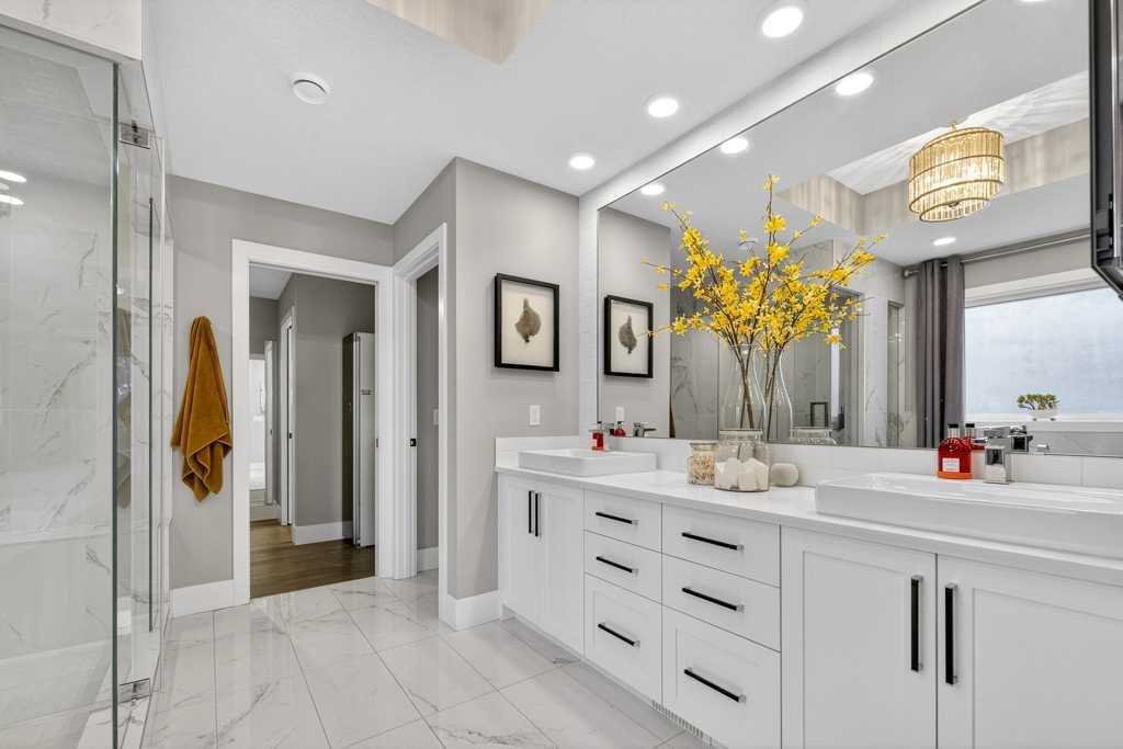 Exceptional Truman-built home offering over 4,000 sq ft of refined living space, tucked on a quiet cul-de-sac in sought-after West Springs. Stunning curb appeal with custom-coloured James Hardie siding and an exposed aggregate driveway. Inside, the home has been professionally painted throughout, with finished garage detailing, designer drapery across the home, a striking dining-room mural feature wall, and thoughtful built-ins that elevate both style and function. The main and upper levels feature engineered hardwood flooring throughout, creating a clean, elevated look. The main floor is thoughtfully designed with a private office/den, a spacious mudroom, and a walk-through pantry with convenient servery. The gourmet kitchen is a showpiece with full-height custom cabinetry, quartz countertops, upgraded gas stove, and new refrigerator and dishwasher.
