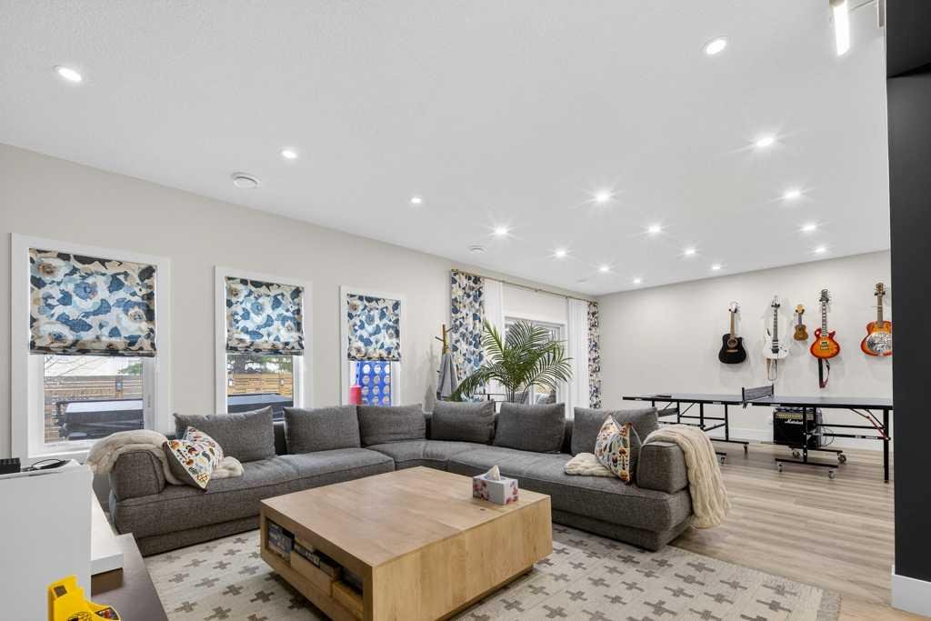 Upstairs, a sunken bonus room creates the perfect retreat, complemented by two generous secondary bedrooms and a full 4-piece bath. The spacious primary suite is a true escape with a spa-inspired ensuite featuring dual vanities and an oversized custom-tiled shower. The laundry area includes a new washer and dryer plus an LG Styler steam clothing care system for next-level convenience. The professionally developed basement—designed with interior designer guidance—delivers a true lifestyle upgrade with a dedicated custom gym, soundproofed areas, and separate thermostat-controlled zones for the bedroom and main living space, finished with durable laminate flooring.