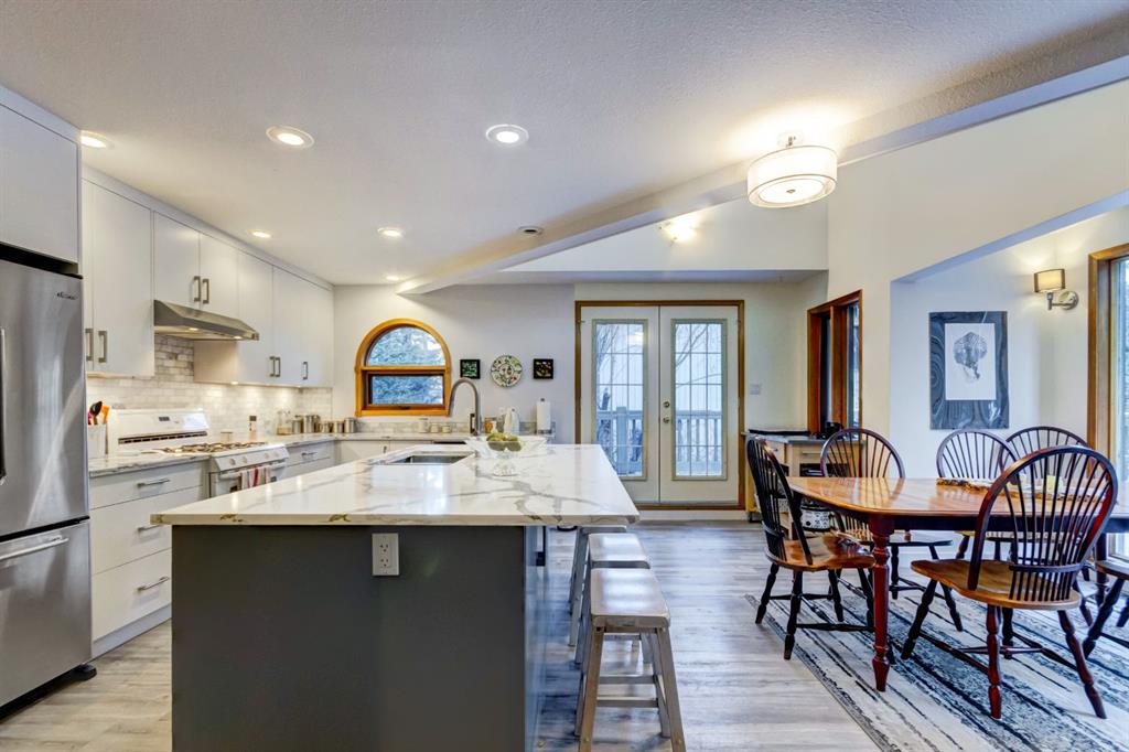 Single family home in the heart of Rundleview. Situated in one of Canmore’s most sought-after neighbourhoods, this beautifully updated home offers four bedrooms, three bathrooms. A welcoming foyer leads into a bright, open kitchen that flows seamlessly into the dining room, where a wall of oversized windows brings in natural light and opens onto a generous outdoor deck. The inviting living room features a cozy fireplace, this level also includes a convenient bedroom and full bathroom – ideal for guests or home office needs. Upstairs, the primary suite is complemented by an additional bedroom, full bathroom and ample storage options. The fully developed lower level includes its own kitchen, creating the perfect setup for guests or roommates. The attached garage features a single door with the footprint of a double. Set on a spacious, private lot, this home blends character, comfort and practicality. With immediate access to world-class outdoor recreation – including the Canmore Nordic Centre and Quarry Lake.