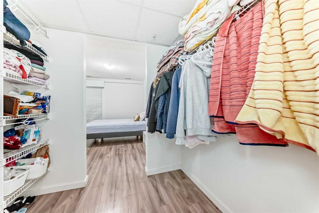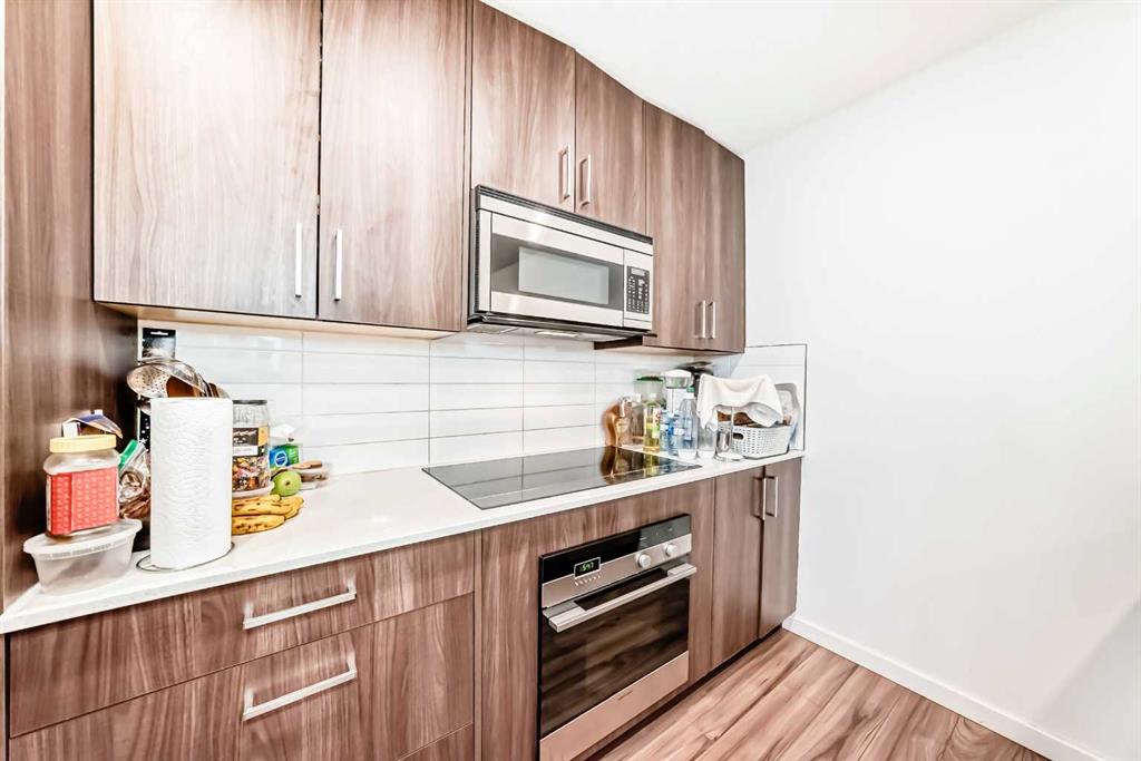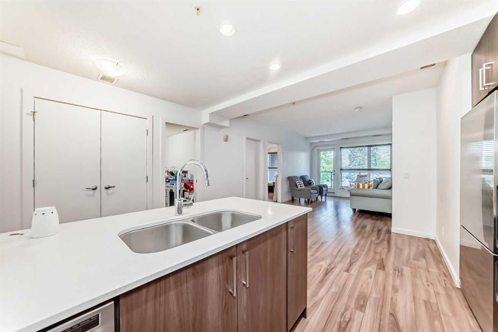 CONCRETE AND STEEL FRAME CONSTRUCTION offering superior noise reduction, reduced insurance costs, and exceptional durability. The building features high-efficiency boilers and HRV systems, with geothermal heating and cooling throughout. Equipped with Cat 5(e) wiring for advanced data and phone connectivity. This spacious 2-bedroom, 2-bathroom unit includes a den, in-suite laundry, and a titled underground parking stall. Designed with modern finishes, the interior boasts wide plank laminate flooring, bright polished white quartz countertops, and premium European-designed Fisher & Paykel appliances, including a dishwasher, induction cooktop, and convection microwave/hood fan combo. Stackable Whirlpool laundry machines are included, and the refrigerator is equipped with a microprocessor that monitors usage to extend food freshness. The primary suite features a walk-in closet and a full ensuite. Ideally located just steps from the C-Train station, shopping, and minutes from Westhills and downtown. Currently tenant occupied on a month-to-month basis—24 hours’ notice required for showings.