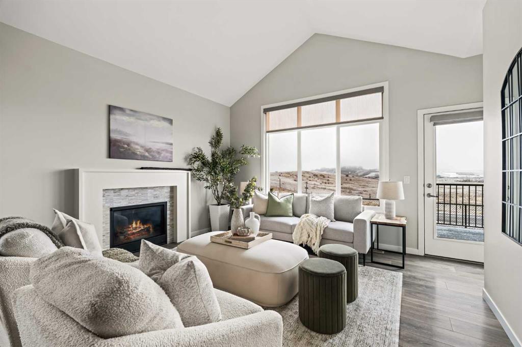 This beautifully maintained original-owner bungalow villa offers the perfect blend of elevated design and effortless living – ideal for downsizers, snowbirds, or anyone seeking a lock-and-leave lifestyle without compromise. Tucked into a quiet, small-town setting with no neighbours behind, this corner unit home delivers exceptional privacy and a peaceful backdrop, best enjoyed from the sunny south-facing backyard with viewings overlooking the pasture. Featuring 2 living areas, 3 bedrooms, 2.5 bathrooms and over 2,300 sq. ft. of developed living space, this property ensures you can easily host family and friends while creating the lifestyle you’re looking for. Inside, vaulted ceilings and resilient laminate flooring create a bright, airy atmosphere throughout the main level. The open-concept design is anchored by a stylish, timeless white kitchen featuring quartz countertops, a subway tile backsplash and a suite of stainless steel appliances. A large central island provides additional dining and prep space and a large pantry ensures ample storage. The kitchen seamlessly connects to the dining area and inviting living room making this the perfect space for entertaining. The expansive main living space is anchored by a central gas fireplace with a tile surround and mantle and a wall of south-facing windows provides breathtaking views all year long. The large primary suite spans ~13’x13′, offering ample space for a full bedroom suite and unobstructed views overlooking the green space behind. The primary suite includes a private ensuite featuring dual sinks, a walk-in shower, a private water closet, and a walk-in closet. The main level is complete with a conveniently located laundry room and a two-piece powder room, ensuring you can enjoy single-level living every day. The professionally developed lower level greets you with an expansive ~13’x26′ recreation room that has ample space for a TV-area, home gym and games area – the options are endless! The lower level includes two bedrooms, a full bathroom, and ample storage. This home has brand-new carpet throughout and has been freshly painted, making it fully move-in ready! Completing the home is a private double attached garage that enhances both convenience and lifestyle – offering secure access, additional storage, and true lock-and-leave functionality – perfect for seasonal living or travel. Situated on one of the most desirable lots in the entire development, this incredible opportunity offers optimal natural light, a large south-facing deck with views and no neighbours behind and central A/C to keep you cool all summer long. It’s perfect for those wanting to downsize without compromise. Start enjoying a maintenance-free lifestyle now in the desirable new community of Fireside, just minutes from countless amenities and a short drive to the mountains!