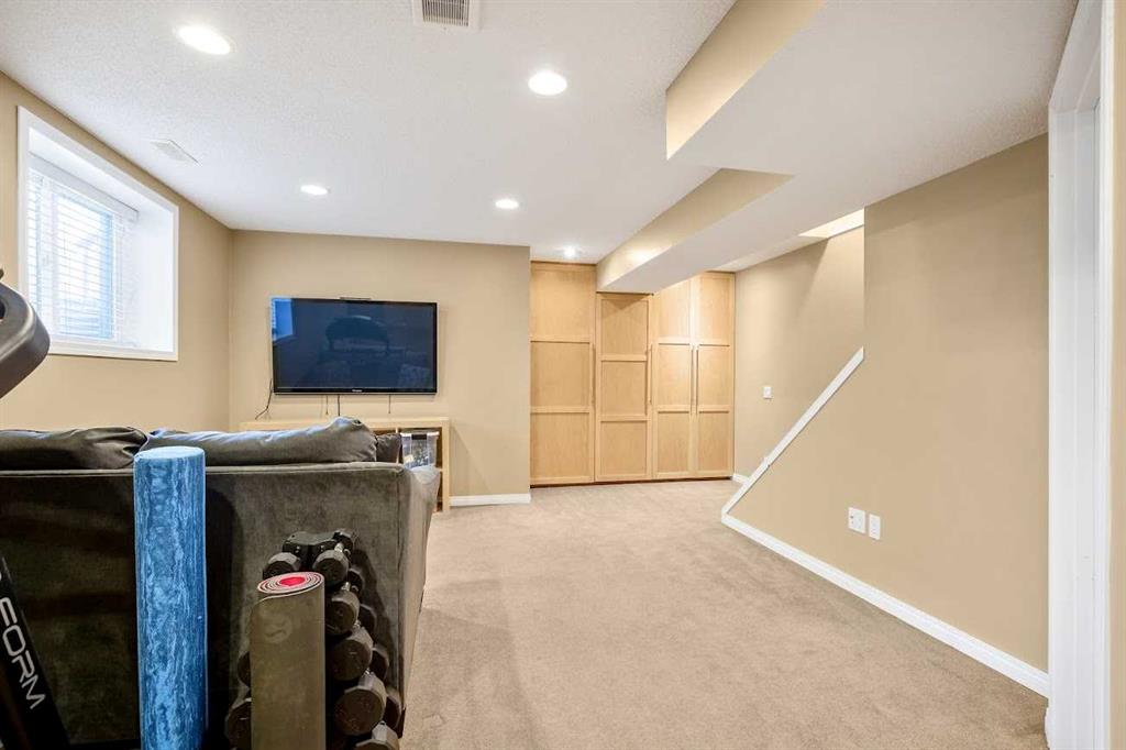 The fully developed basement expands the living space further with a fourth bedroom, a 3 piece bathroom with a beautiful tiled shower, and gorgeous custom maple built in storage cabinets, making it an excellent area for teens, guests, a home office, or a cozy family rec room.