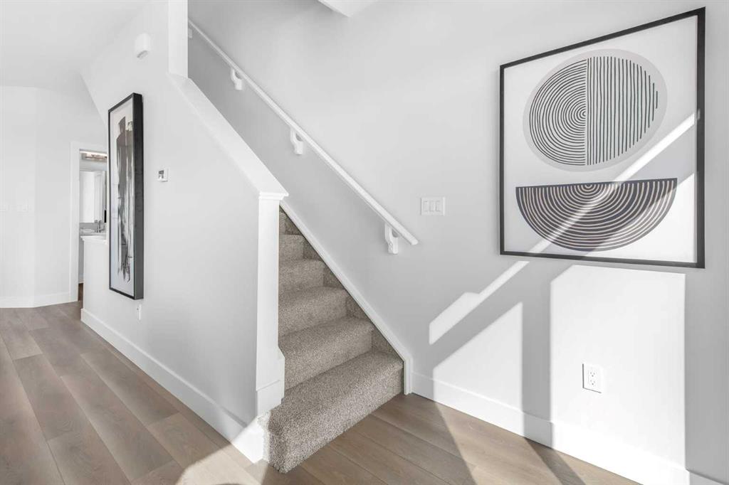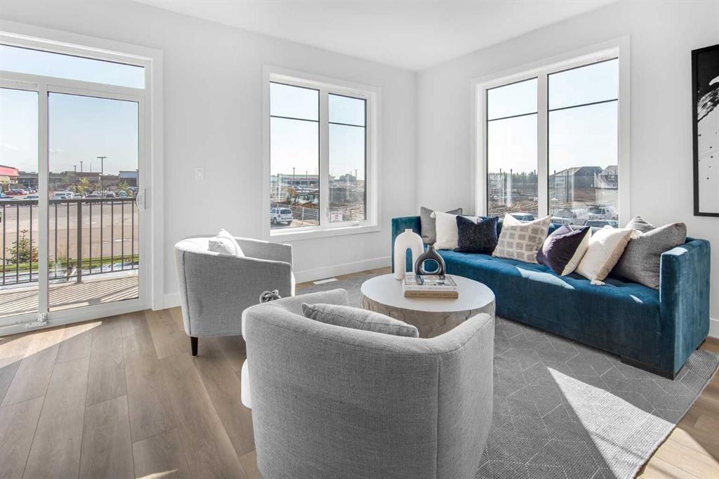 The brand new ‘Holiday’ model by Brookfield Residential is now available in the vibrant community of Seton! This brand-new townhome blends contemporary design with everyday functionality, offering over 1,400 sqft, 3 bedrooms, 2.5 bathrooms, a ground-floor flex/office space, and a private double attached garage – all in one of Calgary’s most desirable master-planned neighbourhoods. The open-concept main floor showcases a timeless kitchen featuring full-height cabinetry, elegant quartz countertops, a built-in hood fan and microwave, and a premium stainless-steel appliance package. The oversized island with pendant lighting provides the perfect place for casual dining or entertaining. The kitchen flows seamlessly into the bright living and dining areas, highlighted by a wall of windows that flood the space with natural light. Step out onto your private balcony – ideal for summer BBQs or a morning coffee. A large laundry room with additional storage and a convenient 2-piece powder room complete the main level. The upper level features a spacious ~11’ x 12’ primary suite which includes a walk-in closet and a private ensuite with a walk-in shower, offering a relaxing retreat at the end of the day. Two additional bedrooms and a full bathroom complete the upper floor, providing plenty of room for family, guests, or a home office. On the lower level, a versatile den off the entryway and private double attached garage offers endless flexibility – the perfect space for a home office, gym, or creative space. The private double attached garage keeps your vehicles warm and secure all year long. This home includes numerous upgrades such as central A/C rough-in, a BBQ gas line + gas line to the kitchen range, 42” upper cabinets, and an enhanced interior selections package. Backed by both Brookfield’s comprehensive builder warranty and Alberta New Home Warranty, this property offers complete peace of mind. Set in Seton, known for its fantastic school, YMCA, South Health Campus, amenities, parks, playgrounds, and convenient access to major routes – this is the perfect place to call home. If you’re looking for a low-maintenance townhome that combines style, functionality, and quality craftsmanship – welcome to the Holiday by Brookfield Residential in Seton. *Please note: Photos are for representation purposes only, and exact finishes may vary.