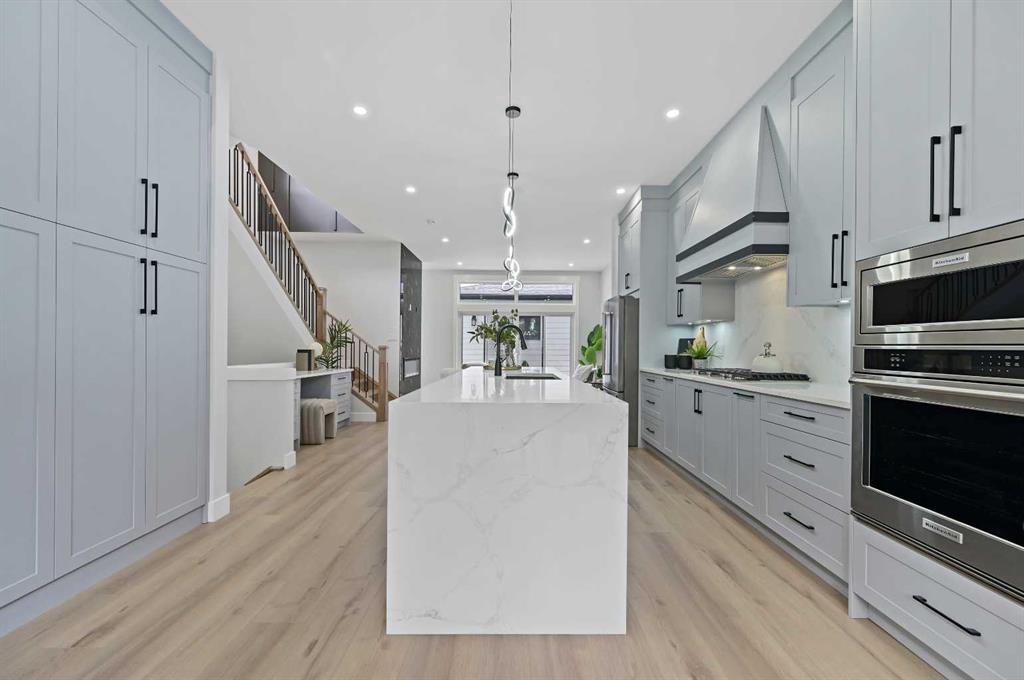 Welcome to 107 Hartford Road NW – a stunning brand-new executive home offering over 2,800 sq ft of beautifully designed living space in the heart of Highwood. Set on a quiet, tree-lined street, this two-storey modern masterpiece boasts exceptional curb appeal with stone, Hardie siding, and Smartboard accents. Step inside to discover a very bright and open floorplan with extensive upgrades throughout—a home that truly must be seen to fully appreciate the quality craftsmanship and detailed finishes that went into this custom build. The main level features 10’ ceilings, a dedicated study/work desk, a spacious dining area, and a dream kitchen with a quartz waterfall island, KitchenAid built-in appliances, a 36” gas cooktop, and designer finishes throughout. The cozy living area includes a dramatic tiled fireplace wall and opens via a sliding patio door to your fully landscaped yard—perfect for summer entertaining.