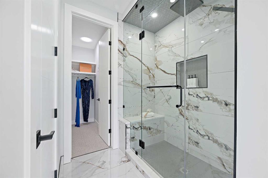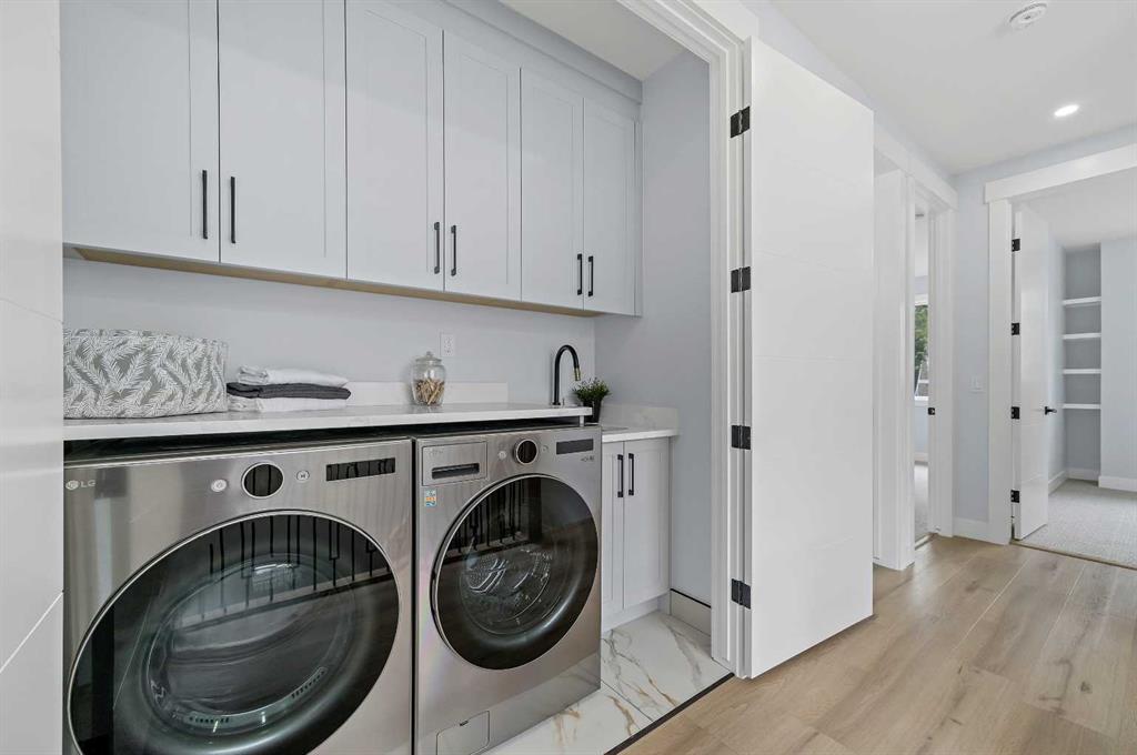 The upper level showcases a gorgeous primary retreat with a sun-tunnel-lit walk-in closet, spa-inspired ensuite with freestanding tub, floating double vanity, and custom tiled shower. Two additional bedrooms each come with their own walk-in closets, along with a 3-piece bathroom and a full laundry room with sink. Downstairs, the fully developed basement features 9’ ceilings, large windows, a spacious recreation area, wet bar, a fourth bedroom with walk-in closet, and a 4-piece bathroom—perfect for guests or multi-generational living.