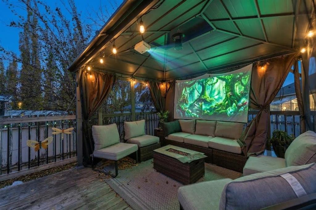 The backyard is a true entertainer’s dream, situated on a massive 7,300+ square foot pie-shaped lot. Imagine hosting summer movie nights with the built-in projector and screen, relaxing under the custom pergola, or gathering with friends around the firepit. Complete with a natural gas hook-up, atmospheric lighting, and a private tree-lined border, this outdoor space is a serene retreat from the everyday.