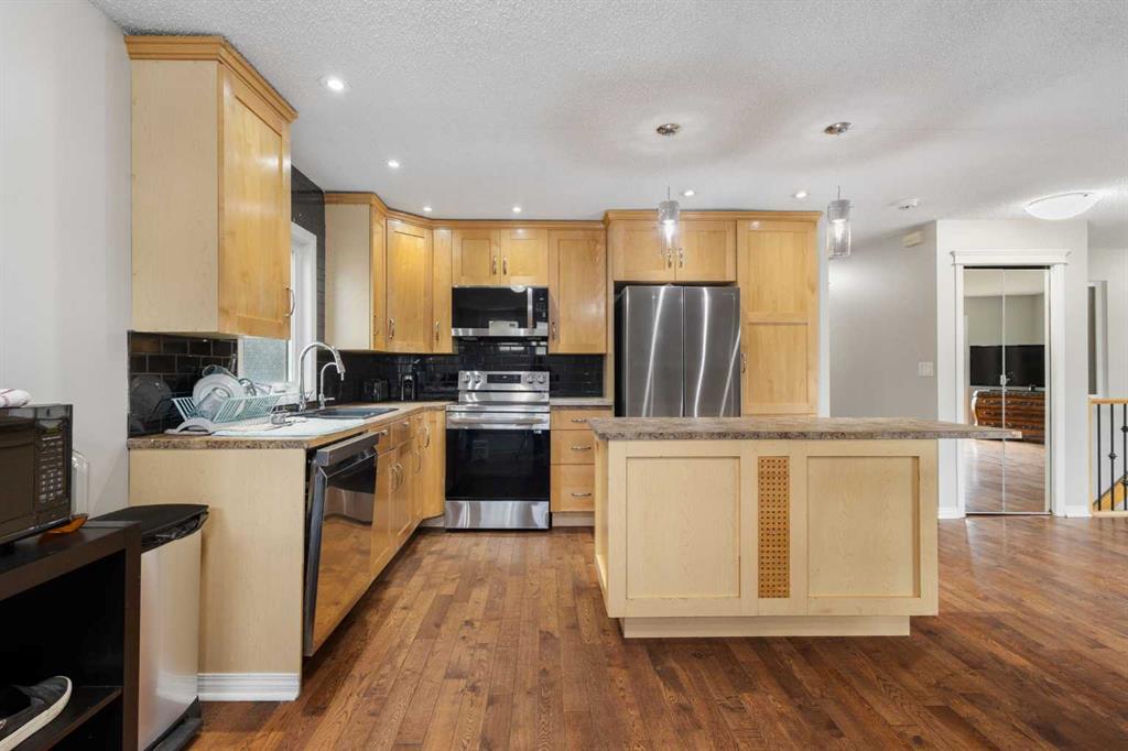 **OPEN HOUSE SUNDAY APRIL 26 from 1pm-3pm** Welcome to this beautiful and spacious bungalow perfectly situated in the desirable community of Woodbine, just a 3-minute walk from Woodbine School and steps away from the scenic trails of Fish Creek Park. Upon entering, you are greeted by a large new window that allows natural sunlight to penetrate the living space, highlighting the cozy wood burning fireplace. The primary bedroom serves as a private retreat featuring its own convenient 3 piece ensuite bathroom. The home also includes a thoughtfully remodeled kitchen from 2009 wtih stainless steel appliances, removing any original dated feel, and the entire interior has been refreshed with new paint. Step outside to find a backyard featuring a large tiered deck, perfect for outdoor entertaining or relaxing in the sun. The basement has been fully renovated to provide additional living area and features a second wood burning fireplace, adding warmth and character to the lower level. Comfort is guaranteed year-round with the inclusion of central air conditioning and a new furnace (2021), while the home’s exterior was updated with new roof shingles in 2018. This property is completed by an oversized double detached garage perfect for vehicles and extra storage.