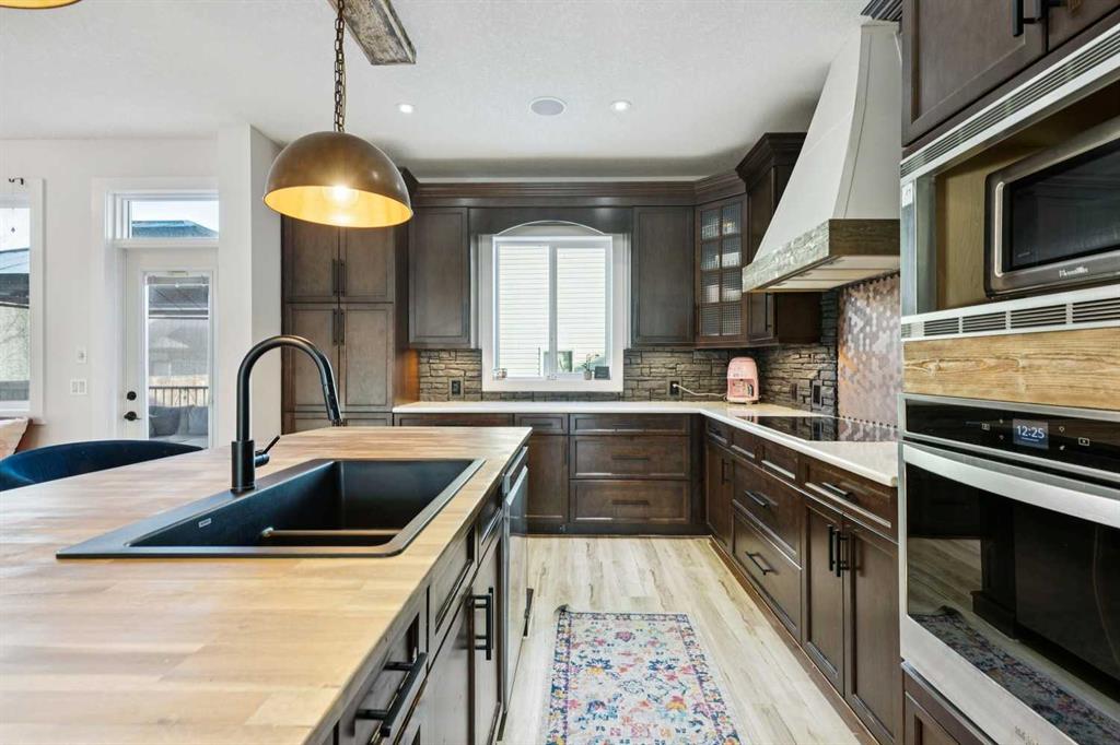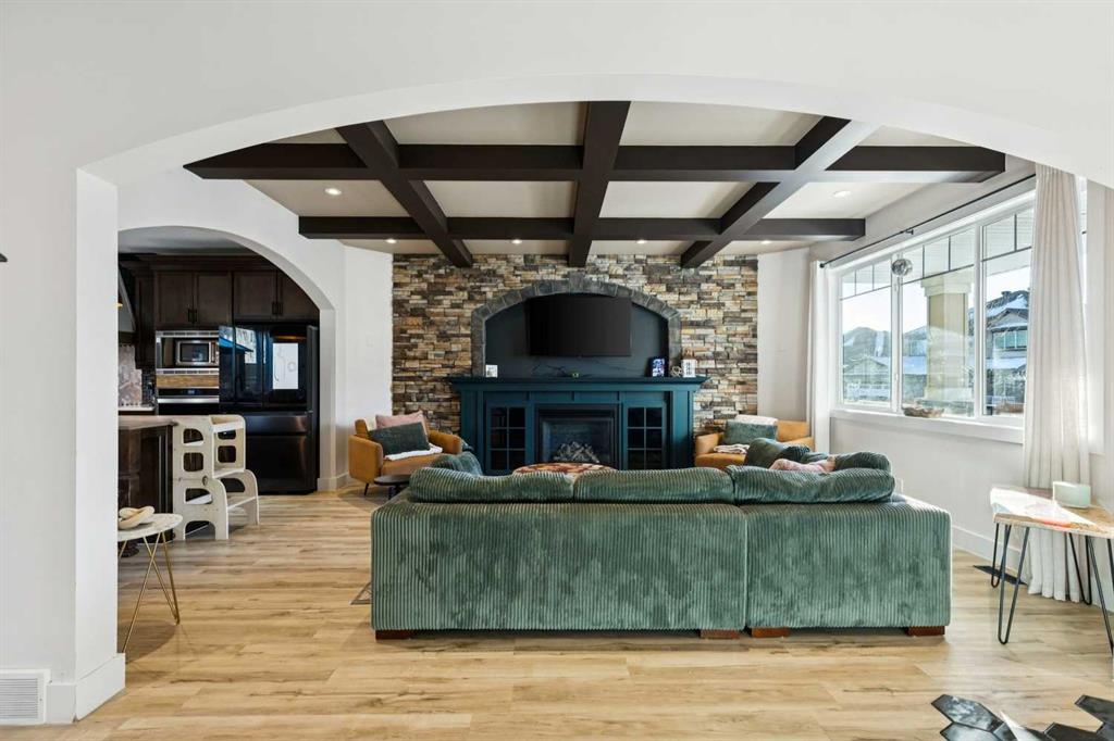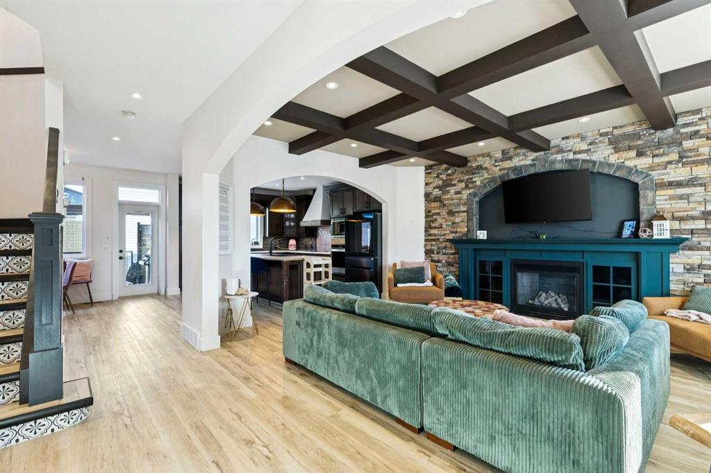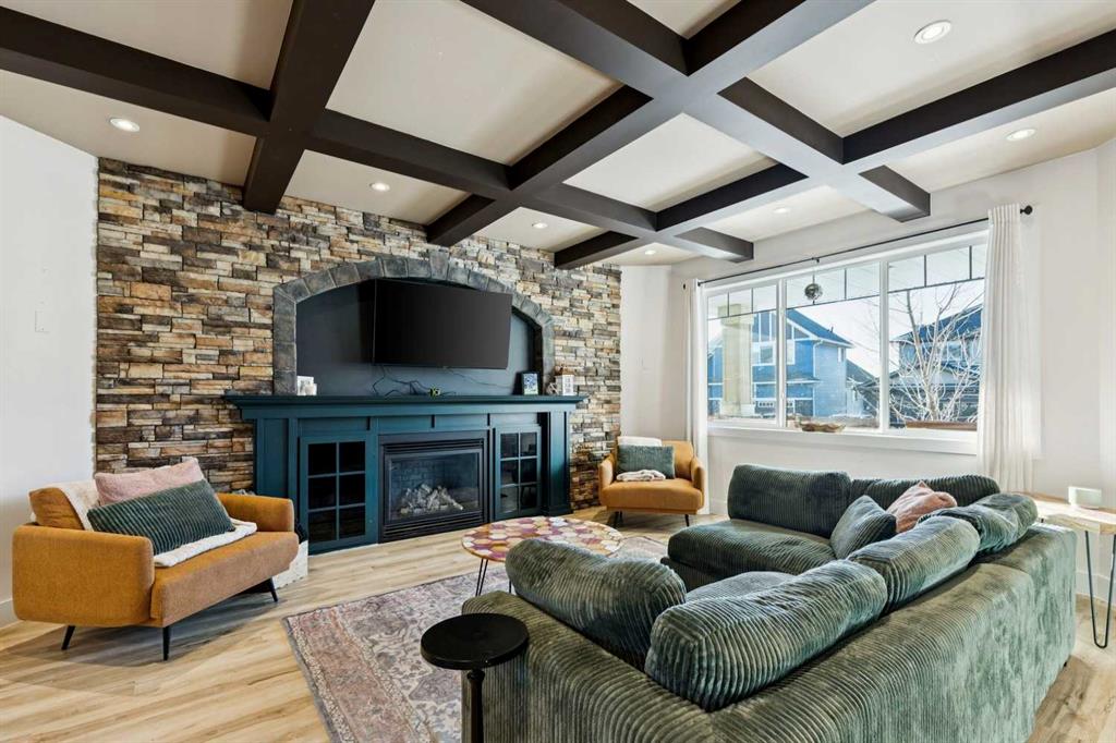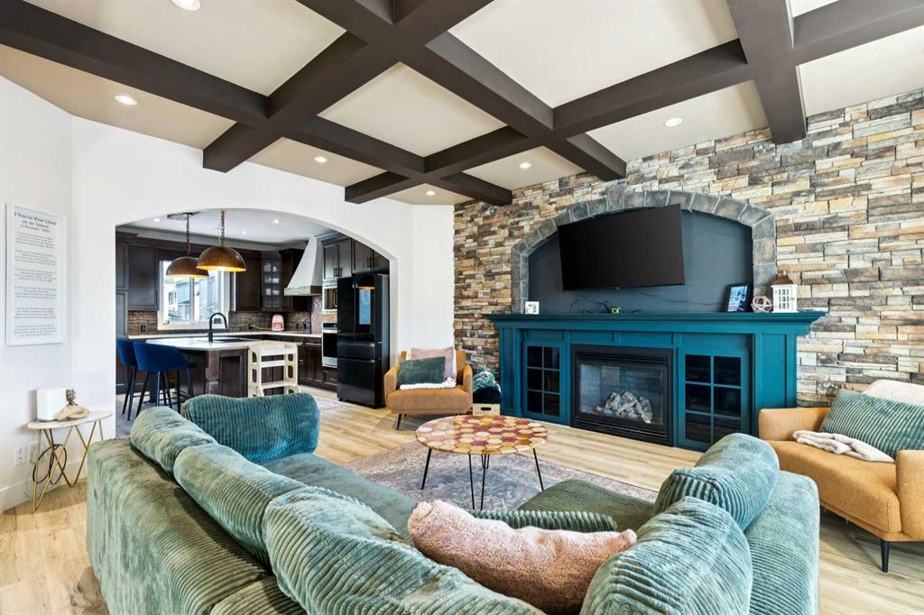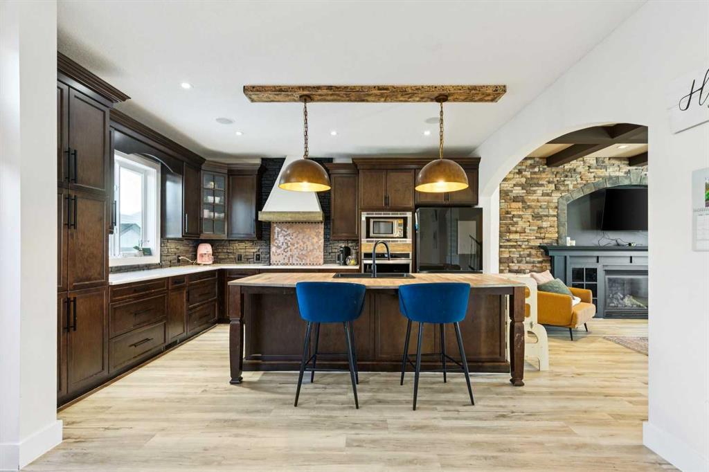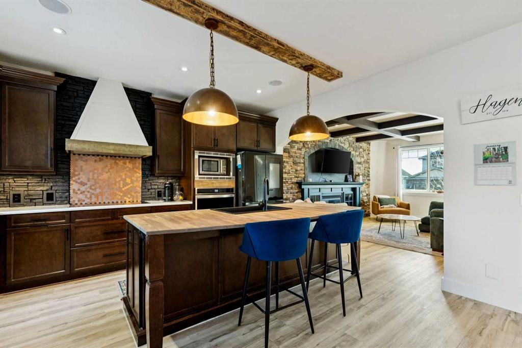 At the heart of the home is a gorgeous chef’s kitchen, complete with a large butcher block island, built-in oven, decorative hood fan, and stainless steel appliances—a dream setup for cooking and entertaining. The living room impresses with its beam ceiling and striking floor-to-ceiling rock fireplace wall, creating a warm and inviting space.