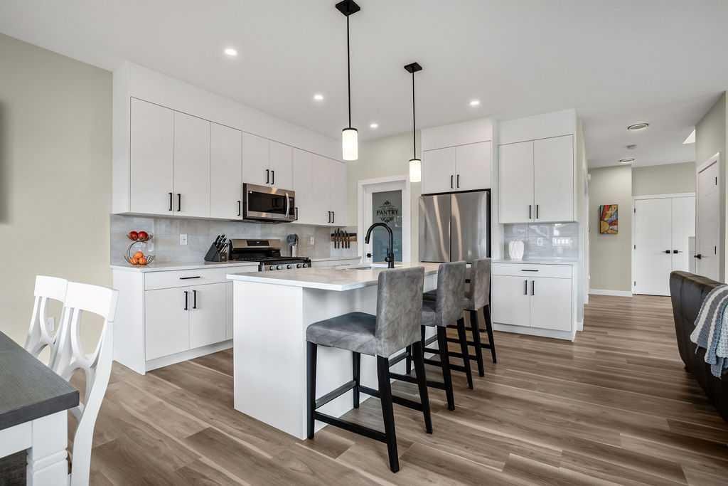 Step inside to a bright, open-concept main floor featuring 9-foot ceilings and a versatile den—ideal for a home office or flex space. The stunning white kitchen is the heart of the home, complete with quartz countertops, premium cabinetry, a walk-through pantry, and a full stainless steel appliance package—perfect for both everyday living and entertaining.