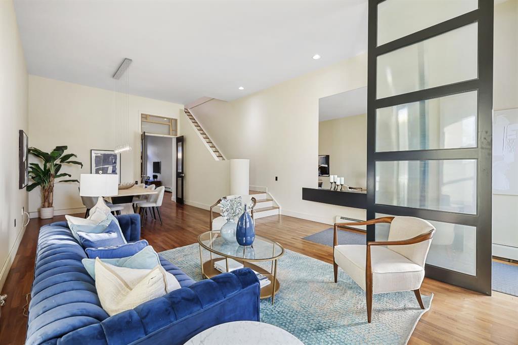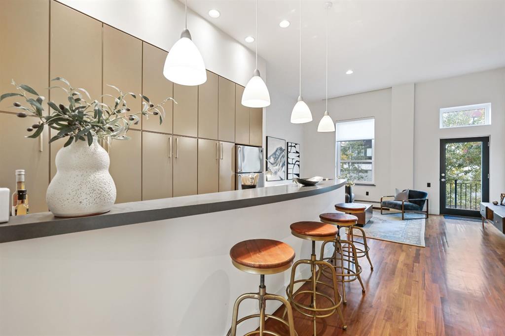 Step inside to discover a bright and inviting main level featuring soaring ceilings, expansive windows, and rich walnut floors that create a seamless flow between the living, dining, and kitchen areas. The sleek kitchen is equipped with flat-panel cabinetry, stainless-steel appliances, and a generous island ideal for casual dining or entertaining. A balcony off the kitchen extends the living space outdoors — perfect for morning coffee or evening cocktails.
