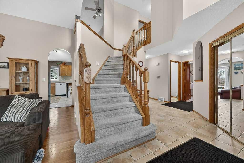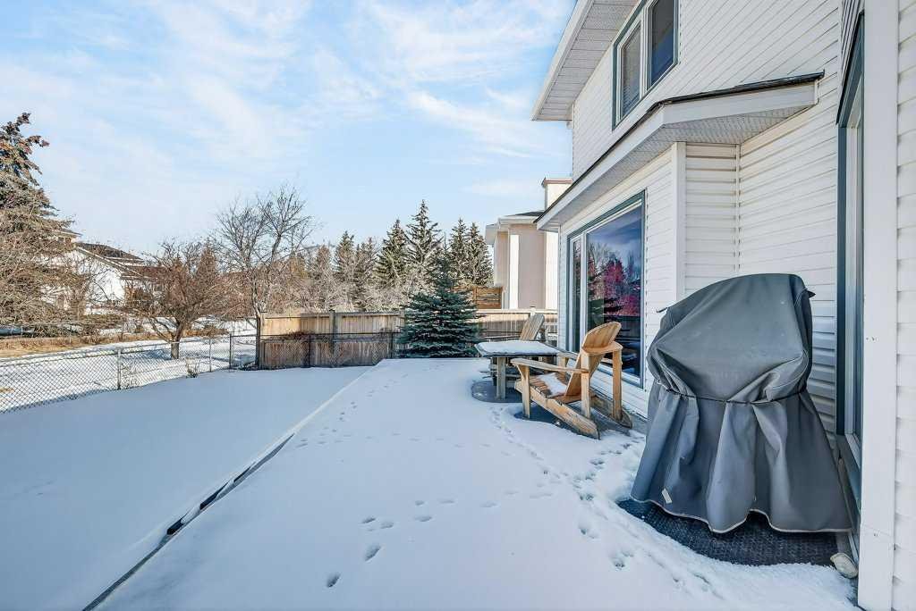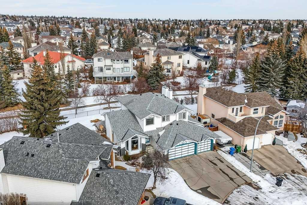 This is a rare opportunity to own a beautiful and solid family home, perfectly nestled on a quiet and safe cul-de-sac and backing onto a serene green belt in the highly desirable community of Hawkwood. With only six homes on the street, this property offers exceptional privacy and a wonderful sense of community. Its charming curb appeal, mature landscaping, and expansive triple-attached garage create a welcoming first impression and offer the lifestyle of comfort. Inside, the home features a bright living room, filled with natural light from large soaring windows, flows effortlessly into the formal dining area—perfect for hosting family dinners and special occasions. Just steps away, the cozy family room with a wood-burning fireplace connects beautifully to the well-appointed kitchen, where abundant cabinetry, a pantry, vaulted ceilings, and a large skylight create an inviting and open space for everyday living. A convenient powder room and warm hardwood flooring throughout the main level add both comfort and elegance. The second floor is designed with rest and privacy in mind. The spacious primary retreat, accessed through elegant French doors, easily accommodates a king-sized bed and features a generous walk-in closet along with a bright 4-piece ensuite complete with in-floor heating. Two additional well-proportioned bedrooms provide excellent space for family members of all ages and can comfortably accommodate queen-sized beds. The unspoiled basement is clean, open, and ready for your personal vision—whether that be additional living space, a home gym, a recreation room, or a customized entertainment area. Recent upgrades provide added peace of mind and value, including new carpet on the entire upper level and staircase (2025), fresh interior paint (2025), driveway lift and crack repairs (2025), new sump pump (2025), a new roof (2024), greenhouse (2024), and a furnace engine replaced in 2016. The home is also equipped with central air conditioning rough-in and includes the original 2007 A/C unit, which is being sold in as-is condition. Set on an impressive 7,168 sq. ft. lot, the backyard is truly a private retreat. A large patio finished with waterproof Duradek overlooks the peaceful green space lined with apple trees and leads toward a nearby playground. The generous yard offers endless possibilities—perfect for bonfire evenings, BBQ gatherings, or growing your own produce in the greenhouse. In springtime, when the apple trees bloom, the backyard view becomes truly breathtaking. The location is exceptional. St. Maria Goretti School in a 10-min walk and Hawkwood School 15 min away. Shopping and amenities at Superstore, Beacon Hill Shopping Centre, and Crowfoot Shopping Centre are a short drive away, along with the Crowfoot Library, YMCA, restaurants, and everyday conveniences. Quick access to Stoney Trail makes commuting across the city easy and provides a fast escape to the mountains. Opportunities like this do not come often.