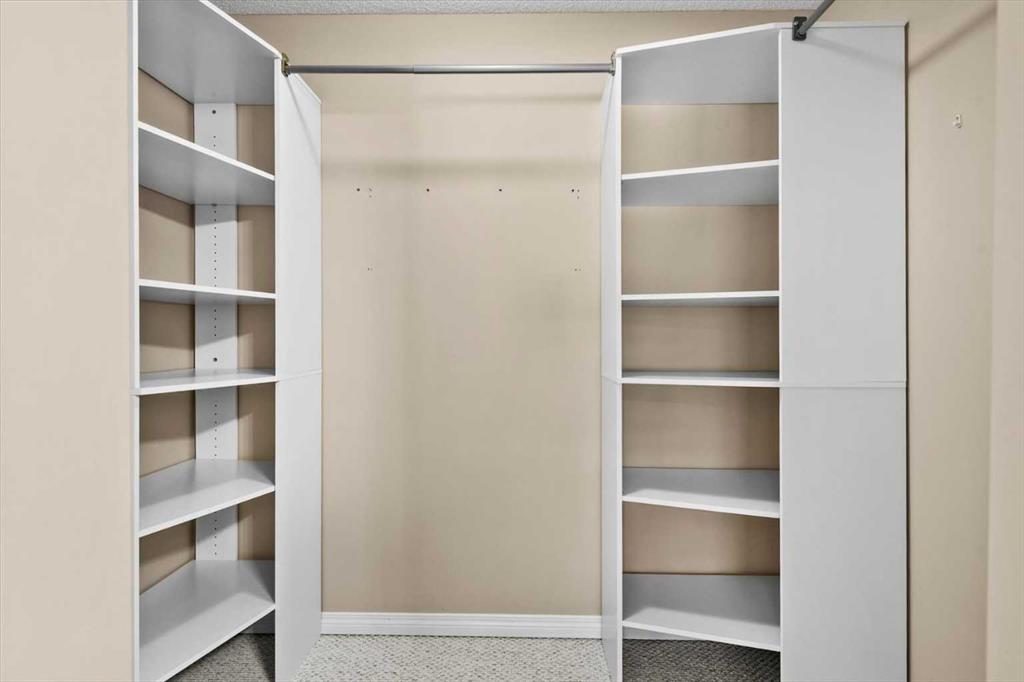 The primary bedroom offers a walk-through closet with built-in storage shelves and a private ensuite. A second generously sized bedroom and a 4-piece bathroom complete the interior layout.