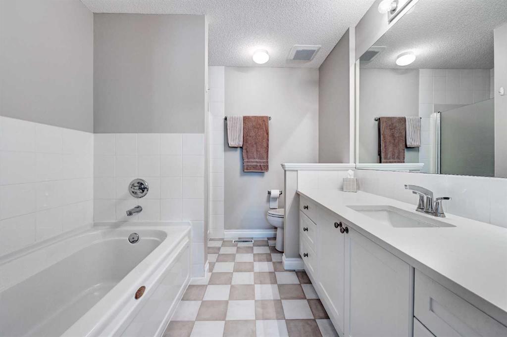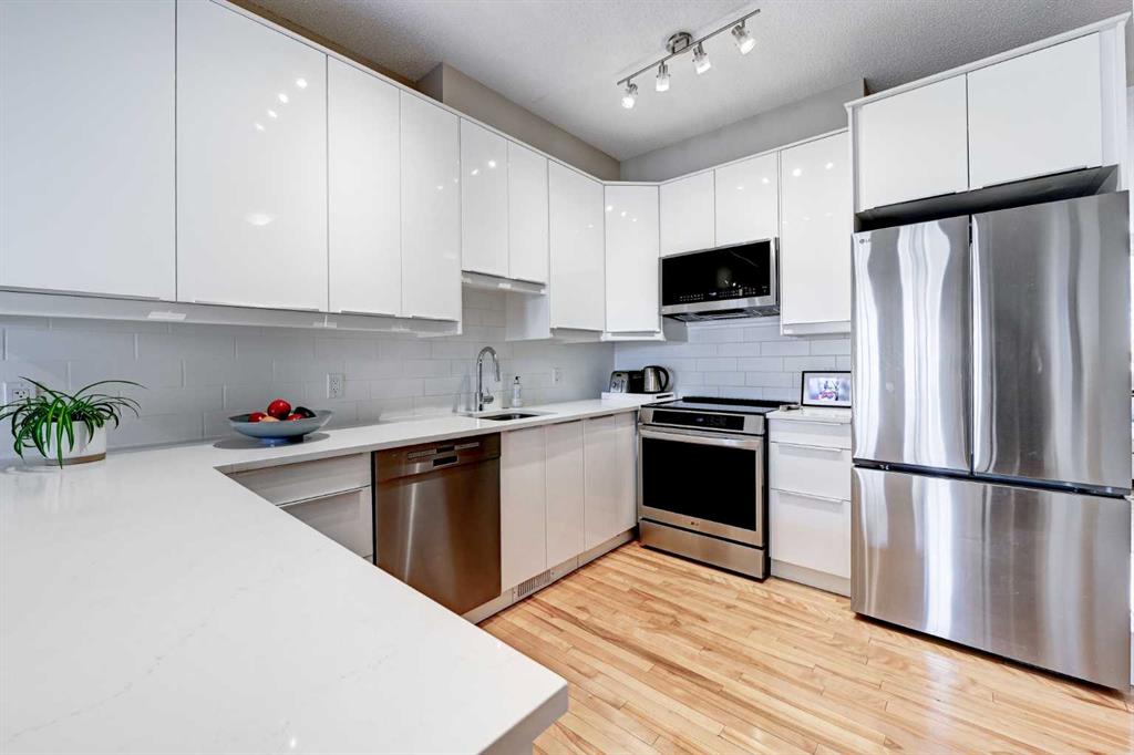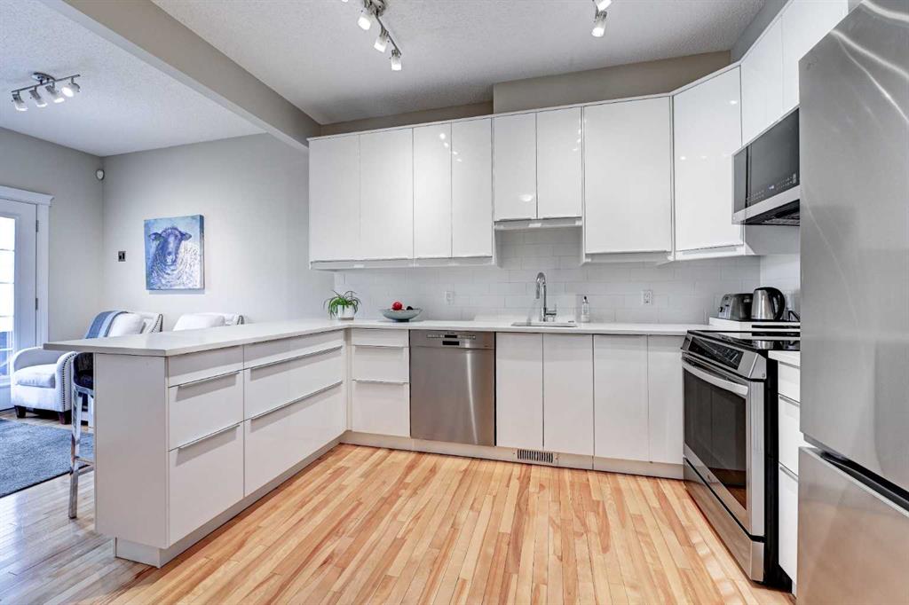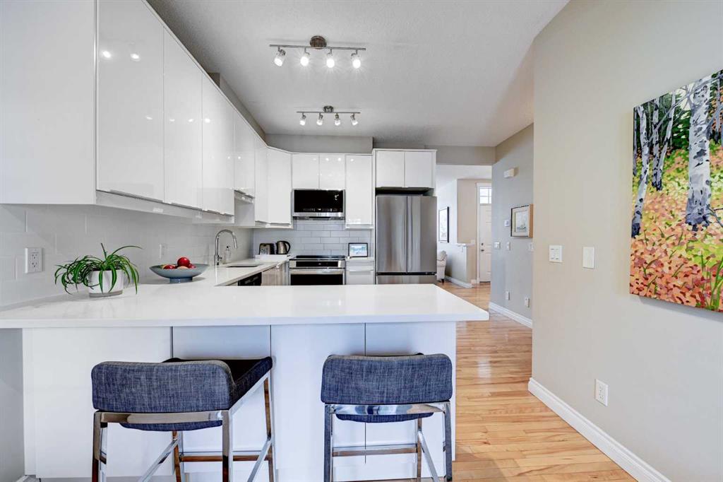 Nestled in the quiet enclave of Brighton Court, this beautifully maintained Brownstone townhouse blends timeless design with modern convenience — all in the heart of Marda Loop, one of Calgary’s most vibrant communities. Offering over 2,247 sq. ft. of developed living space, the home features 3 bedrooms + office, 3.5 baths, and an inviting lower-level family room. Expansive windows and 9-ft ceilings fill the interior with natural light, complemented by birchwood flooring that flows across the main level. The open-concept main floor showcases a stylish living and dining area with an electric fireplace, while the modern kitchen impresses with NEW LG and Bosch appliances, quartz countertops, and a U-shaped breakfast bar. French doors lead to a fenced west-facing patio, perfect for summer evenings under the shade of a mature ash tree. Upstairs, you’ll find three generous bedrooms, including a primary suite with private balcony, walk-in closet, and spa-inspired ensuite. The fully developed lower level adds a cozy family room, guest bath, and ample storage. With a double-attached garage, central A/C, new Hardie board siding, and roof shingles, this home combines peace of mind with refined comfort. Located just steps from shops, cafés, and parks, and minutes from top schools like Lycée Louis Pasteur and Masters Academy, this spacious townhouse offers the best of Marda Loop living — spacious, walkable, and move-in ready.