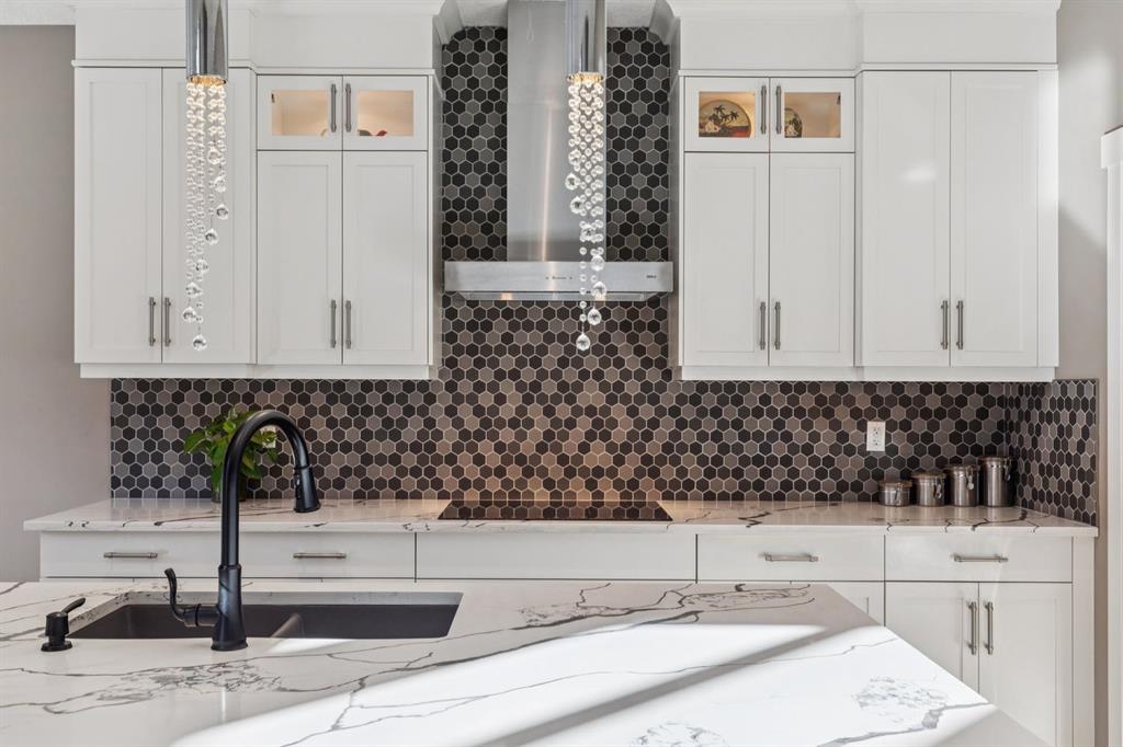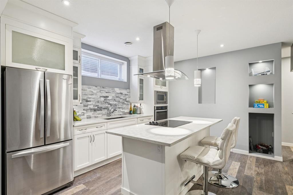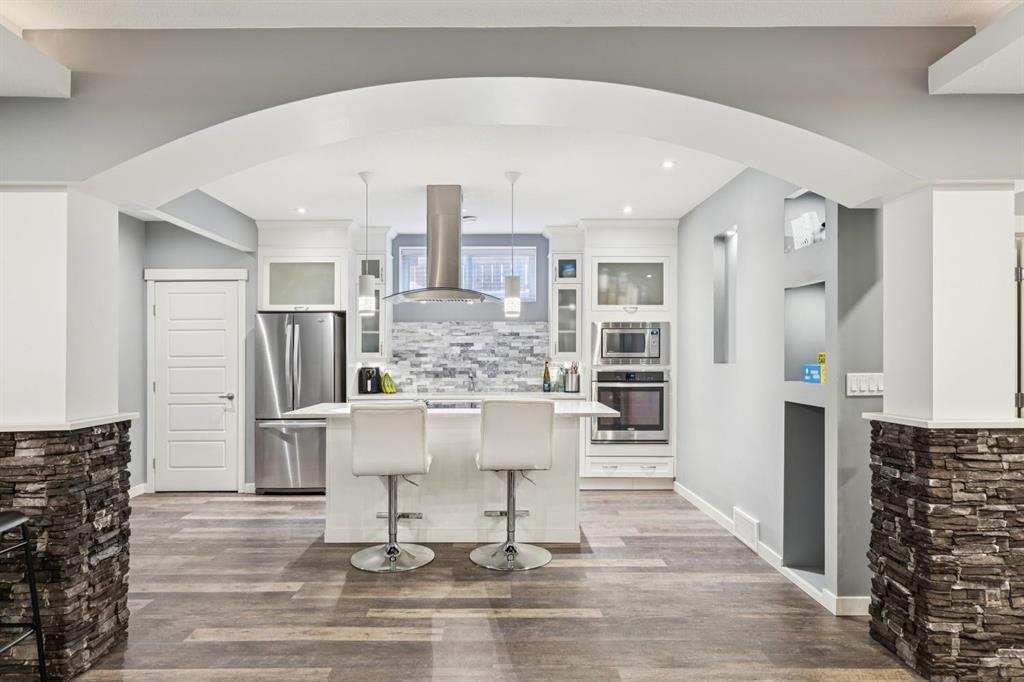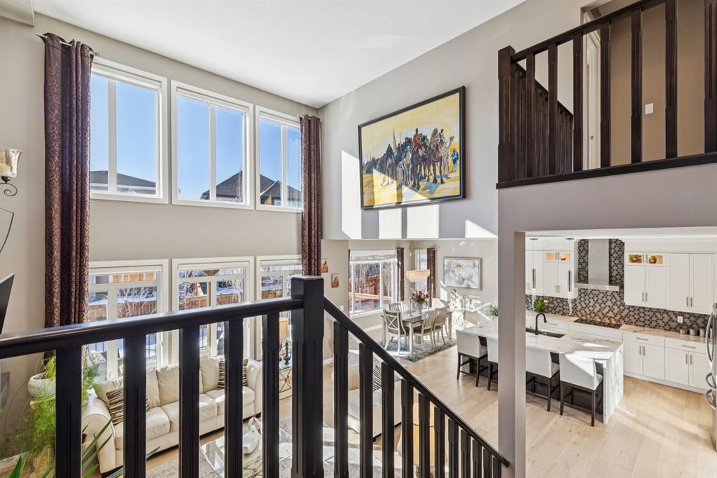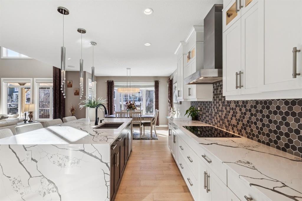 Located in the highly sought after community of Aspen Woods, this stunning family home sits on a quiet street just steps from scenic walking paths, playgrounds, and parks, offering the perfect blend of nature and convenience with quick access to top rated schools, Aspen Landing Shopping Centre, and an easy downtown commute. Showcasing beautiful curb appeal and a west exposed backyard for warm afternoon and evening light, this thoughtfully designed home boasts over 4,000 sq ft of developed living space and features a full walk-out legal basement suite; ideal for extended family or additional income. The main floor welcomes you with a spacious entry and elegant wide plank white hardwood flooring, creating a bright and airy atmosphere throughout. A formal dining room or den offers flexibility for growing families, while the open concept living space is anchored by a dramatic 2-storey window wall and Crestal gas fireplace. The modern kitchen is both stylish and functional with white shaker cabinetry, a striking quartz waterfall eat-up island, induction cooktop, built-in oven and microwave, and a walk-through pantry leading to the mudroom and triple car garage, with a convenient main floor laundry room. A sunny breakfast nook opens onto a pergola-covered raised balcony, perfect for year round enjoyment. Upstairs, hardwood flooring continues throughout, and a spacious bonus room overlooks the living area below, enhancing the home’s open design. The primary retreat features vaulted ceilings, a custom walk-in closet, and a luxurious 5pc ensuite complete with a deep soaker tub, glass enclosed shower, his/her sinks, and separate make-up vanity, while two additional bedrooms with walk-in closets and a full bath complete the upper level. The fully finished legal basement suite offers vinyl plank flooring, two bedrooms (one with stacked washer and dryer), a 3pc bathroom, built-in appliances including an electric cooktop, large windows for abundant natural light, its own furnace, and a cozy gas fireplace flanked by built-in shelving and storage. Additional highlights of the home include a water softener system and radon gas vacuum system, along with recent upgrades such as three new windows, new shingles and gutters, fresh interior paint, new kitchen sink, new bathroom sinks, and new countertops in the kitchen and two bathrooms. The beautifully landscaped west backyard features apple and cherry trees creating an exceptional outdoor setting for family living in one of Calgary’s most desirable communities.
