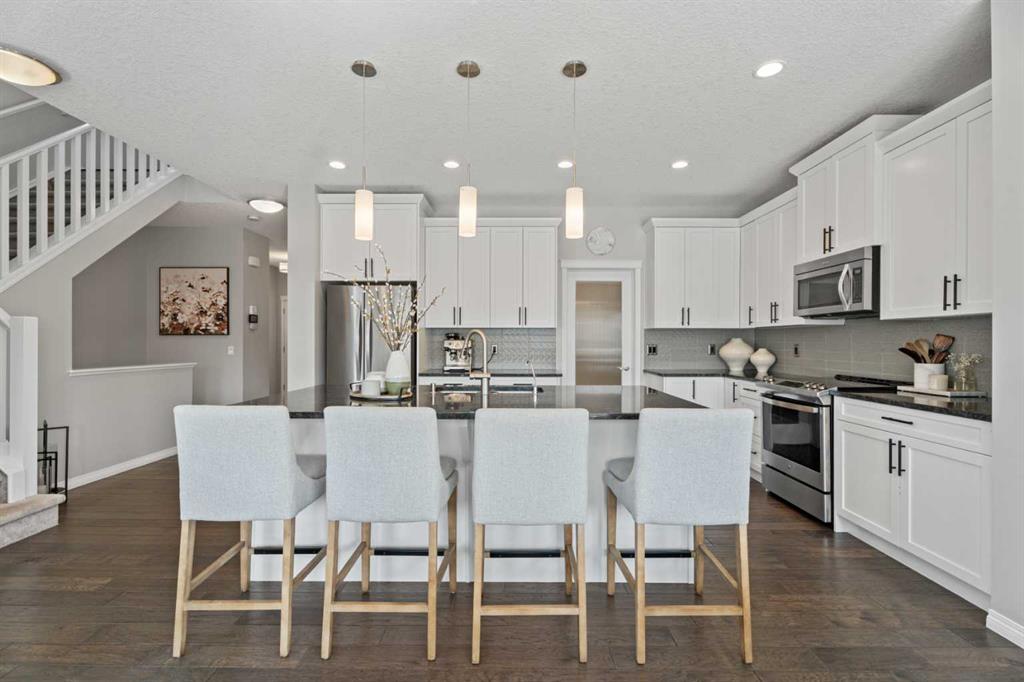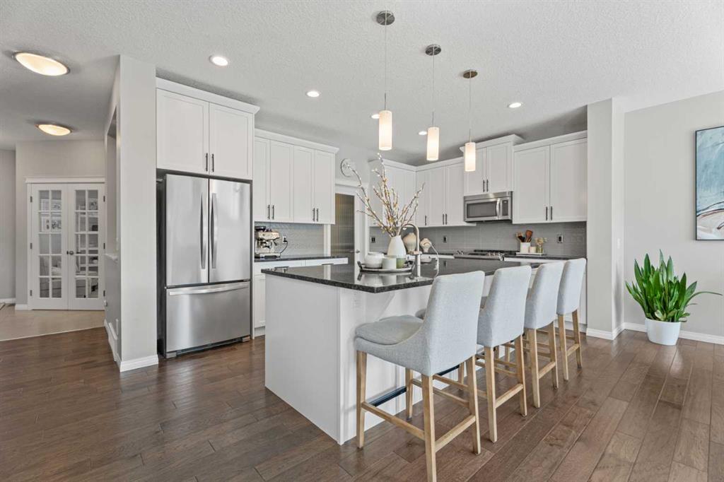 Welcome home to 11 Mount Rae Heights in Mountainview! This stunning 2-storey home offers over 2,500 sq. ft. of beautifully finished living space above grade, plus another 900+ sq. ft. in the fully developed basement. There’s so much to love beyond the impressive size. Step inside from your oversized double garage to a functional mudroom with ample storage, and a convenient walk-through pantry leading into your beautiful main living area. The kitchen features granite countertops, crisp white cabinetry, stainless steel appliances, and a striking backsplash. The spacious dining room is surrounded by large windows overlooking your south-facing backyard, complete with a composite deck, perfect for soaking up the sun. The open concept main floor also includes a cozy gas fireplace in your living room, and massive office off the front entry featuring French doors and a custom feature wall, ideal for work or relaxation. You also have a well tucked away half bath that completes this level. Upstairs, enjoy over 1,400 sq. ft. of well planned space with a central family room separating the primary retreat from the kids’ wing. The primary suite features mountain views, a 5-piece ensuite with granite countertops, double vanity, deep soaker tub, stand-up shower, and a walk-in closet. Across the hall, you’ll find three generous bedrooms; one with a walk-in closet, another with its own ensuite, and a third perfect for guests or kids. The fully developed basement is built for entertaining, complete with a wet bar (including a bar fridge and wine storage), two huge recreation areas, a second fireplace, plenty of storage, and a convenient half bath. Additional features include central air conditioning, a water softener, and thoughtful details throughout. Whether you’re enjoying family time in your sun-filled backyard, hosting game nights with friends, or curling up by the fire, this home truly has it all. Check it out today, you’ll be glad you did!