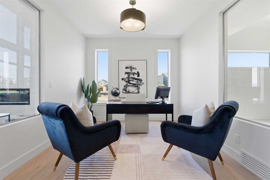 The open-concept main floor flows seamlessly from one space to the next, featuring a versatile flex room with elegant glass accents, perfect for a home office, playroom, or formal sitting area. The chef-inspired kitchen impresses with custom cabinetry, quartz countertops, built-in premium appliances, and a large central costume island with bar seating. Full-height cabinets and a spacious walk-in pantry combine functionality and style, ideal for any culinary enthusiast. Engineered hardwood flooring, designer tile work, and statement lighting enhance every detail, while the open-to-below living room adds a dramatic sense of grandeur, openness, and natural light.