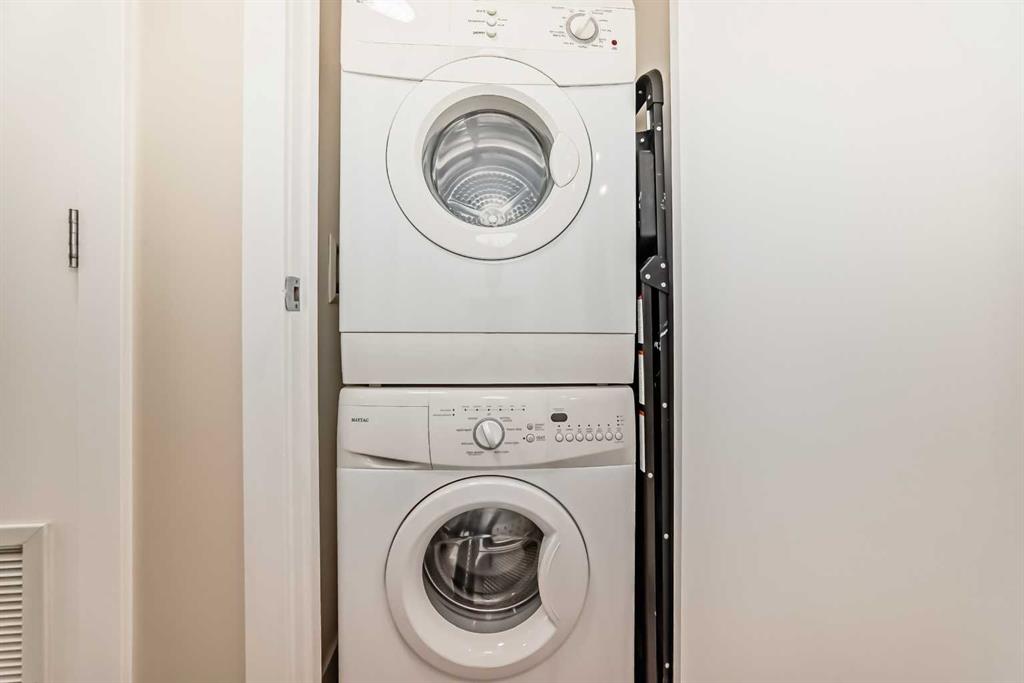 This well-maintained one-bedroom unit offers strong rental appeal, complete with an underground parking stall and dedicated storage locker—key features that enhance tenant demand and long-term value. The modern kitchen is equipped with a gas range, stainless steel appliances, and an integrated refrigerator for a clean, upscale finish that stands out in the rental market.