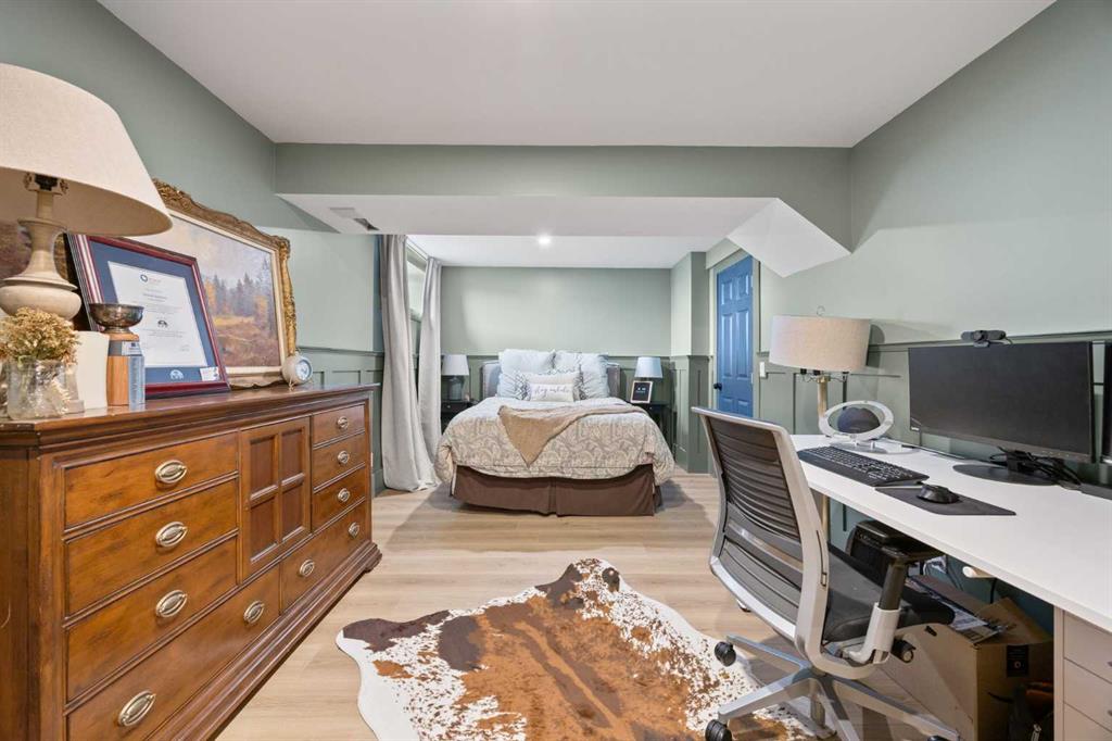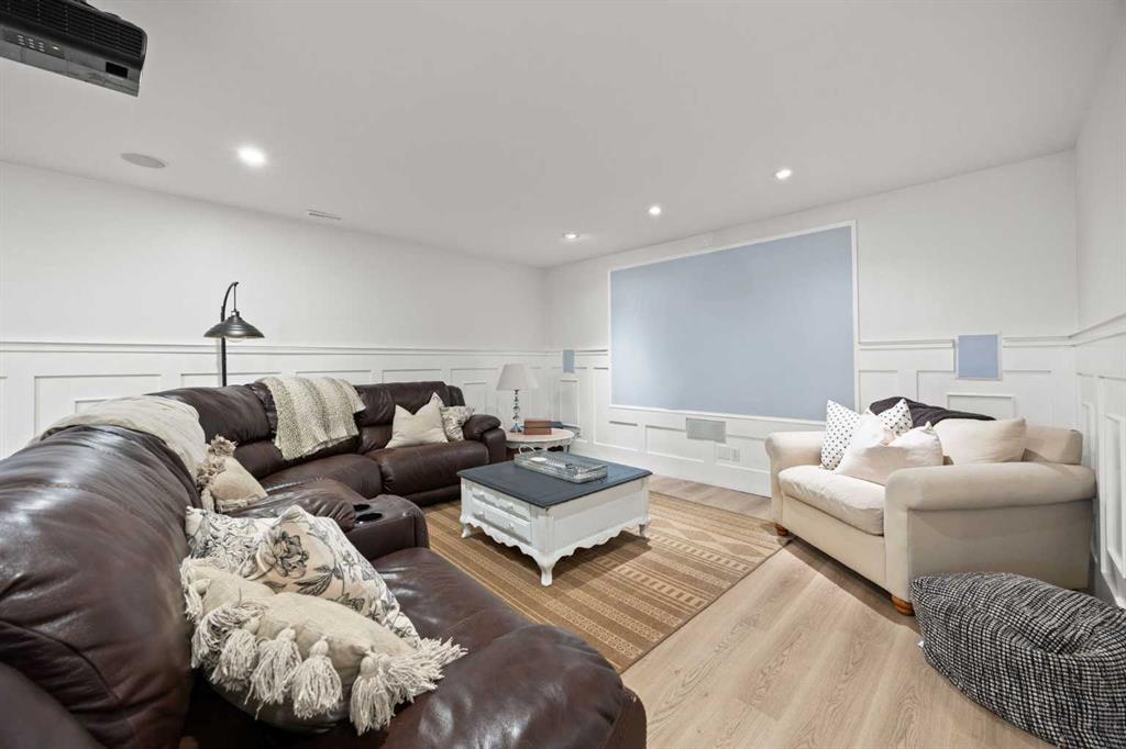 The second bedroom is magazine-worthy, with custom built-ins, warm designer tones, and trendy lighting that make this space truly special. Downstairs, the fully finished lower level is made for fun, offering a massive rec room and games area plus a dedicated movie theater space complete with projector and big screen — ideal for family movie nights or cheering on your favorite team. A large third bedroom and an additional full bathroom make this level perfect for guests or older kids.