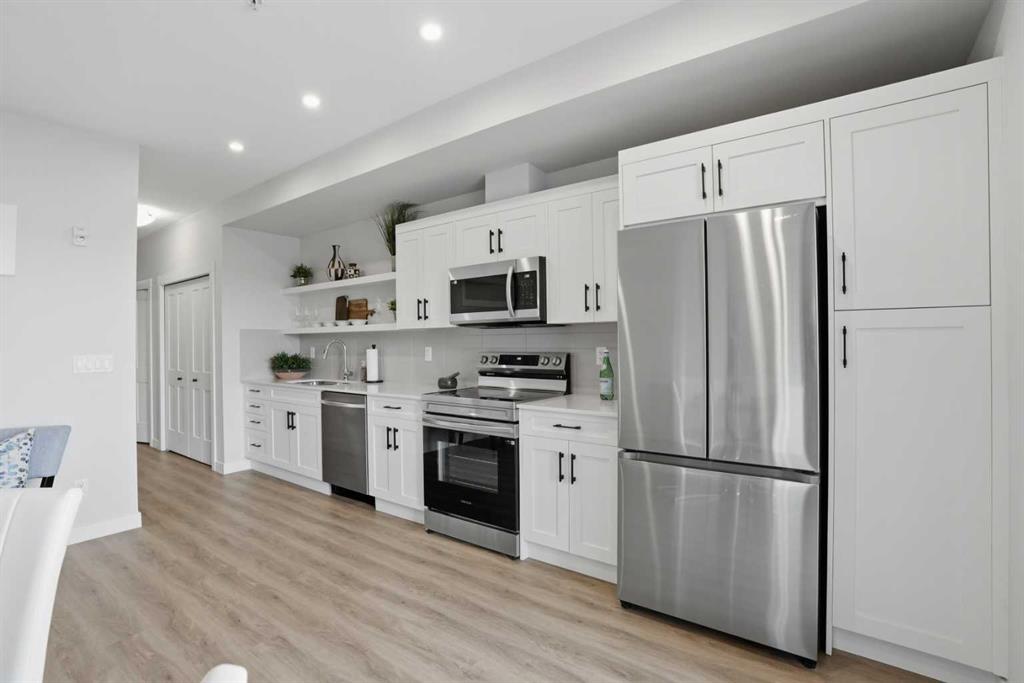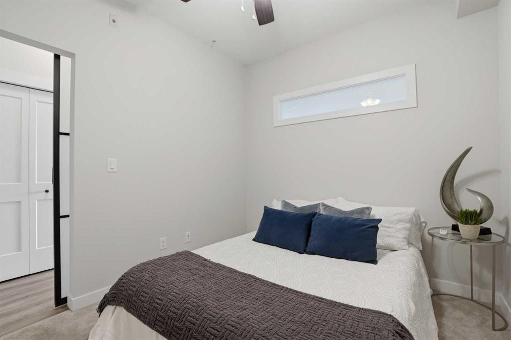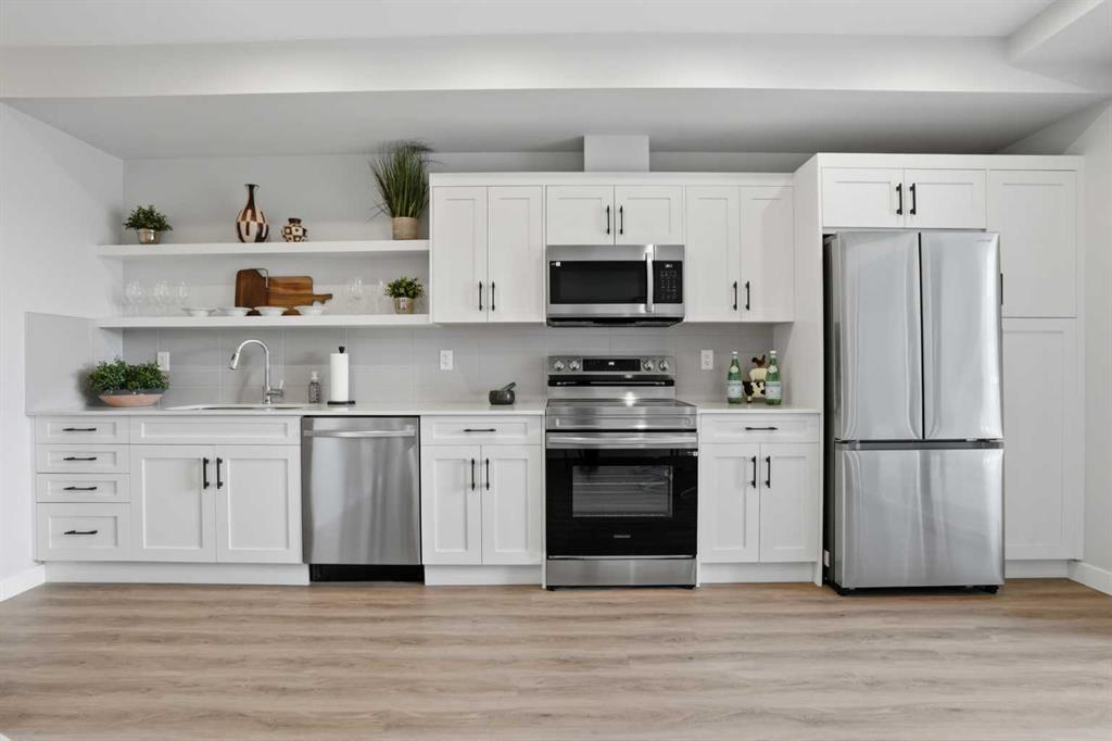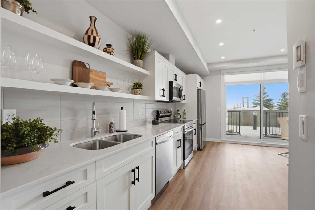 The large functional kitchen is a standout feature within the central living area, showcasing higher end cabinetry, quartz countertops, stainless steel appliances, and modern open shelving that adds both style and practicality. It grounds the the dining and living area, where large patio doors allow ample natural light and create a smooth transition to your personal outdoor patio and outdoor space. The oversized bedroom offers a calm and comfortable retreat, while the sleek 4-piece bathroom and convenient in-suite laundry complete the home.