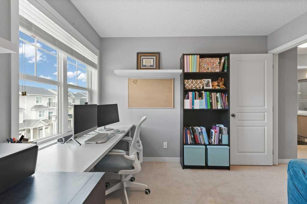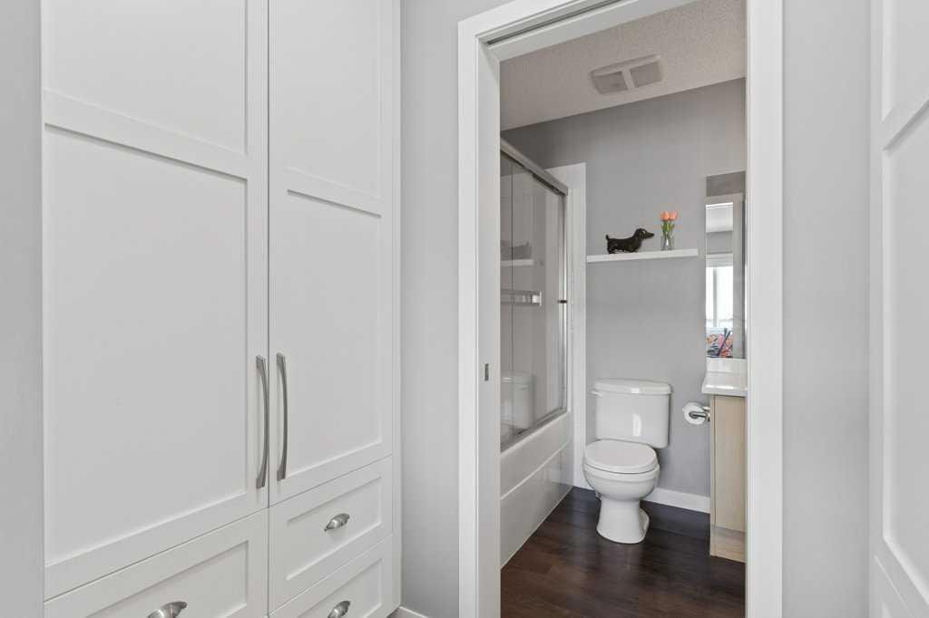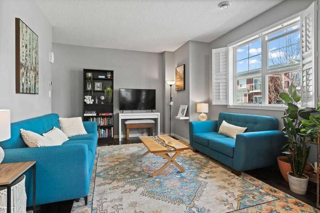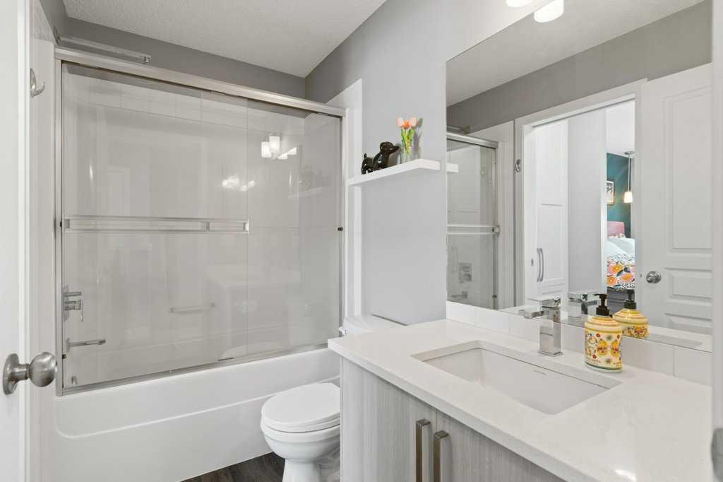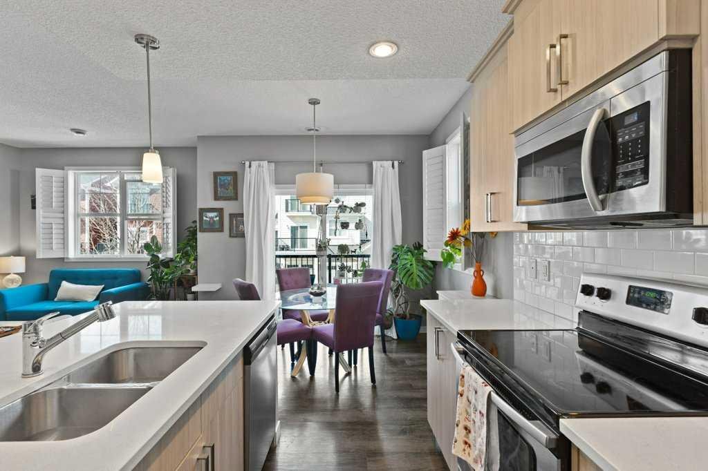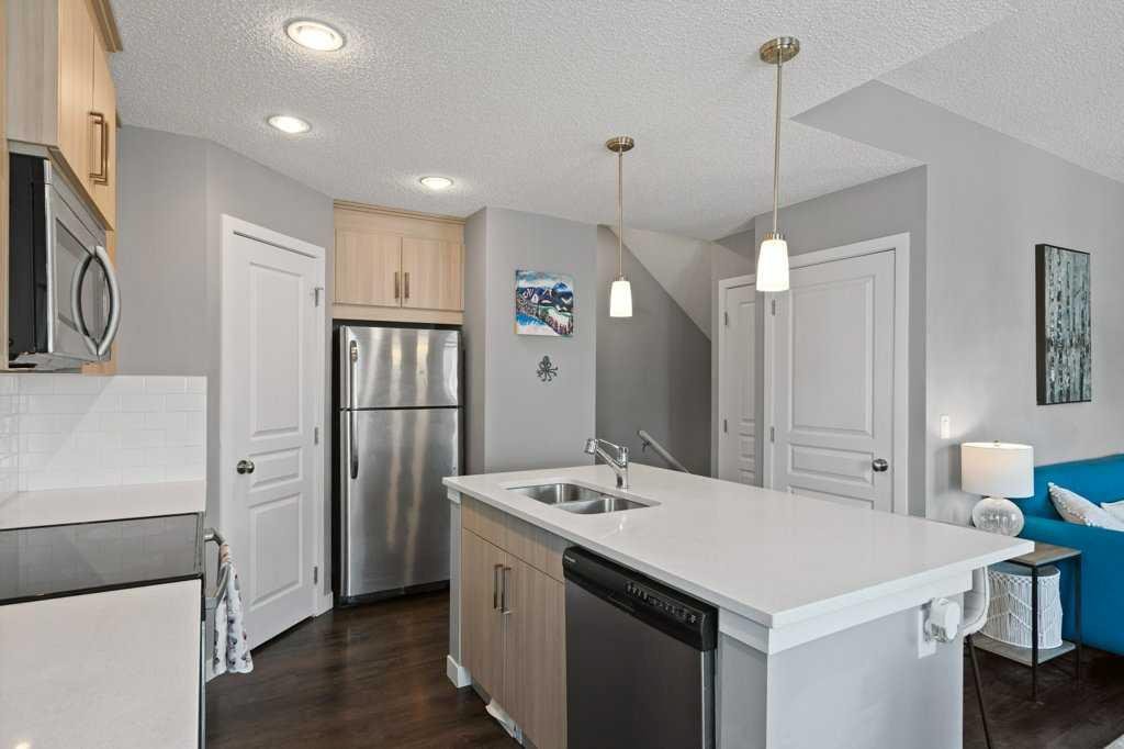 This thoughtfully designed, pet friendly, end-unit townhome offers upgrades and features not always found in other units within the complex. You’ll appreciate quartz countertops in the kitchen and 4-piece bathroom, a built-in central vacuum system with toe kicks at the kitchen island and upper bathroom, custom walk-through closet built-ins and a garage that can accommodate a small truck. Upon entry, you’re welcomed by a functional foyer with access to the single attached garage. Upstairs, the open-concept kitchen, dining, and living area is filled with natural light from the southwest-facing windows and features vinyl plank flooring throughout. The kitchen is finished with trendy cabinetry, stainless steel appliances and a spacious corner pantry. The dining area sits beside the balcony, making it perfect for both hosting and BBQing, while also benefiting from an extra window as one of the many perks of being an end unit. The bright and inviting living room is the perfect place to relax, especially for those who love houseplants and natural light. Both main floor windows are also enhanced with upgraded shutters. The second level is complete with a convenient stacked laundry area and a 2-piece bathroom. On the upper floor, you’ll find a spacious primary bedroom featuring a Juliette balcony, bedside pendant lighting, and a walk-through closet with high-end built-in cabinetry leading to the 4-piece bathroom. The bathroom includes a tub with a glass sliding panel, a rain-head style shower attachment, and an additional central vacuum toe kick at the vanity. The second bedroom is also generously sized and offers a large closet. This well-managed complex is known for its excellent neighbours and strong sense of community. Whether you’re looking for a place where your kids can enjoy the complex bike rides or somewhere peaceful to unwind, this home offers both. Residents can also enjoy the recently updated landscaping throughout the complex. Ideally situated close to every amenity you could need, including Costco, Walmart, parks, walking paths, and with easy access to major roadways throughout the city. Check out the 3D Virtual Tour and book your showing today!