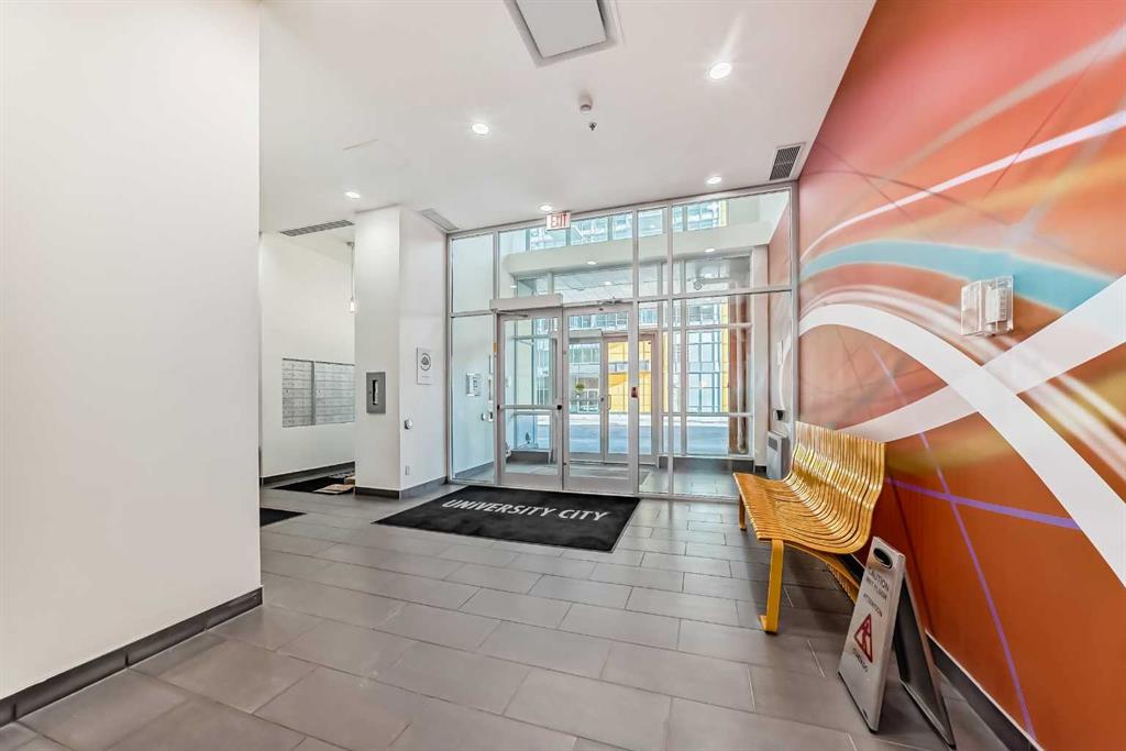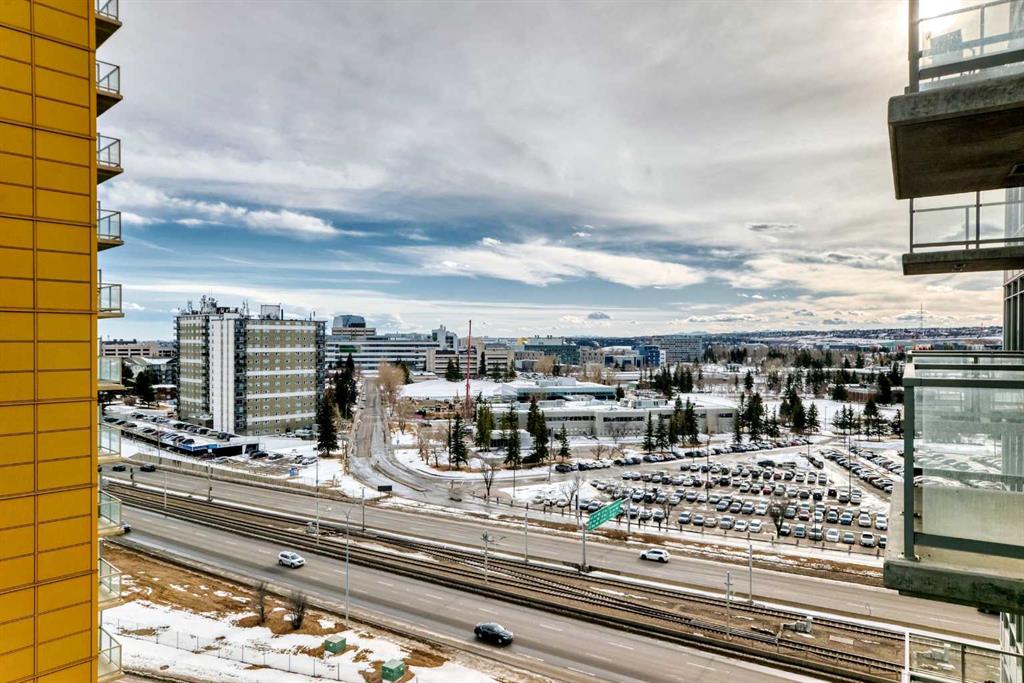 $44,500 Below 2026 Assessment | Titled Parking | CTrain at Door. Eleventh-floor southeast exposure with unobstructed sightlines toward the city — morning and midday sun fills the living area through floor-to-ceiling windows that span the full width of the unit. This 1-bedroom-plus-den layout in University City’s Orange Building delivers 560 square feet of functional space: a bright open-concept living and dining area with nine-foot ceilings, a modern kitchen with full-size appliances, and a private balcony off the living room catching the southeast light — morning coffee with an unbroken city skyline. The dedicated den off the main living space features a full-height frosted glass panel that borrows natural light from the adjacent room — a design detail that keeps the space bright while maintaining privacy for use as a home office, study, or second sleeping area. Primary bedroom has an exterior window and full-width closet. Four-piece bathroom with tile surround. In-suite washer and dryer, central air conditioning, titled heated underground parking stall, and assigned storage locker — all included. Condo contributions of $479.34 per month cover heat, water, sewer, insurance, and professional management. At this price point, the combined monthly cost of ownership is comparable to current one-bedroom rental rates in the Brentwood area. The building sits directly adjacent to Brentwood CTrain station — platform access without crossing a street. University of Calgary, Foothills Medical Centre, and Alberta Children’s Hospital are all reachable on foot. FreshCo, Co-op, and Brentwood Village Shopping Centre are within a five-minute walk. Nose Hill Natural Environment Park connects to an extensive trail network ten minutes north. Crowchild Trail provides direct vehicle access to downtown. Vacant and available for immediate possession.