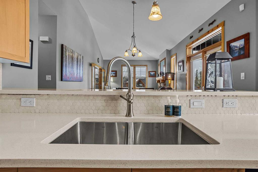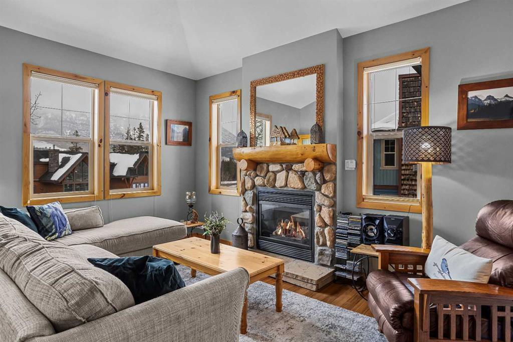 Step into this thoughtfully designed townhome featuring a bright, vaulted main living area with warm wood accents and hardwood floors. The sleek kitchen is both functional and stylish, with quartz countertops, an eating bar, and an open flow into the living space, highlighted by river stone accents and a cozy gas fireplace. Large windows bring in plenty of natural light and capture beautiful mountain views, while the covered upper balcony offers a perfect spot to relax and enjoy the scenery year-round. This home includes 3 bedrooms and 2 bathrooms, with a primary suite featuring its own ensuite and walk-in-closet. A single-car garage and additional storage provide everyday convenience. Located in a well-maintained complex with easy access to shopping and nearby trails, perfect for those who love an active lifestyle without sacrificing comfort or style.