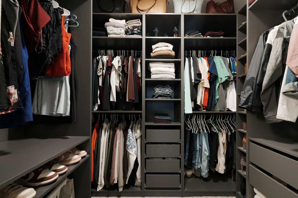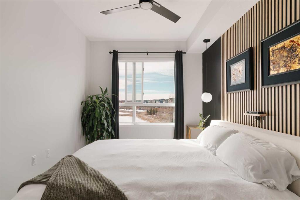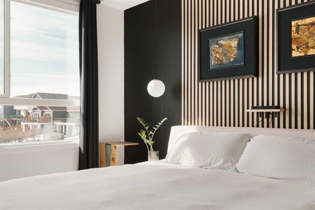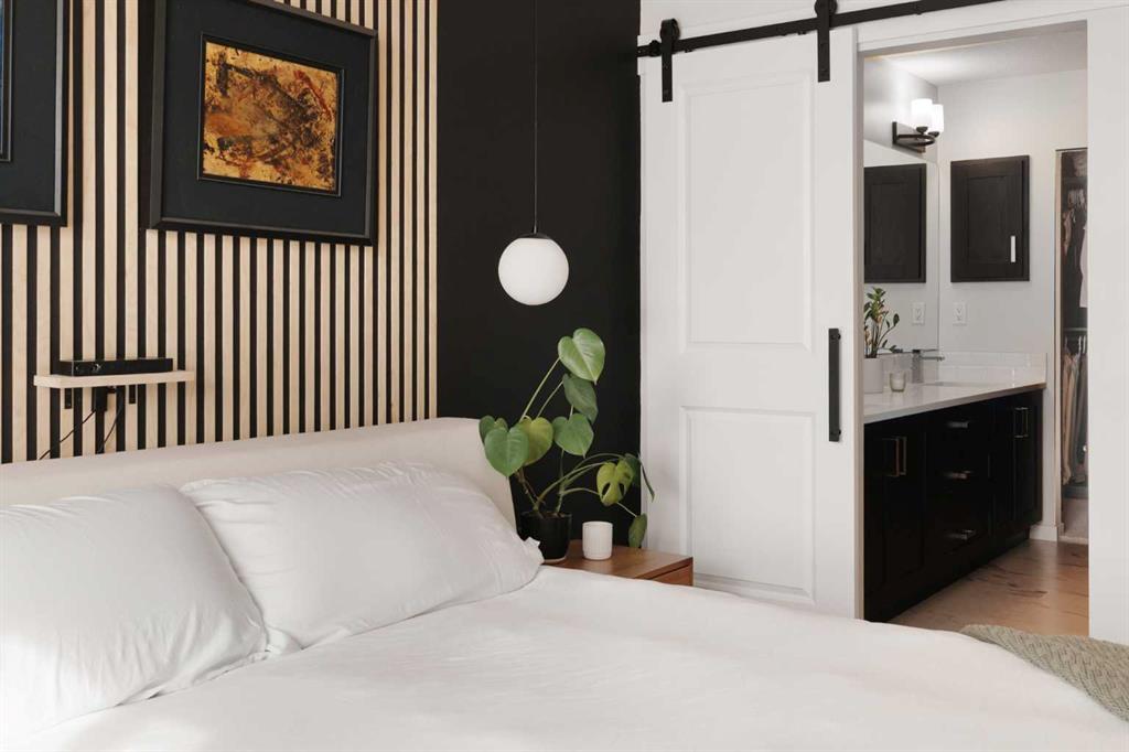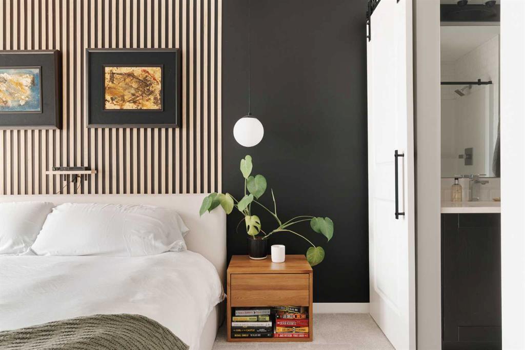 The primary bedroom is a calm and elegant escape, featuring plush carpet, a vertical wood slat accent wall, a walk-in closet with custom built-ins, and a luxurious ensuite with double vanity, quartz countertops, undermount sinks, and a large frameless glass shower with subway tile surround. The second bedroom is equally well-appointed, offering flexibility as a guest room or home office, with its own accent wall, excellent natural light and walk in closet with custom organizers. A full second bathroom with dark cabinetry and white fixtures serves this space beautifully.
