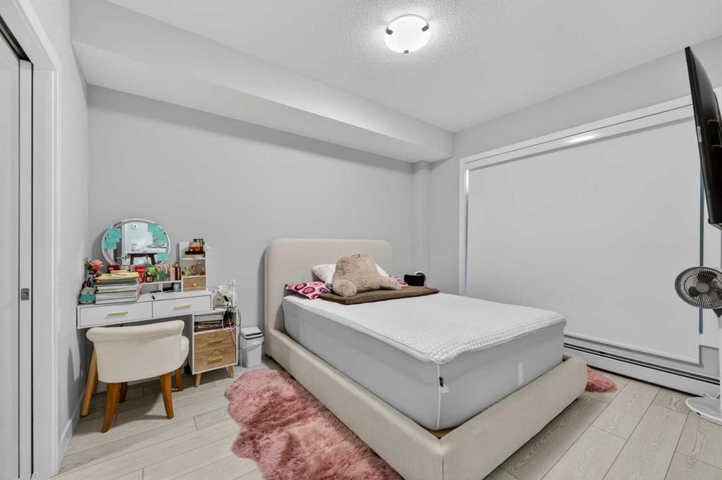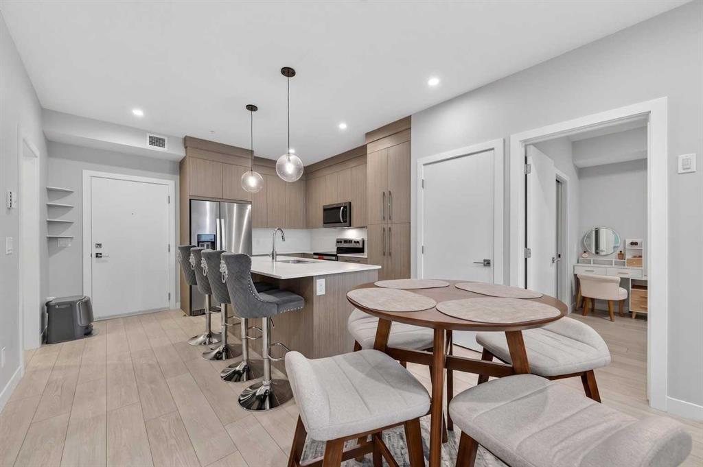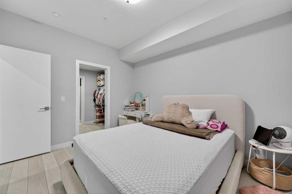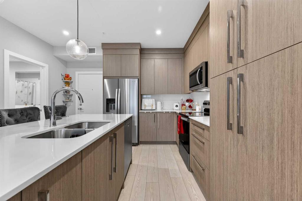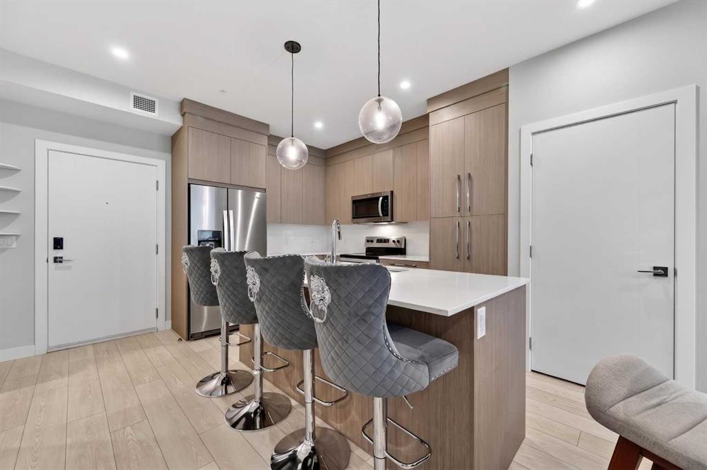 Welcome to this beautiful main-floor West-facing unit, offering over 800sqft of thoughtfully designed living space, complete with underground titled parking. This stunning 2 bed, 2 bath condo features wide plank flooring throughout with open concept living. A stylish chef-inspired kitchen featuring stainless steel appliances, white subway tile backsplash, bright quartz countertops, a pantry, and a kitchen island. A spacious primary bedroom comfortably fits a king-sized bed and includes a walk-through closet leading to a 4-piece ensuite with quartz counters and a glass enclosed shower.The second bedroom is generously sized and located near a modern 3-piece bathroom with sleek finishes and quartz countertops. Enjoy your private patio with a BBQ gas line, ideal for relaxing summer evenings or hosting friends and family. In-suite stacked laundry add to your everyday convenience. This well managed building offers exceptional amenities, including a fitness centre, residents’ lounge, dog wash station, and bike wash area. This condo also comes with 1 underground heated parking stall and a storage locker. Located just steps from restaurants, cafĂ©s, grocery stores, and parks. Everything you need within minutes of your front door.