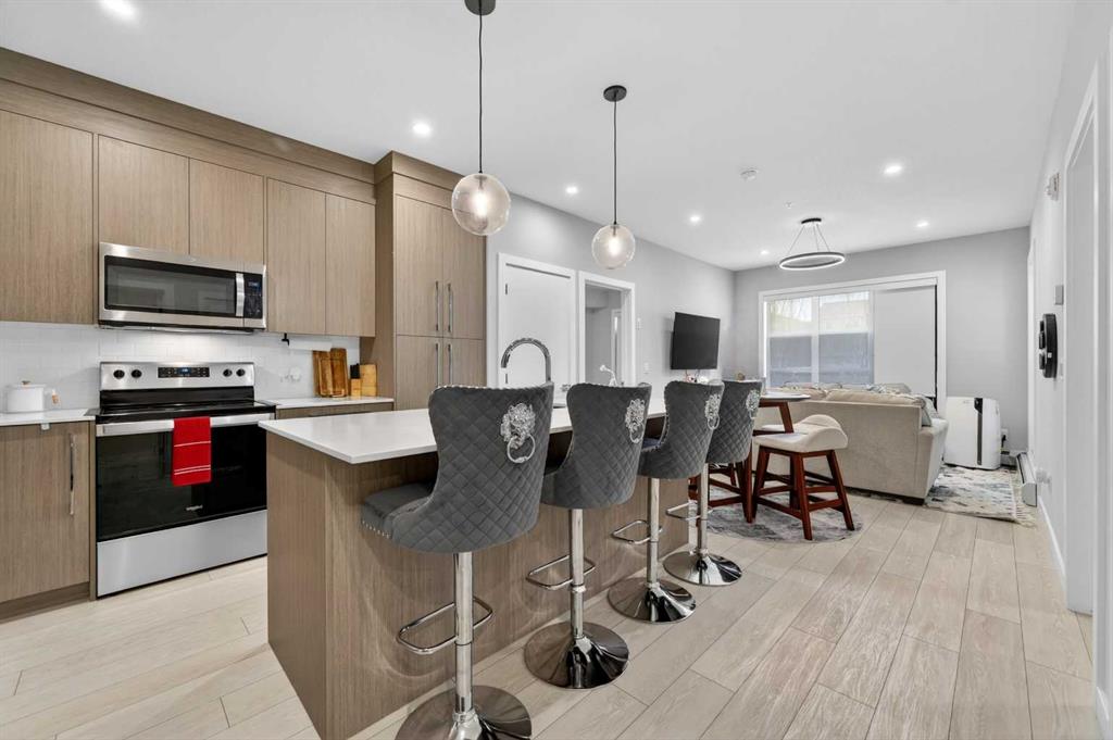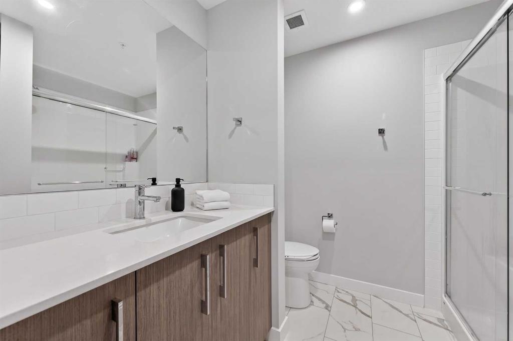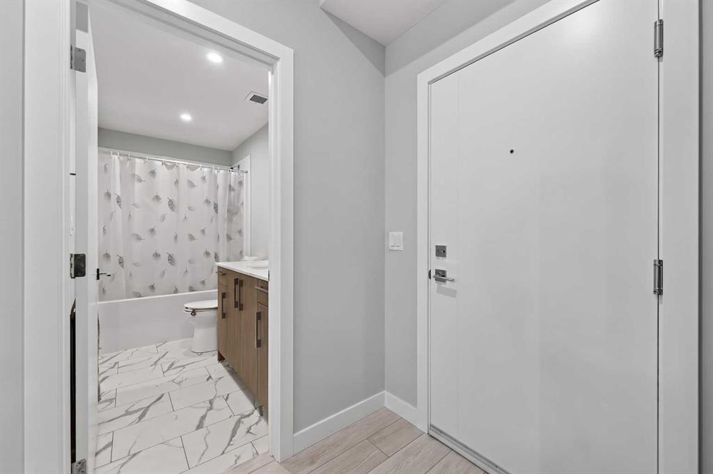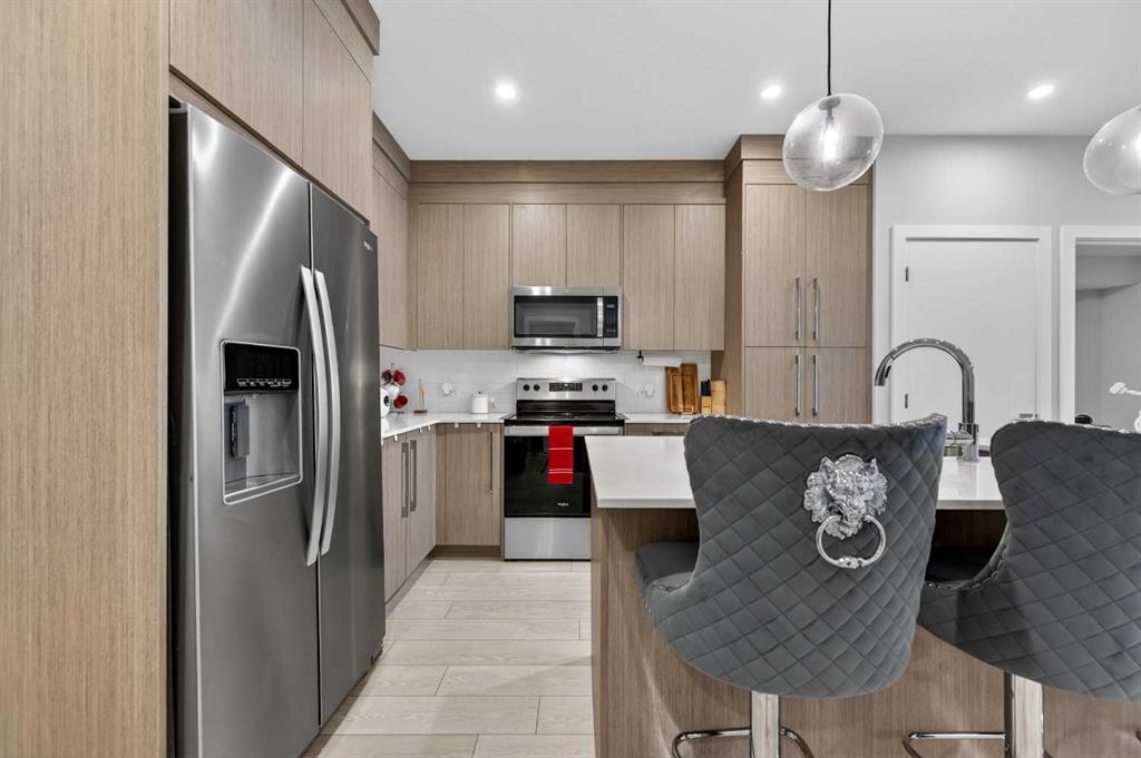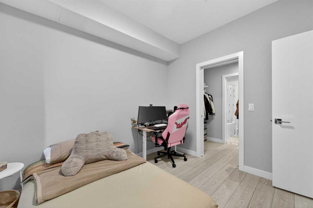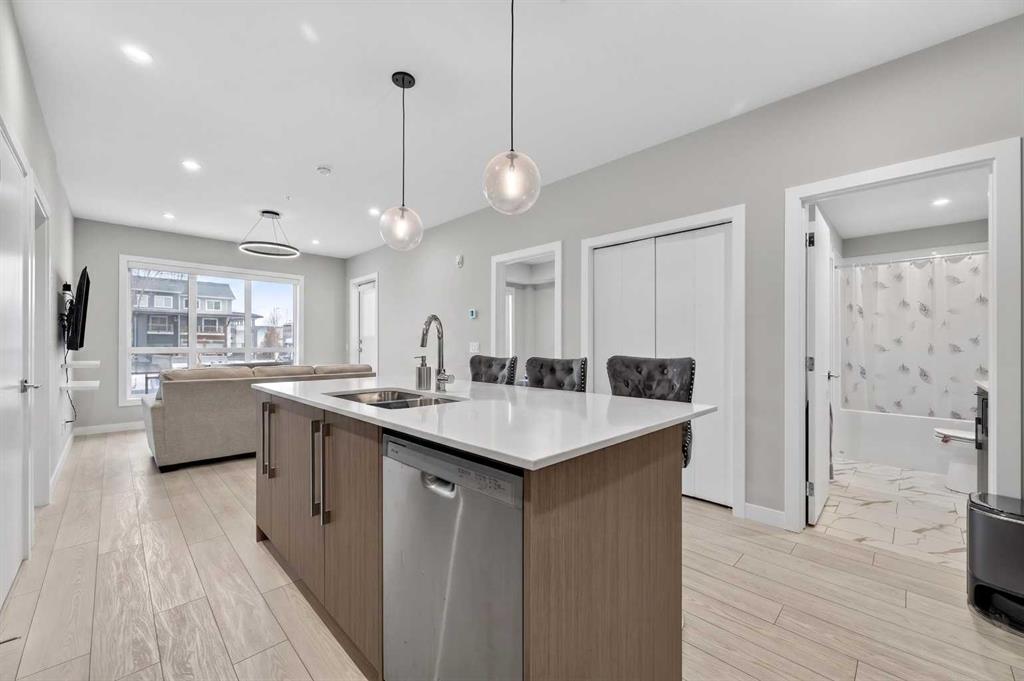 Welcome to this beautiful main-floor West-facing unit, offering over 800sqft of thoughtfully designed living space, complete with underground titled parking. This stunning 2 bed, 2 bath condo features wide plank flooring throughout with open concept living. A stylish chef-inspired kitchen featuring stainless steel appliances, white subway tile backsplash, bright quartz countertops, a pantry, and a kitchen island. A spacious primary bedroom comfortably fits a king-sized bed and includes a walk-through closet leading to a 4-piece ensuite with quartz counters and a glass enclosed shower.The second bedroom is generously sized and located near a modern 3-piece bathroom with sleek finishes and quartz countertops. Enjoy your private patio with a BBQ gas line, ideal for relaxing summer evenings or hosting friends and family. In-suite stacked laundry add to your everyday convenience. This well managed building offers exceptional amenities, including a fitness centre, residents’ lounge, dog wash station, and bike wash area. This condo also comes with 1 underground heated parking stall and a storage locker. Located just steps from restaurants, cafĂ©s, grocery stores, and parks. Everything you need within minutes of your front door.