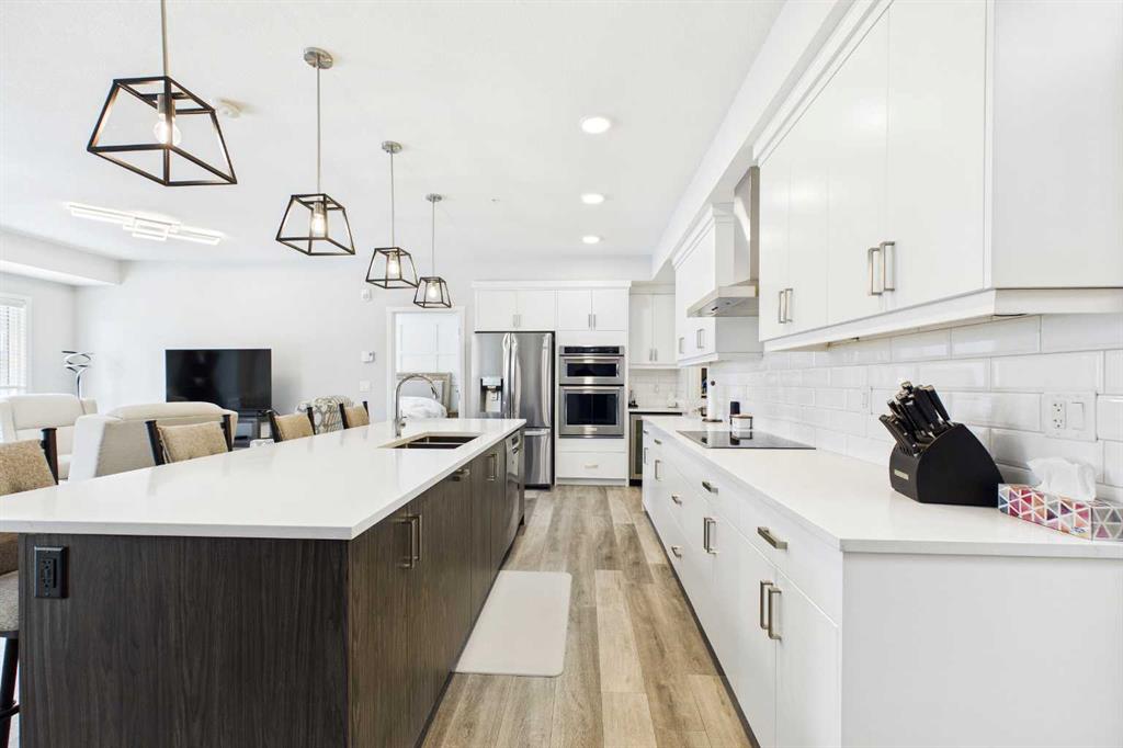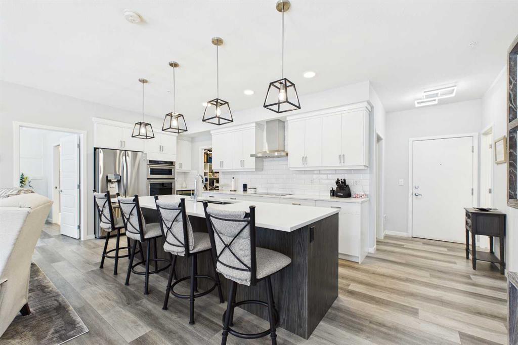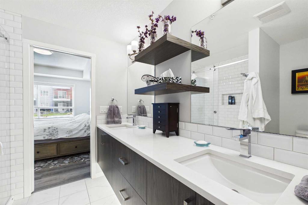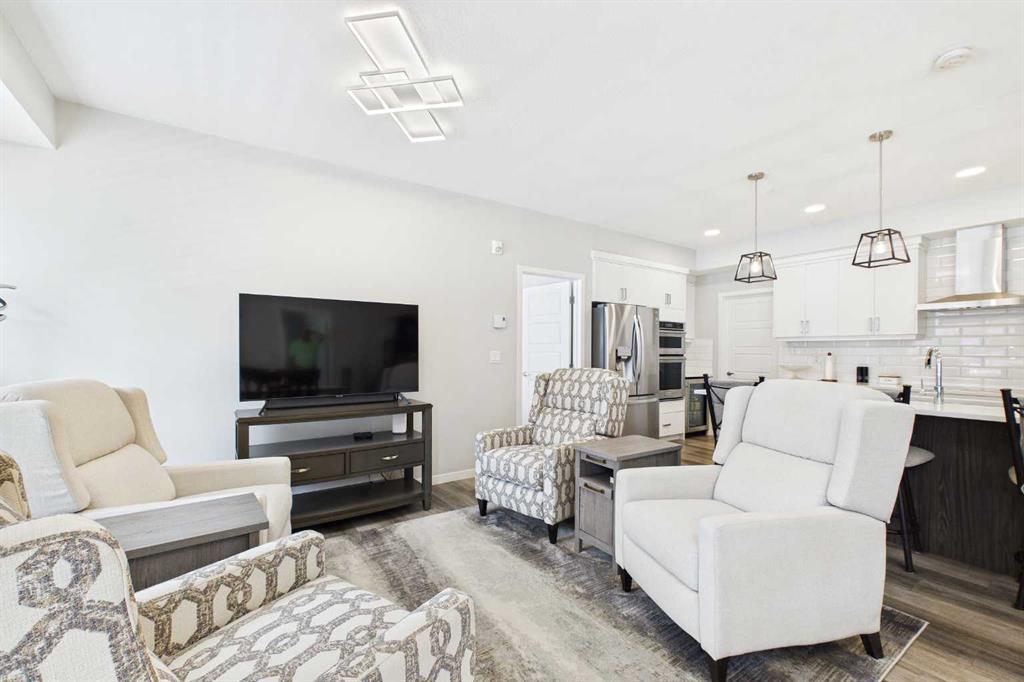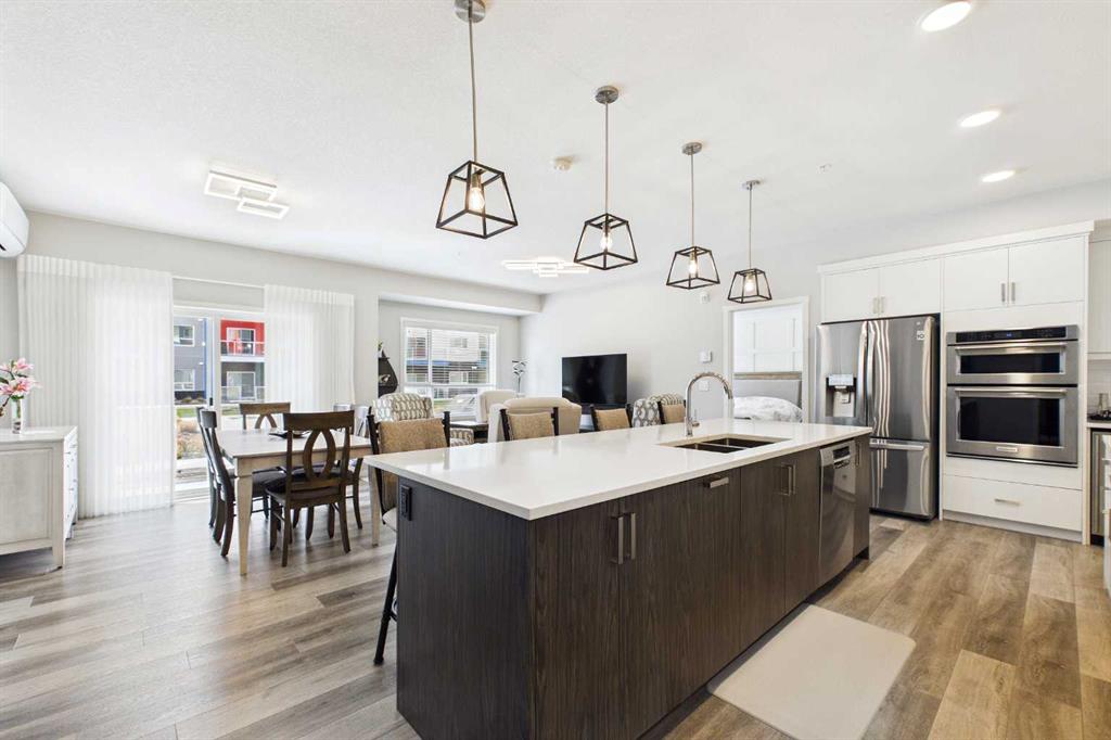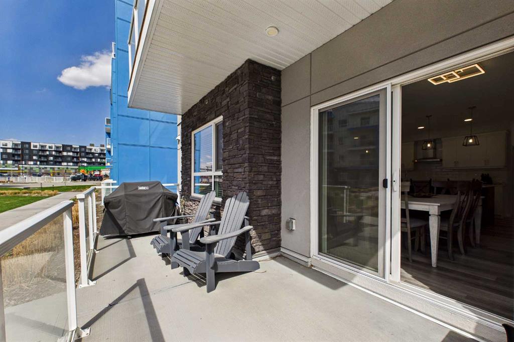 Discover this elegant main-floor, 3-bedroom, 2-bath residence offering an open, light-filled layout and wide-plank laminate flooring throughout. The stylish kitchen showcases full-height white cabinetry, stainless-steel appliances, subway-tile backsplash, and a large quartz island—perfect for casual meals and entertaining. Flowing from the living area, the private patio expands your living space and includes a gas line for effortless summer grilling. The primary suite is a serene retreat with a walk-in closet and a private 4-piece ensuite. Additional highlights include a second full bathroom with dual vanity, upgraded custom walk in closet. in-suite laundry, air conditioning, and dedicated storage.