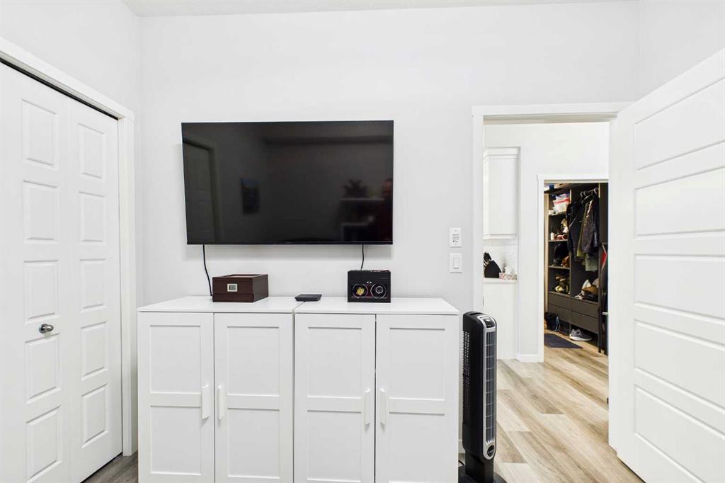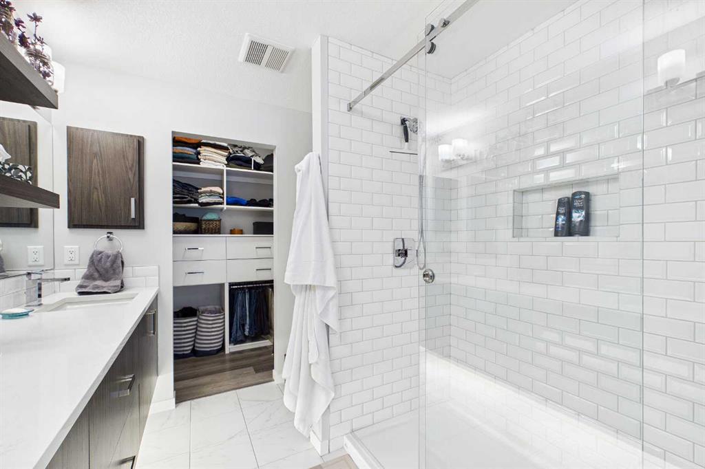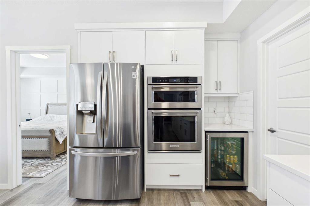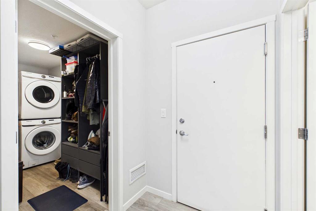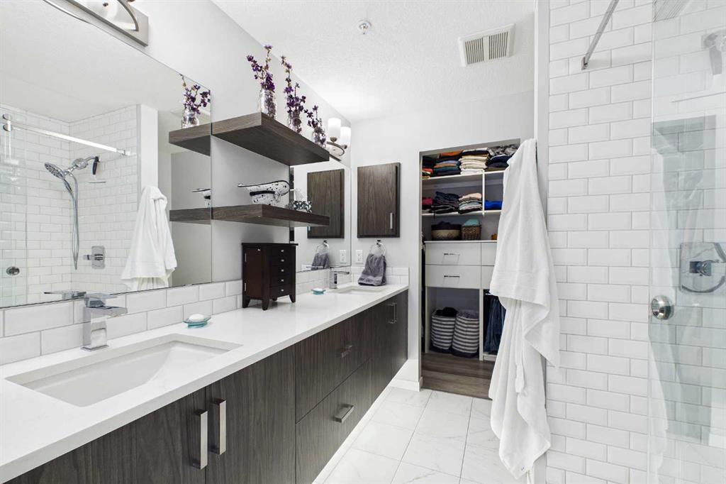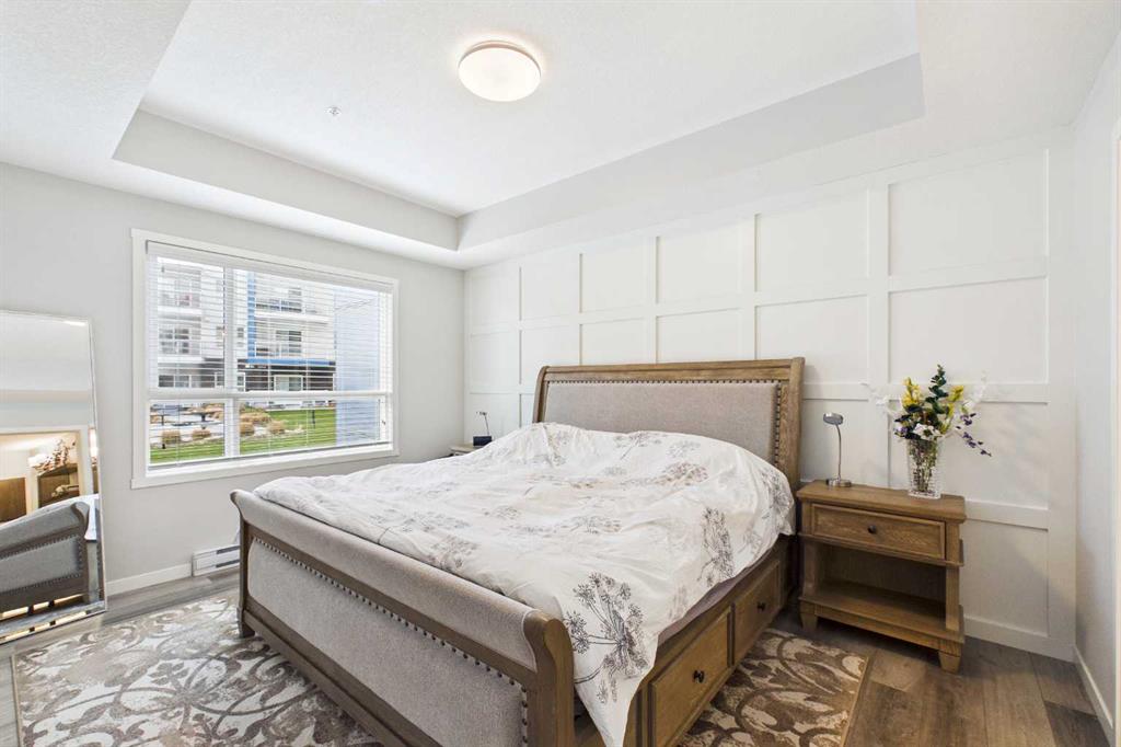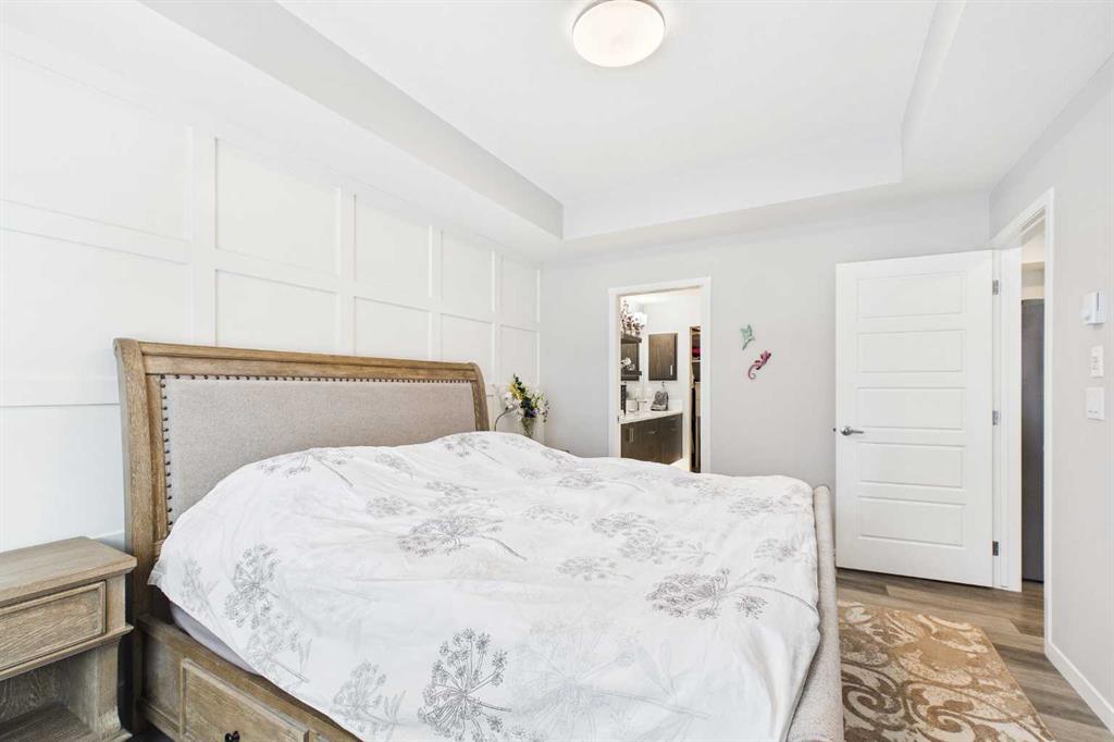 Discover this elegant main-floor, 3-bedroom, 2-bath residence offering an open, light-filled layout and wide-plank laminate flooring throughout. The stylish kitchen showcases full-height white cabinetry, stainless-steel appliances, subway-tile backsplash, and a large quartz island—perfect for casual meals and entertaining. Flowing from the living area, the private patio expands your living space and includes a gas line for effortless summer grilling. The primary suite is a serene retreat with a walk-in closet and a private 4-piece ensuite. Additional highlights include a second full bathroom with dual vanity, upgraded custom walk in closet. in-suite laundry, air conditioning, and dedicated storage.