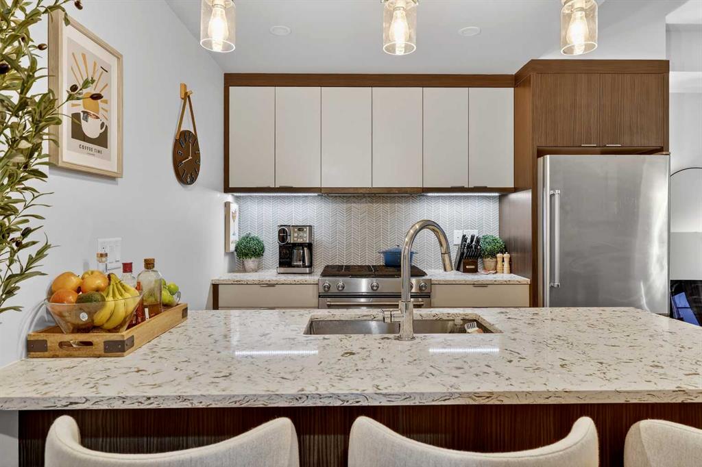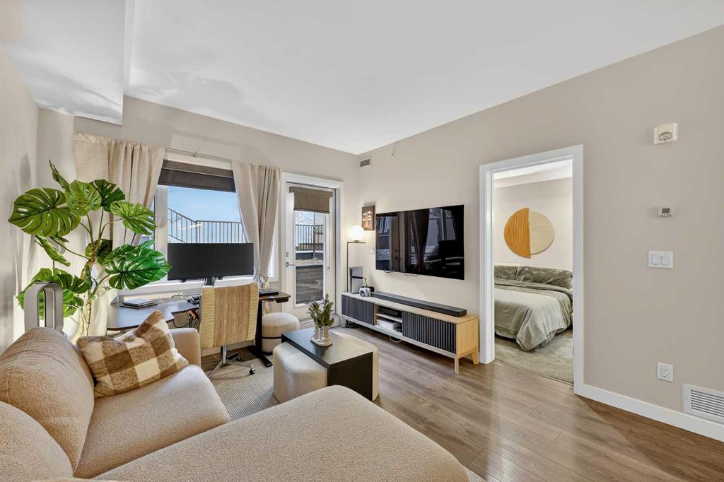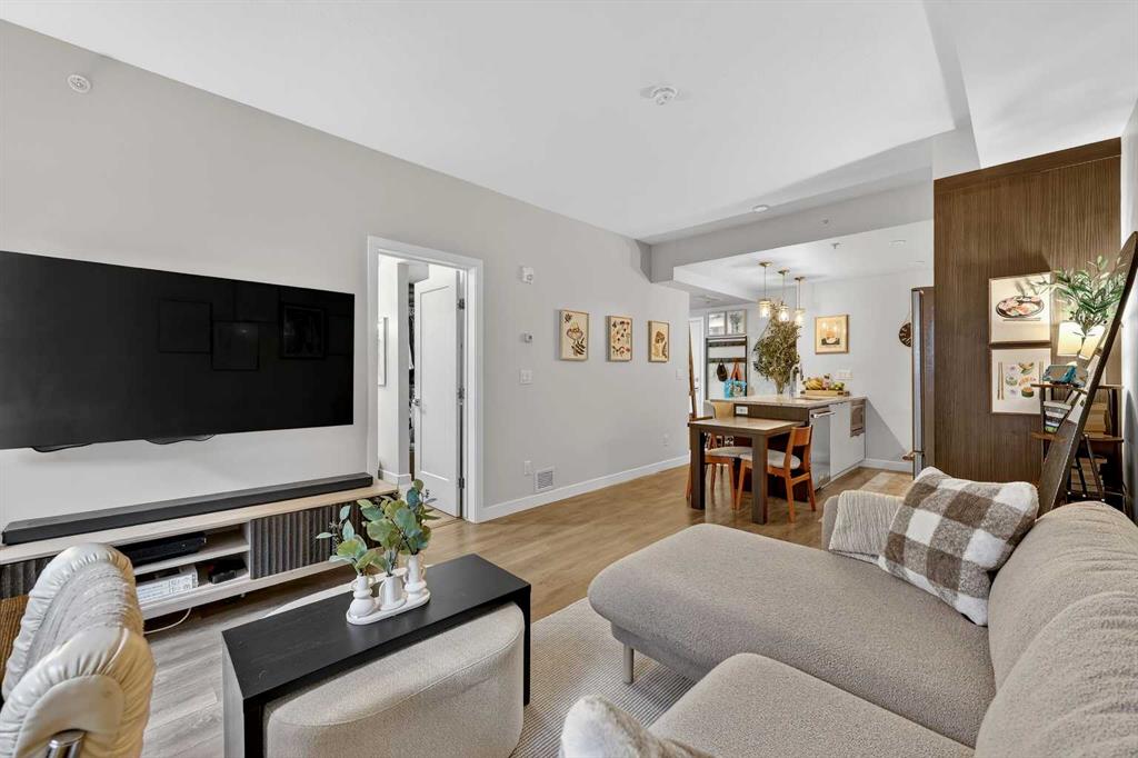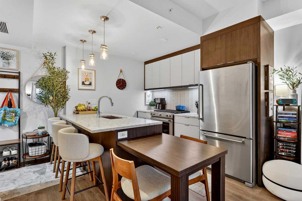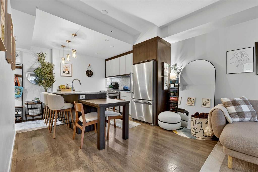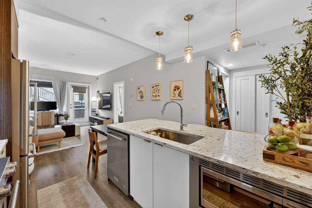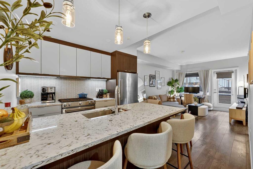 Welcome to COCO, a contemporary residence that defines upscale urban living in the heart of vibrant Marda Loop. Thoughtfully designed with modern sophistication, this air-conditioned one-bedroom home seamlessly blends style, comfort, and everyday functionality. Soaring 9-foot ceilings and sleek laminate flooring enhance the bright, open layout, while the efficient floor plan makes excellent use of every square foot. The kitchen is a true standout, showcasing stainless steel appliances including a gas convection range and concealed slide-out hood fan, complemented by full-height cabinetry, polished quartz countertops, and an extended peninsula—perfect for casual dining, entertaining, or working from home. The open-concept living area is filled with natural light and flows effortlessly onto a spacious private patio with a gas line, creating an ideal space for summer evenings and outdoor enjoyment. The bedroom offers a calm retreat, complete with a walk-through closet leading to a stylish 4-piece bathroom finished with quartz counters, ceramic tile, and a fully tiled tub/shower surround. Additional highlights include in-suite laundry with a full-size washer and dryer, along with a titled, heated underground parking stall for year-round convenience. COCO is a pet-friendly building designed for modern living, with low condo fees that include heat and water, plus access to impressive amenities such as secure bike storage, guest parking, a rentable guest suite, multi-use resident lounge, indoor dog wash, water bottle refill station, and a beautifully landscaped courtyard. Ideally located just steps from shops, restaurants, cafés, fitness studios, parks, and public transit, this home places you at the center of everything Marda Loop has to offer. With refined finishes, smart design, and an unbeatable location, this exceptional property delivers contemporary city living at its finest. Book your private showing today and experience the COCO lifestyle.