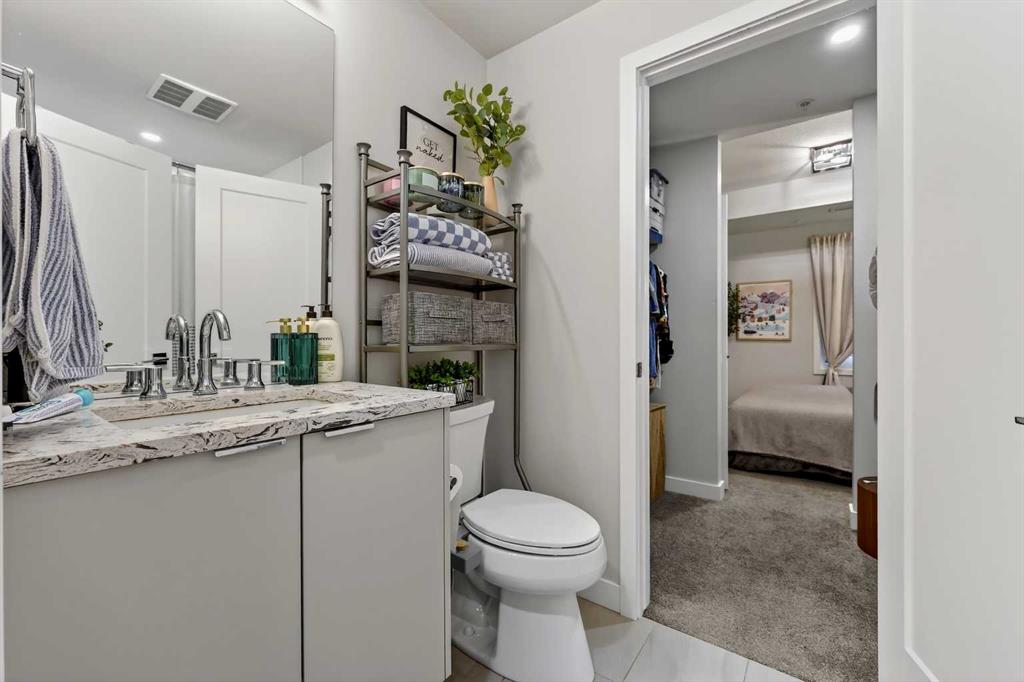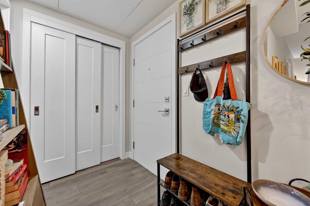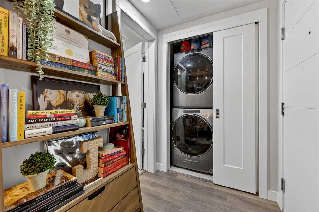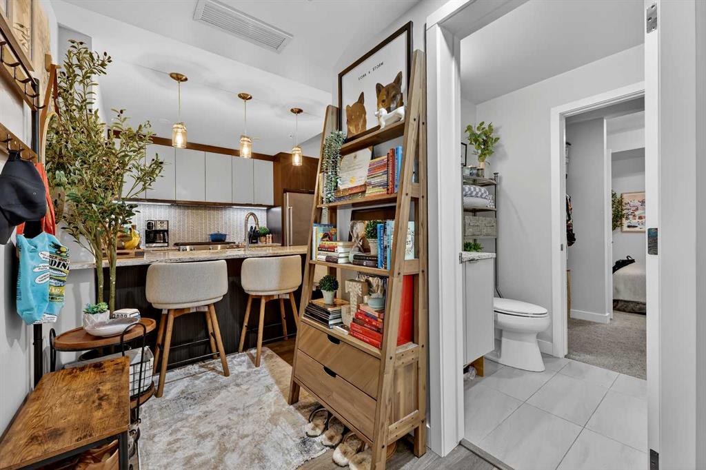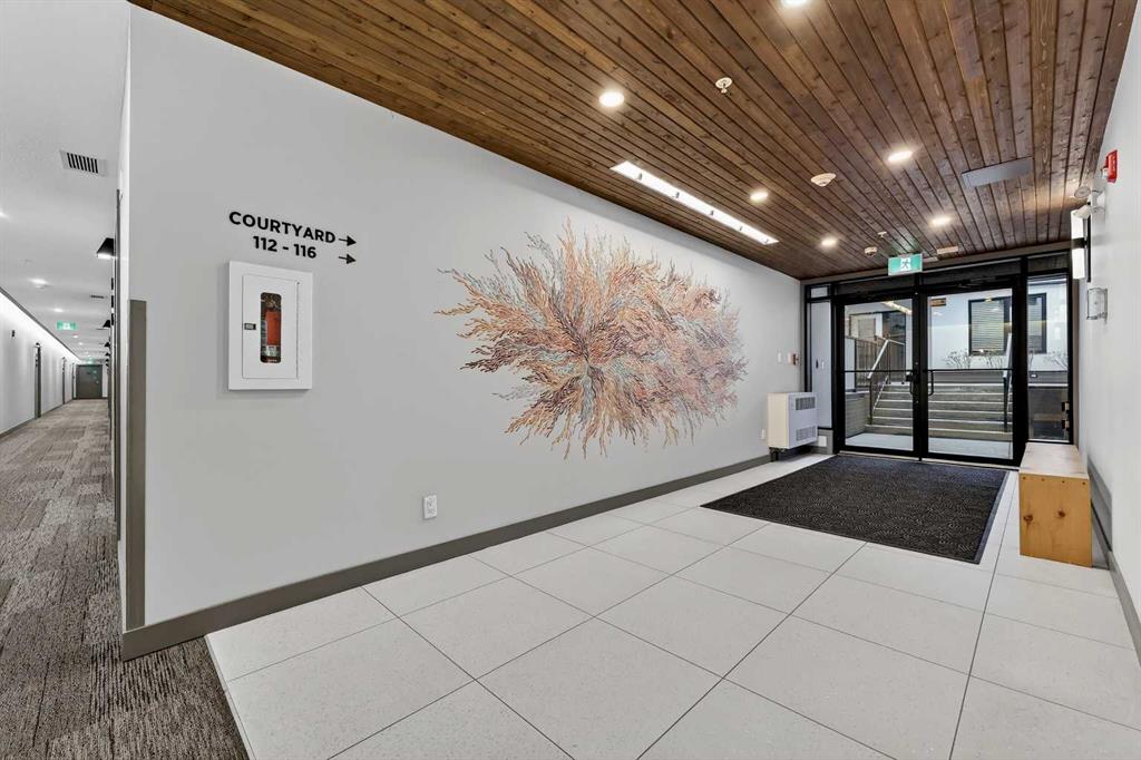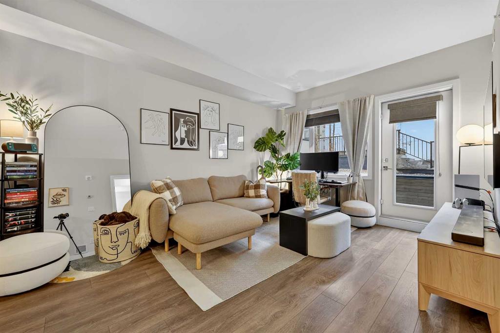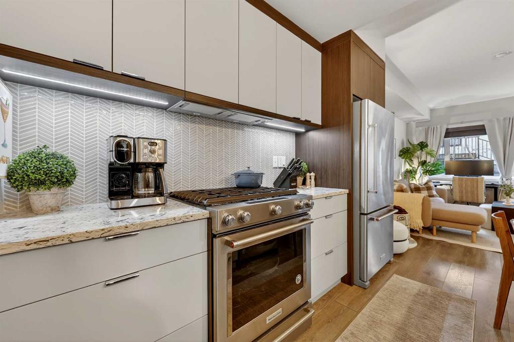 Welcome to COCO, a contemporary residence that defines upscale urban living in the heart of vibrant Marda Loop. Thoughtfully designed with modern sophistication, this air-conditioned one-bedroom home seamlessly blends style, comfort, and everyday functionality. Soaring 9-foot ceilings and sleek laminate flooring enhance the bright, open layout, while the efficient floor plan makes excellent use of every square foot. The kitchen is a true standout, showcasing stainless steel appliances including a gas convection range and concealed slide-out hood fan, complemented by full-height cabinetry, polished quartz countertops, and an extended peninsula—perfect for casual dining, entertaining, or working from home. The open-concept living area is filled with natural light and flows effortlessly onto a spacious private patio with a gas line, creating an ideal space for summer evenings and outdoor enjoyment. The bedroom offers a calm retreat, complete with a walk-through closet leading to a stylish 4-piece bathroom finished with quartz counters, ceramic tile, and a fully tiled tub/shower surround. Additional highlights include in-suite laundry with a full-size washer and dryer, along with a titled, heated underground parking stall for year-round convenience. COCO is a pet-friendly building designed for modern living, with low condo fees that include heat and water, plus access to impressive amenities such as secure bike storage, guest parking, a rentable guest suite, multi-use resident lounge, indoor dog wash, water bottle refill station, and a beautifully landscaped courtyard. Ideally located just steps from shops, restaurants, cafés, fitness studios, parks, and public transit, this home places you at the center of everything Marda Loop has to offer. With refined finishes, smart design, and an unbeatable location, this exceptional property delivers contemporary city living at its finest. Book your private showing today and experience the COCO lifestyle.