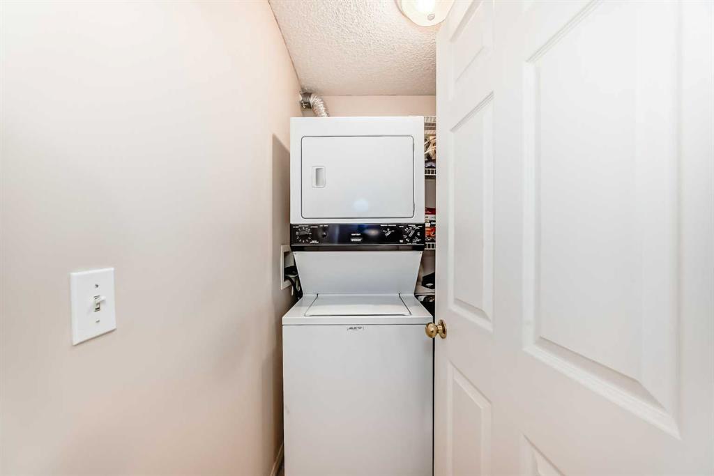 The large laundry room provides ample storage and includes a stackable washer and dryer. A full four-piece bathroom , and a spare bedroom is great for your overnight guests. The spare room would make a great home office, with all its natural light. Sliding patio doors from the living room leads to an east-facing patio, complete with a gas outlet for BBQ-ing. The patio also features a private storage room with shelving for added convenience.