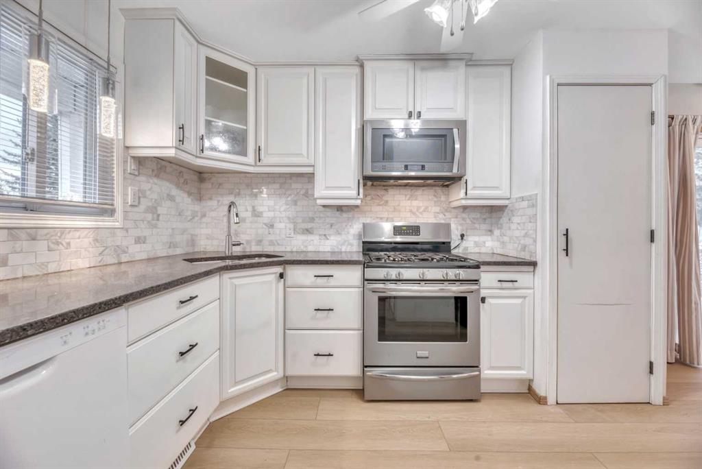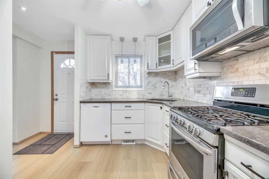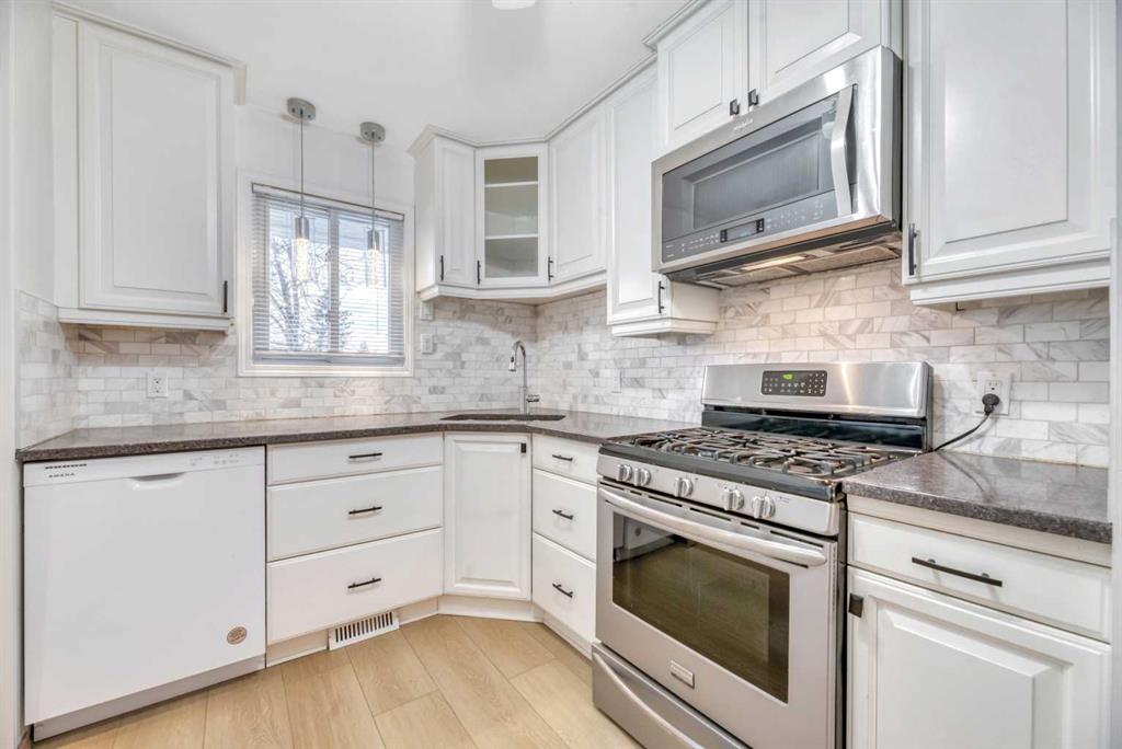 Inside, the home feels bright, open, and inviting, with an abundance of natural light throughout. The updated kitchen is both stylish and functional, featuring stainless steel appliances including a gas stove and over-the-range microwave, bright white cabinetry, a modern backsplash, and granite countertops. The kitchen flows seamlessly into the dining area, creating an ideal space for everyday living and entertaining, while wide plank laminate flooring adds warmth and durability throughout the main living areas. The living room also features brand-new carpet that has never been lived on, providing a fresh and comfortable space to relax.