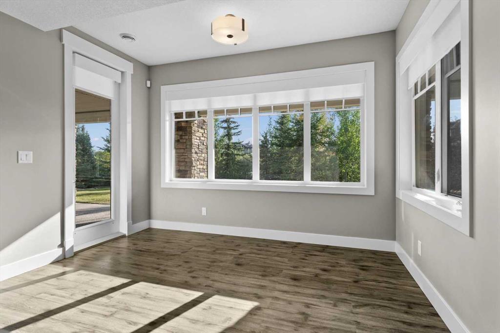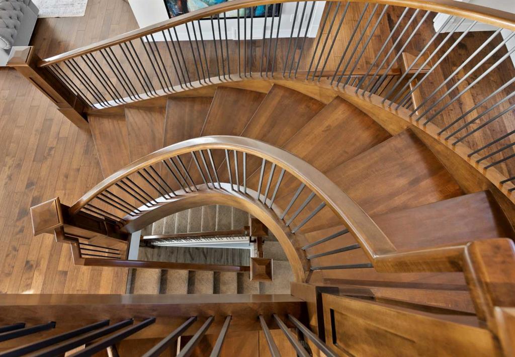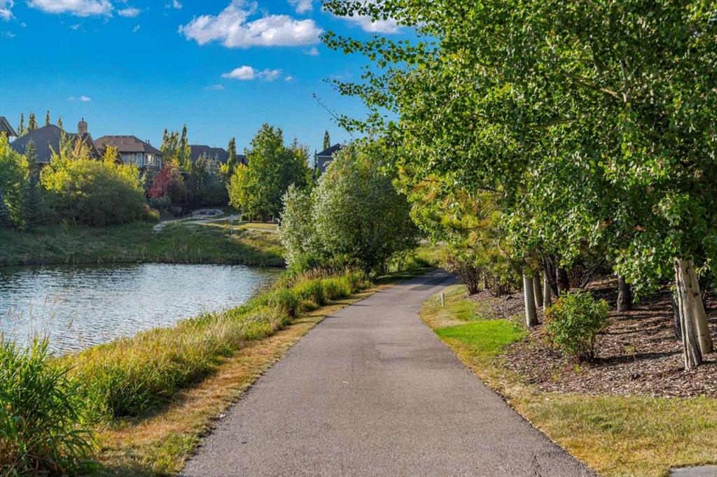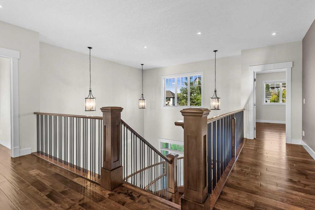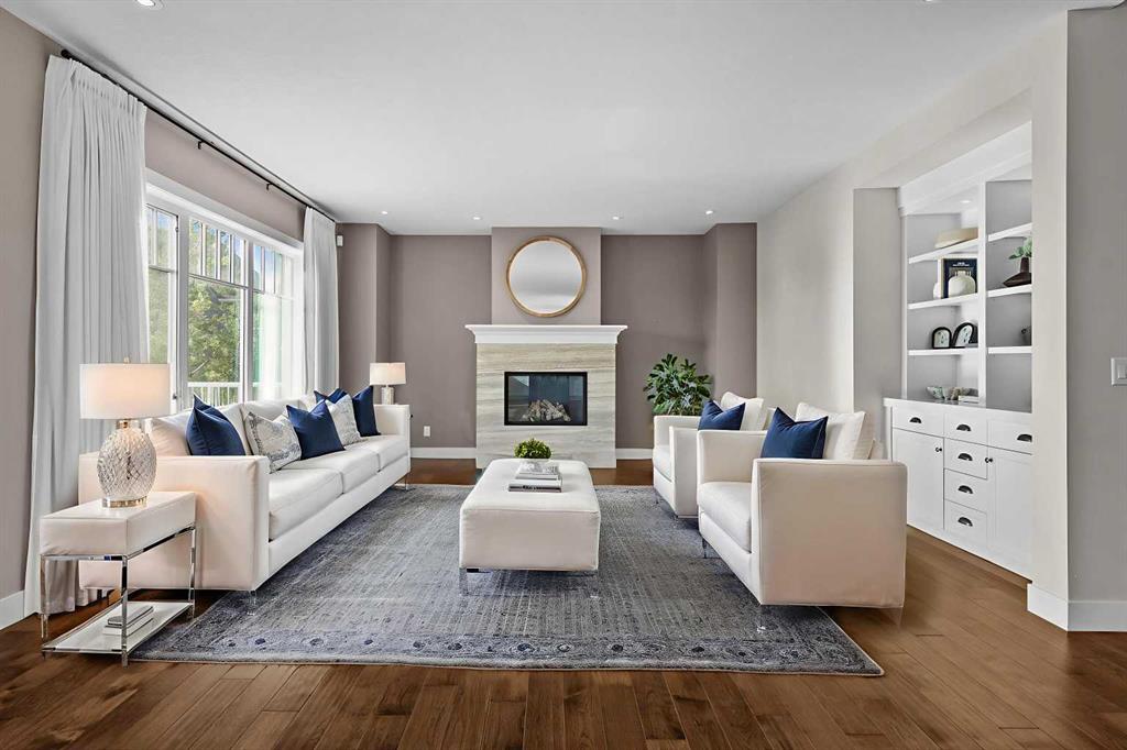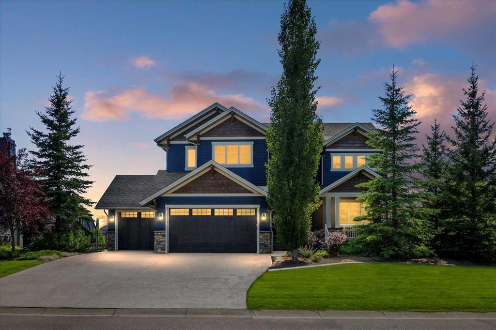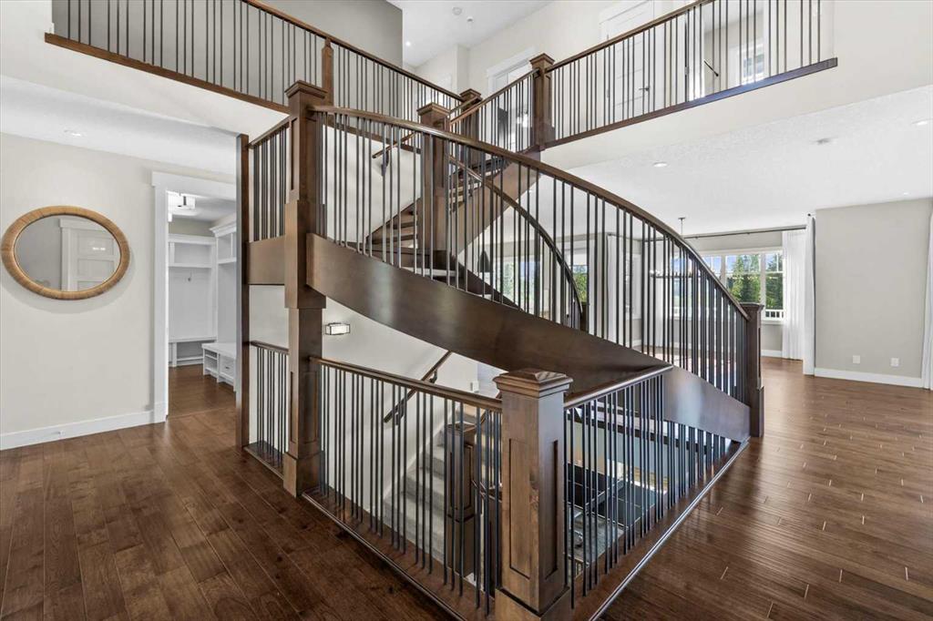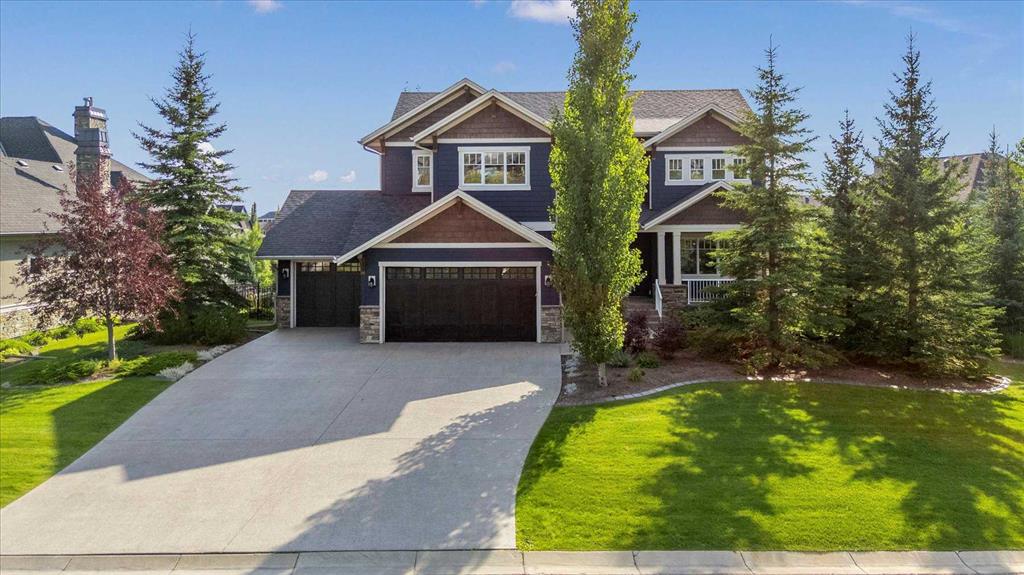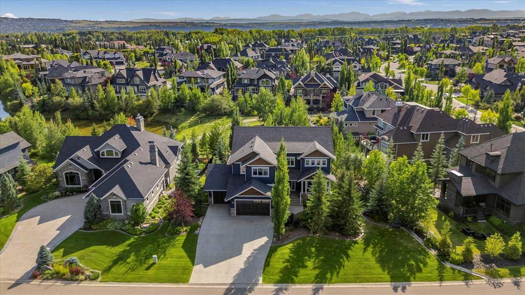 Set in one of Watermark’s most coveted locations, a quiet cul-de-sac backing southwest onto green space with tranquil pond and stunning Rocky Mountain views, this custom built two-storey walkout by Wolf Custom Homes offers over 4500sqft of thoughtfully designed living space. Entering the home you are immediately captivated by the millwork on the artisanal curved wood staircase, the natural light streaming throughout the home and the serenity of the stunning views. The main floor is ideal for family connection and entertaining featuring an expansive great room with focal gas fireplace and custom cabinetry, a spacious dining area, and a chef-inspired kitchen with Calcutta Marble quartz countertops, premium JennAir appliances, and walk-through butler’s pantry with exceptional storage. An expansive southwest deck off the kitchen and dining area is perfect for weekend BBQ’s, outdoor dining or simply relaxing in the sunshine. Working from home is easy with the private office with double french doors on the main floor, while the large mudroom with custom built-ins keeps family life organized. On the upper level hardwood floors lead to four generous bedrooms and three full bathrooms, including a luxurious primary suite with vaulted ceilings, spectacular mountain views, a walk-in dressing room with custom cabinetry, and a spa-inspired ensuite featuring heated floors, dual vanities, a deep soaker tub, and a 10mm glass shower with dual rain heads. Two of the upper bedrooms share a Jack & Jill bathroom, and the fourth has its own private bath—ideal for teens or guests. A large laundry room on the upper level adds everyday convenience. The walkout lower level features in-slab heating and is perfect for movie nights or entertaining with the spacious family room and wet bar. Additionally on the lower level is a fifth bedroom that can double as a gym or second home office, a full bathroom, and plentiful storage. The private backyard continues the theme of exceptional living with professional landscaping, mature trees, fire pit conversation area, discreetly positioned hot tub, irrigation system and an abundance of space to play and entertain. Not to be missed is the finished oversized triple garage with polyaspartic flooring, slat walls, extensive built-in storage and EV charger. Recent updates to the home include servicing of furnaces, hot water tank, and A/C units; new light fixtures above island and in dining area, new wine fridge and icemaker in wet bar, hot tub, polyaspartic flooring and shelves in garage, mirrored wall in 5th bedroom, re-tiled shower base in ensuite, and addition of children’s play space under the stairs. Awarded Canada’s Community of the Year multiple times, Watermark features over 5km of paved trails, a network of cascading ponds and streams, community playgrounds and a Central Plaza. Exceptional access to several golf courses, the Rocky Mountains, Stoney Trail and downtown Calgary.