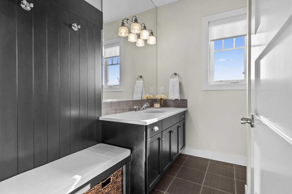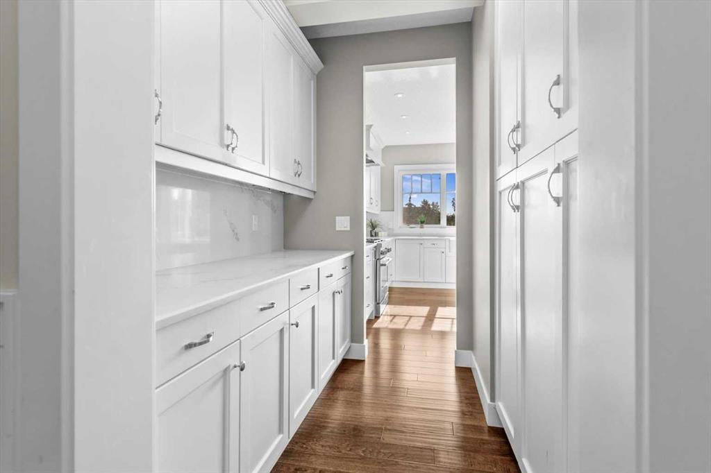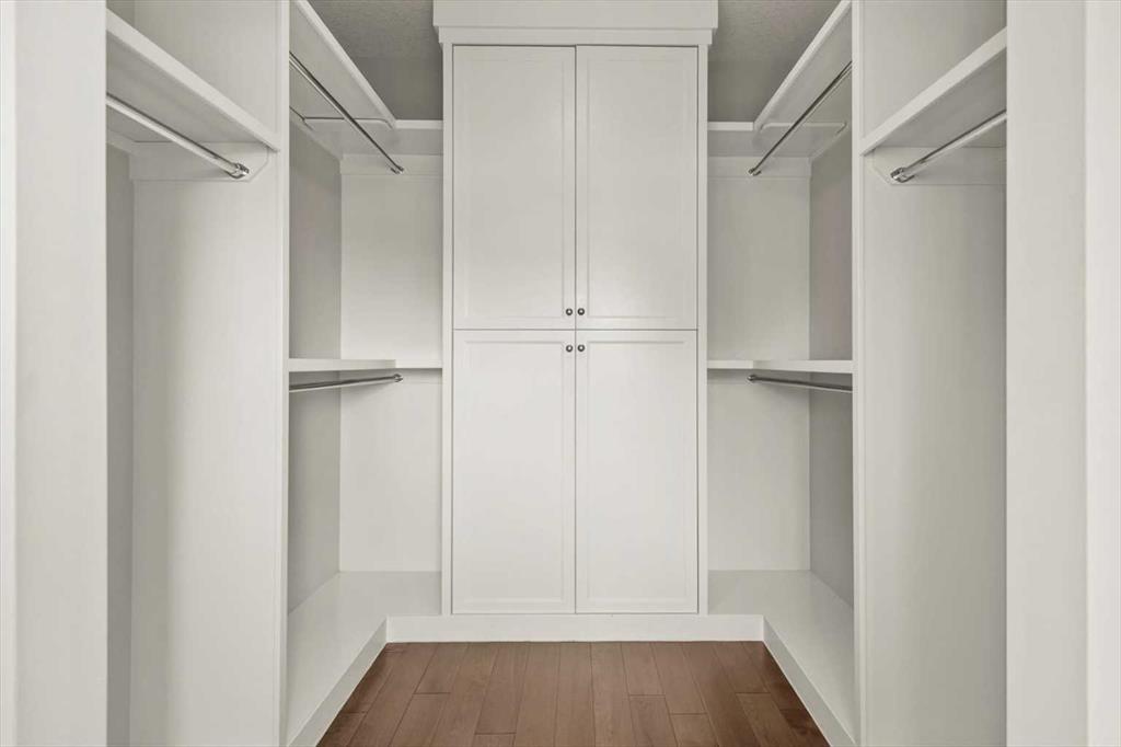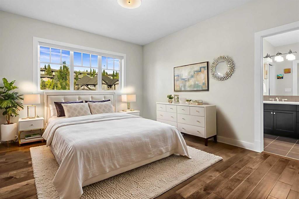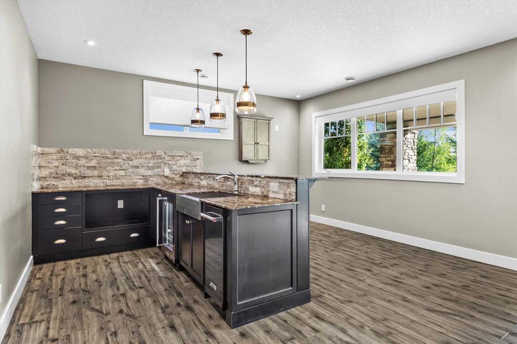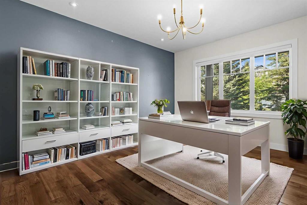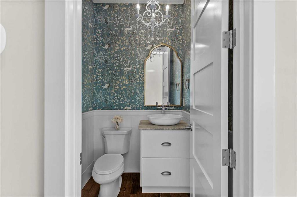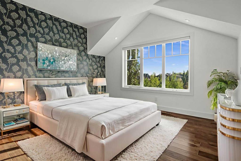 Set in one of Watermark’s most coveted locations, a quiet cul-de-sac backing southwest onto green space with tranquil pond and stunning Rocky Mountain views, this custom built two-storey walkout by Wolf Custom Homes offers over 4500sqft of thoughtfully designed living space. Entering the home you are immediately captivated by the millwork on the artisanal curved wood staircase, the natural light streaming throughout the home and the serenity of the stunning views. The main floor is ideal for family connection and entertaining featuring an expansive great room with focal gas fireplace and custom cabinetry, a spacious dining area, and a chef-inspired kitchen with Calcutta Marble quartz countertops, premium JennAir appliances, and walk-through butler’s pantry with exceptional storage. An expansive southwest deck off the kitchen and dining area is perfect for weekend BBQ’s, outdoor dining or simply relaxing in the sunshine. Working from home is easy with the private office with double french doors on the main floor, while the large mudroom with custom built-ins keeps family life organized. On the upper level hardwood floors lead to four generous bedrooms and three full bathrooms, including a luxurious primary suite with vaulted ceilings, spectacular mountain views, a walk-in dressing room with custom cabinetry, and a spa-inspired ensuite featuring heated floors, dual vanities, a deep soaker tub, and a 10mm glass shower with dual rain heads. Two of the upper bedrooms share a Jack & Jill bathroom, and the fourth has its own private bath—ideal for teens or guests. A large laundry room on the upper level adds everyday convenience. The walkout lower level features in-slab heating and is perfect for movie nights or entertaining with the spacious family room and wet bar. Additionally on the lower level is a fifth bedroom that can double as a gym or second home office, a full bathroom, and plentiful storage. The private backyard continues the theme of exceptional living with professional landscaping, mature trees, fire pit conversation area, discreetly positioned hot tub, irrigation system and an abundance of space to play and entertain. Not to be missed is the finished oversized triple garage with polyaspartic flooring, slat walls, extensive built-in storage and EV charger. Recent updates to the home include servicing of furnaces, hot water tank, and A/C units; new light fixtures above island and in dining area, new wine fridge and icemaker in wet bar, hot tub, polyaspartic flooring and shelves in garage, mirrored wall in 5th bedroom, re-tiled shower base in ensuite, and addition of children’s play space under the stairs. Awarded Canada’s Community of the Year multiple times, Watermark features over 5km of paved trails, a network of cascading ponds and streams, community playgrounds and a Central Plaza. Exceptional access to several golf courses, the Rocky Mountains, Stoney Trail and downtown Calgary.