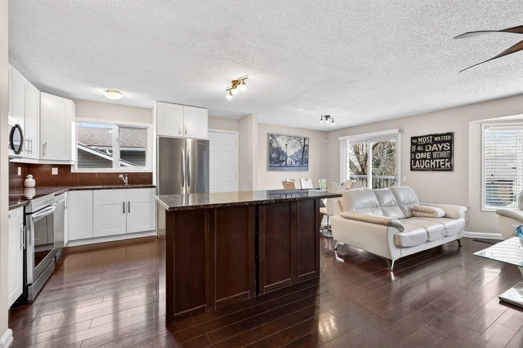 The main level features a bright open-concept layout finished in light contemporary colours and complemented by hardwood flooring throughout. The spacious kitchen offers ample white cabinetry, granite-topped island, counters and stainless steel appliances, opening onto a dining area surrounded by large windows that fill the space with natural light. The adjoining living room, complete with two white leather couches, creates a comfortable and inviting setting for everyday living. Three generously sized bedrooms complete this level, including a primary suite with a walk-in closet and a four-piece ensuite, along with an additional full bathroom.
