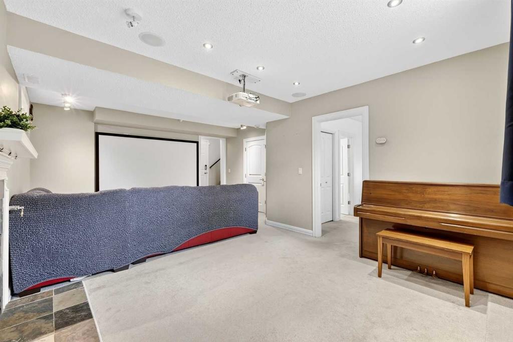 A privacy door at the main entrance leads to the fully finished lower level, providing excellent flexibility for extended family, guests, or potential development into an illegal suite with minor modifications. This warm and welcoming space features plush carpeting, large windows, and a spacious family room anchored by a wood-burning fireplace with log lighter, mantle, and tile surround. The included sectional couch, entertainment unit, and piano make the room feel complete and ready to enjoy. A fourth bedroom with a large window and closet, along with a Jack and Jill four-piece bathroom, adds to the functionality and comfort of the lower level.
