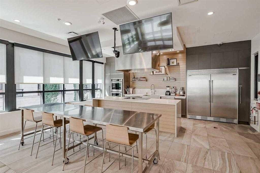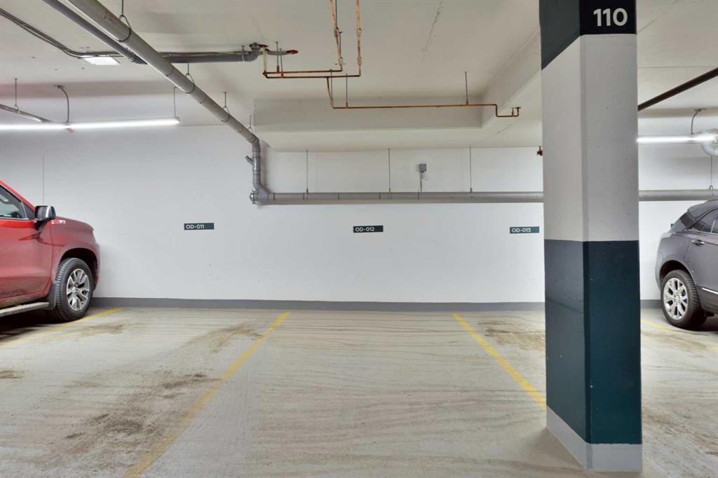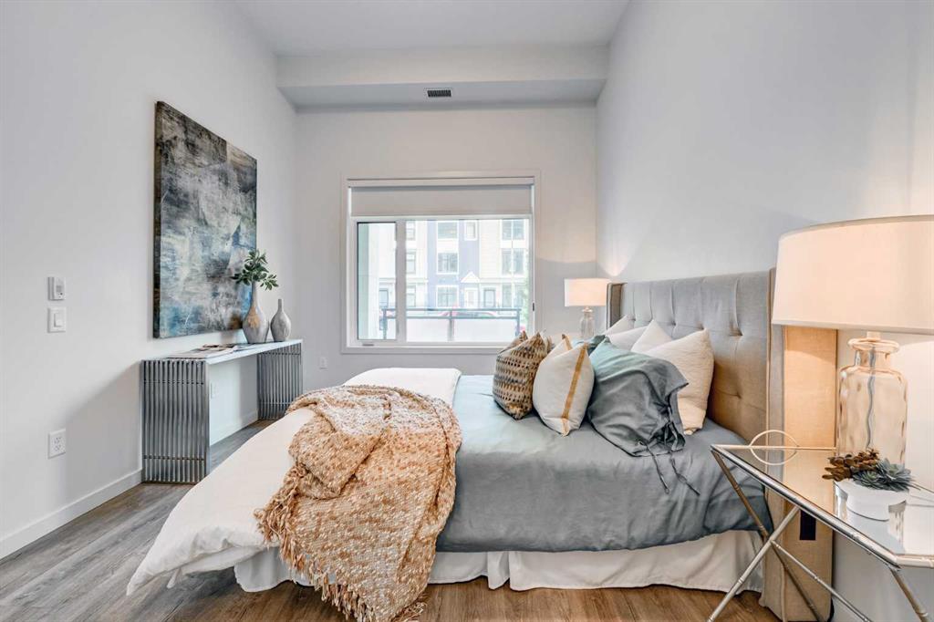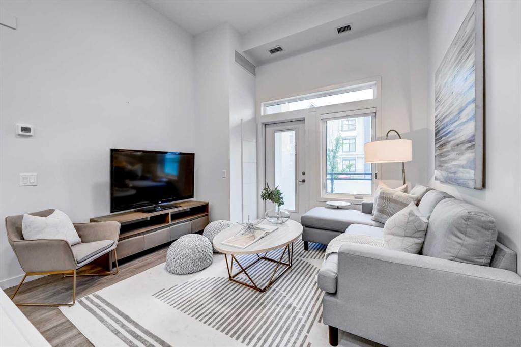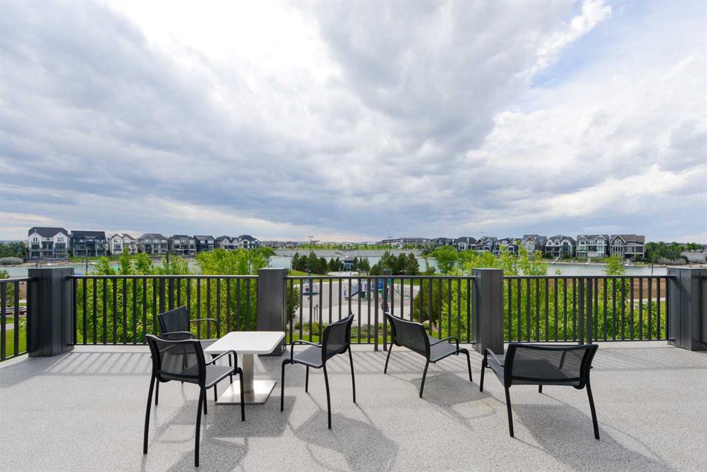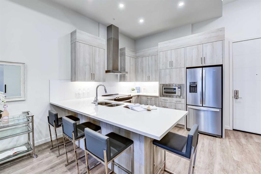 Discover the ultimate resort-style living in Westman Village, Calgary’s most sought-after lakeside community. Nestled in the exclusive 55+ building, this south-facing, nearly 1,000 sq. ft. ground floor home offers 2 bedrooms, 2 bathrooms, 2 TITLED parking stalls, soaring 12-foot ceilings, and a private exterior door for easy access for visitors or dog walks. This home offers an elevated lifestyle for those looking to downsize without compromise. The unit and building are wheelchair accessible with wide hallways & doorways. From the moment you enter this sun-soaked home, the soaring ceilings and bright, modern finishes create a warm and inviting atmosphere. The open-concept kitchen is beautifully designed with sleek cabinetry, quartz countertops, and high-end finishes, making it as functional as it is elegant. The spacious living and dining areas are ideal for entertaining or quiet evenings at home. The spacious primary bedroom can easily fit a king-sized bed. The large primary ensuite features a large walk-in shower and modern finishes, and the double closets offer ample storage. The second bedroom and bathroom are on the opposite side of the unit and provide the option for a den, media room or office space. A true standout feature of this home is the massive outdoor patio that offers 232 feet of additional living space and direct access for your visitors. For added convenience, this unit includes two storage spaces, one in the parking stall and a 6×6 storage unit with easy elevator access. The 40,000 sq. ft. Village Centre is connected via a +15, 2nd-floor indoor walkway with a party/social room, a billiards room, a fully equipped wood working shop, an art room, a golf simulator, a theatre, a fitness center, and more. The Village Centre includes Concierge services (7am to 11pm) and 24/7 security. If you’re looking for a welcoming, low-maintenance, & upscale place to call home, this is your chance to experience the best in 55+ living!
