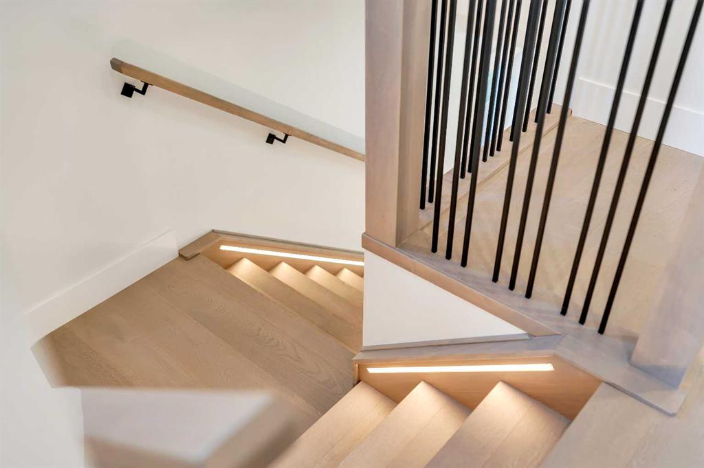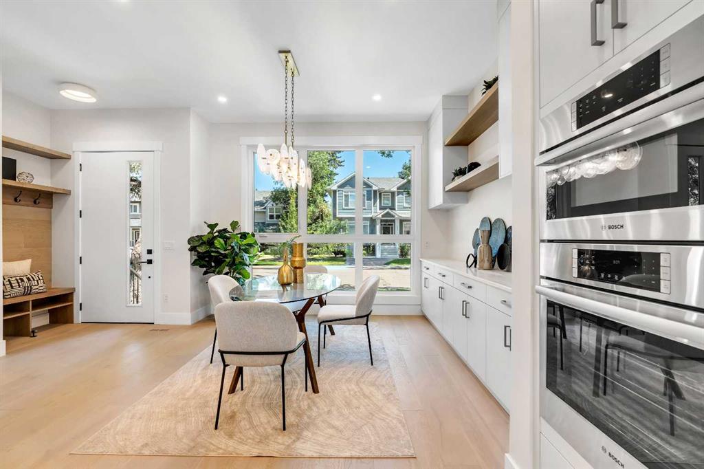The main floor opens with a welcoming front foyer and a bright dining area positioned at the front of the home, perfect for cozy dinners or entertaining guests. The designer kitchen sits at the center, anchoring the space with a large island, quartz countertops, a built-in pantry, and a premium appliance package that includes a gas cooktop and a French door fridge/freezer. At the rear, the living room feels like a retreat, complete with a sleek fireplace, large windows, and easy access to the back deck and a double detached garage. A designer powder room is privately tucked away off the mudroom, and the built-ins here add everyday convenience without compromising on style.
