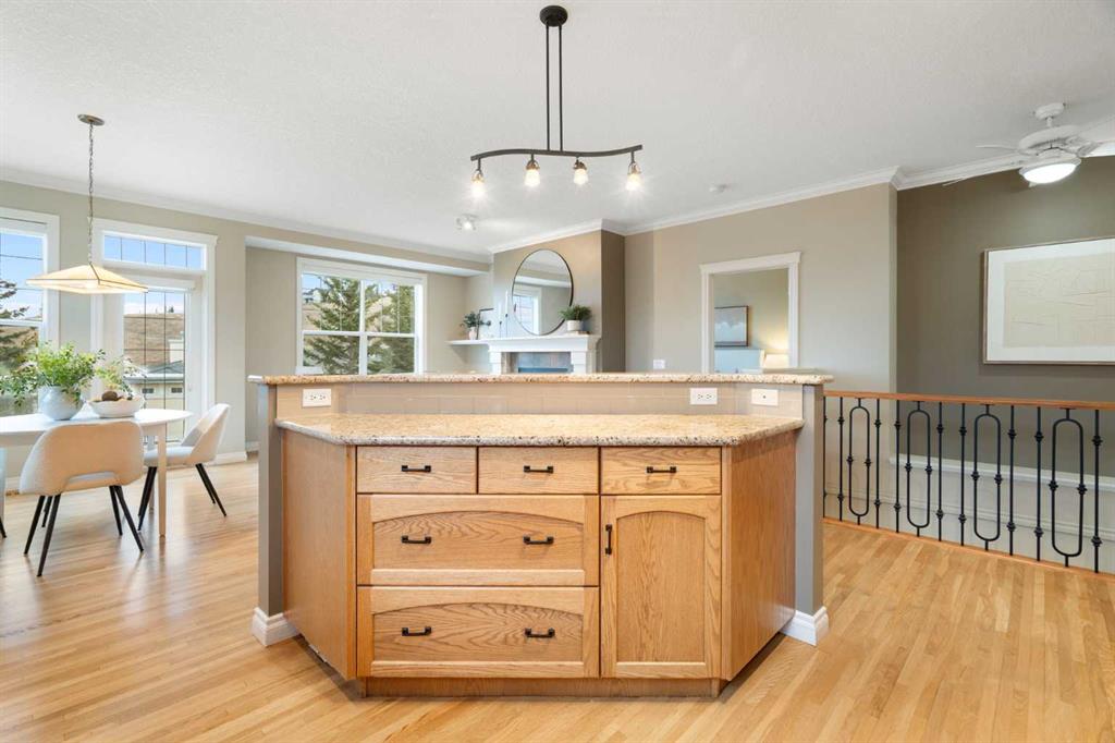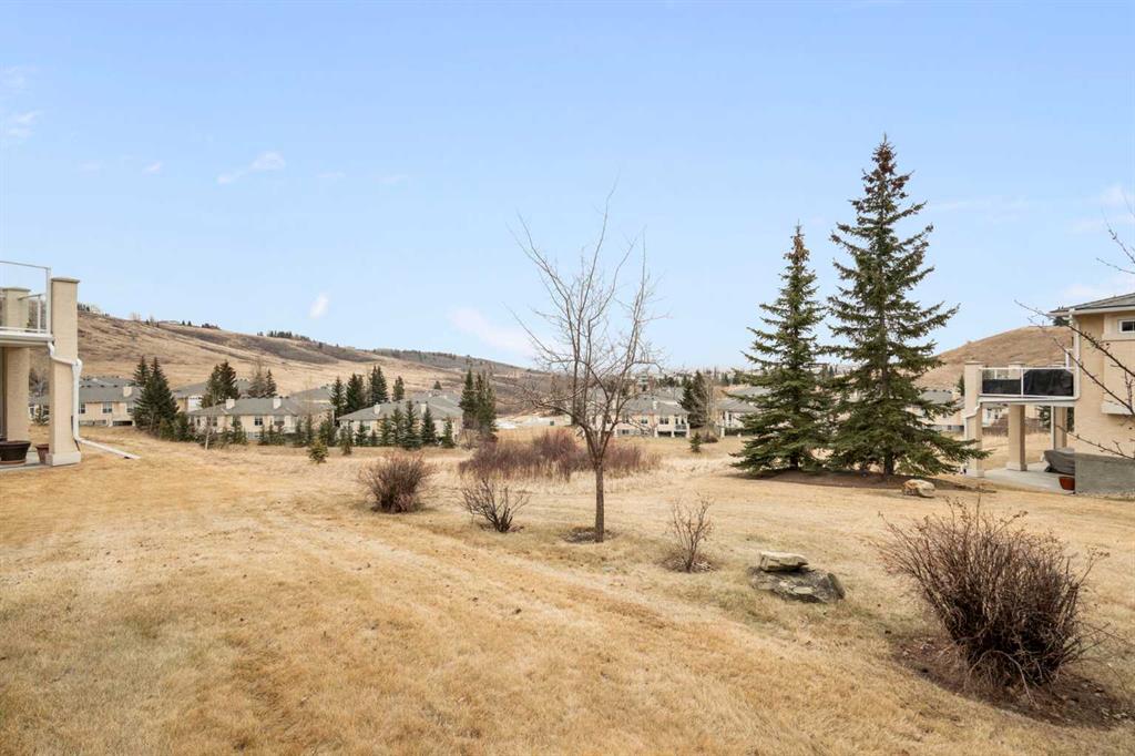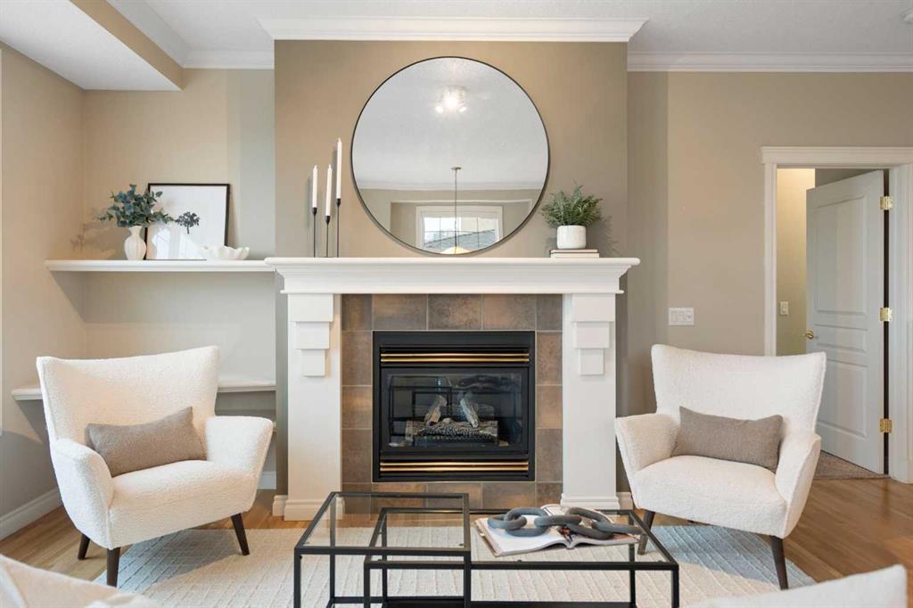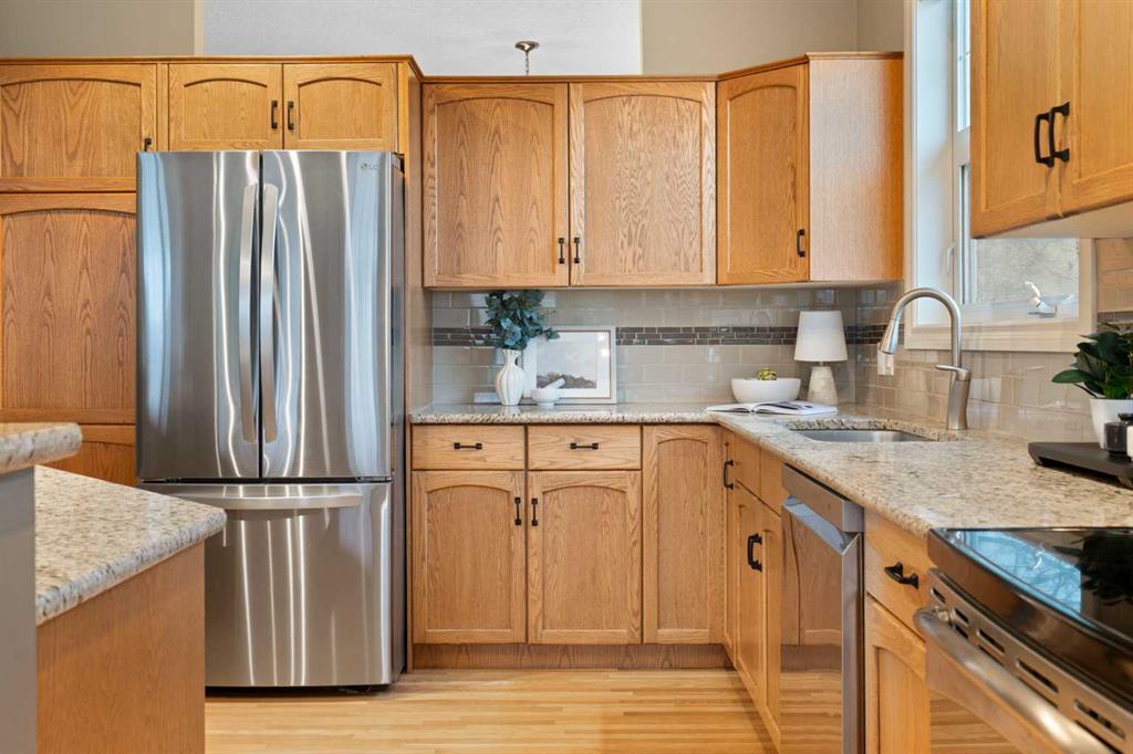 Hello, Gorgeous! Located in the desirable community of GlenEagles in Cochrane, this well-maintained walkout bungalow offers 1,408 sq. ft. above grade plus a fully developed lower level. The main floor features a bright living room with fireplace and valley views, a kitchen with granite countertops and raised island, a breakfast nook with access to the south-facing deck, and a formal dining area. A dedicated main-floor office/den provides flexibility for working from home. The primary bedroom includes a walk-in closet and 5-piece ensuite with in-floor heating and updated glass shower. Main-floor laundry and a powder room add convenience. The fully developed walkout basement offers two additional bedrooms, a 3-piece bathroom, a spacious recreation room with second fireplace, and access to the lower patio. Additional features include refinished hardwood floors, updated appliances, newer roof and hot water tank, upgraded attic insulation, central vacuum, and no Poly B plumbing. The double attached garage is insulated and drywalled with hot and cold water taps. Condo fees include landscaping, snow removal, exterior maintenance, and building insurance. Close to Highway 1A, pathways, and golf, this home offers comfortable living in a scenic setting.